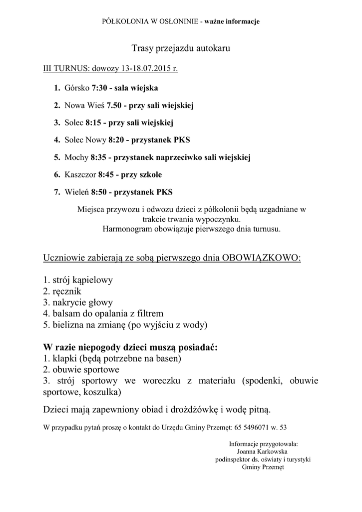 PÓŁKOLONIA W OSŁONINIE - ważne informacje Trasy przejazdu autokaru III TURNUS: dowozy 13-18.07.2015 r. 1. Górsko 7:30 - sala wiejska 2. Nowa Wieś 7.50 - przy sali wiejskiej 3. Solec 8:15 - przy sali wiejskiej 4. Solec Nowy 8:20 - przystanek PKS 5. Mochy 8:35 - przystanek naprzeciwko sali wiejskiej 6. Kaszczor 8:45 - przy szkole 7. Wieleń 8:50 - przystanek PKS Miejsca przywozu i odwozu dzieci z półkolonii będą uzgadniane w trakcie trwania wypoczynku. Harmonogram obowiązuje pierwszego dnia turnusu. Uczniowie zabierają ze sobą pierwszego dnia OBOWIĄZKOWO: 1. strój kąpielowy 2. ręcznik 3. nakrycie głowy 4. balsam do opalania z filtrem 5. bielizna na zmianę (po wyjściu z wody) W razie niepogody dzieci muszą posiadać: 1. klapki (będą potrzebne na basen) 2. obuwie sportowe 3. strój sportowy we woreczku z materiału (spodenki, obuwie sportowe, koszulka) Dzieci mają zapewniony obiad i drożdżówkę i wodę pitną. W przypadku pytań proszę o kontakt do Urzędu Gminy Przemęt: 65 5496071 w. 53 Informacje przygotowała: Joanna Karkowska podinspektor ds. oświaty i turystyki Gminy Przemęt