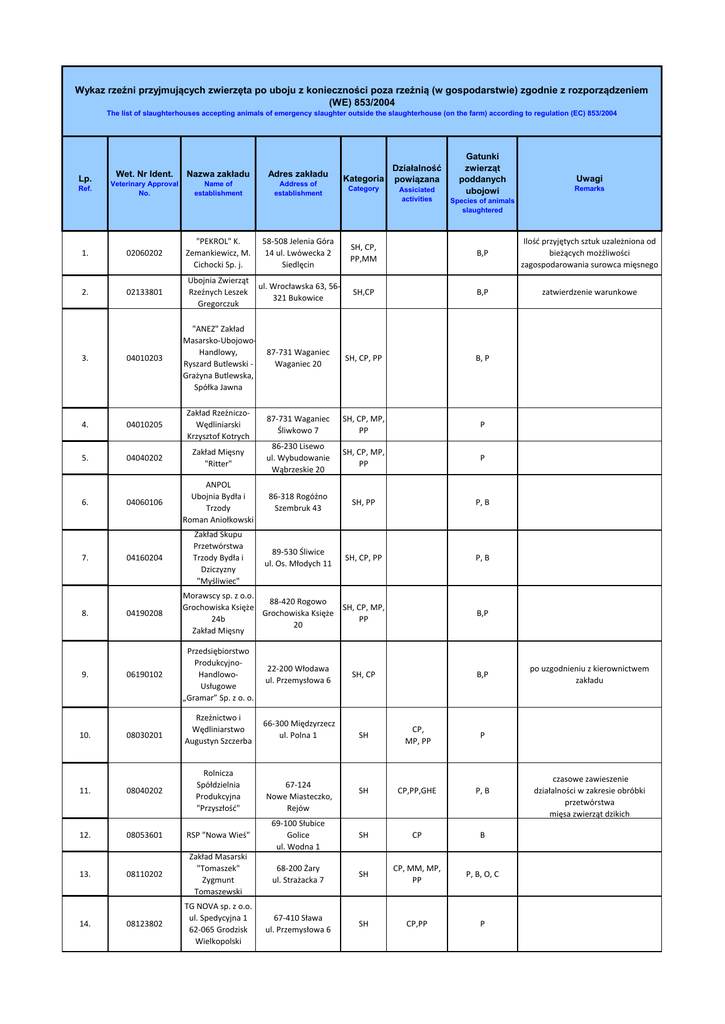 Wykaz rzeźni przyjmujących zwierzęta po uboju z konieczności poza rzeźnią (w gospodarstwie) zgodnie z rozporządzeniem (WE) 853/2004 The list of slaughterhouses accepting animals of emergency slaughter outside the slaughterhouse (on the farm) according to regulation (EC) 853/2004 Lp. Ref. Wet. Nr Ident. Nazwa zakładu Adres zakładu Veterinary Approval No. Name of establishment Address of establishment Działalność Kategoria powiązana Category Assiciated activities Gatunki zwierząt poddanych ubojowi Uwagi Remarks Species of animals slaughtered 1. 02060202 "PEKROL" K. Zemankiewicz, M. Cichocki Sp. j. 58-508 Jelenia Góra 14 ul. Lwówecka 2 Siedlęcin SH, CP, PP,MM B,P Ilość przyjętych sztuk uzależniona od bieżących możźliwości zagospodarowania surowca mięsnego 2. 02133801 Ubojnia Zwierząt Rzeźnych Leszek Gregorczuk ul. Wrocławska 63, 56321 Bukowice SH,CP B,P zatwierdzenie warunkowe 3. 04010203 "ANEZ" Zakład Masarsko-UbojowoHandlowy, Ryszard Butlewski Grażyna Butlewska, Spółka Jawna 87-731 Waganiec Waganiec 20 SH, CP, PP B, P 4. 04010205 Zakład RzeźniczoWędliniarski Krzysztof Kotrych 87-731 Waganiec Śliwkowo 7 SH, CP, MP, PP P 5. 04040202 Zakład Mięsny "Ritter" 86-230 Lisewo ul. Wybudowanie Wąbrzeskie 20 SH, CP, MP, PP P 6. 04060106 ANPOL Ubojnia Bydła i Trzody Roman Aniołkowski 86-318 Rogóźno Szembruk 43 SH, PP P, B 7. 04160204 Zakład Skupu Przetwórstwa Trzody Bydła i Dziczyzny "Myśliwiec" 89-530 Śliwice ul. Os. Młodych 11 SH, CP, PP P, B 8. 04190208 Morawscy sp. z o.o. 88-420 Rogowo Grochowiska Księże SH, CP, MP, Grochowiska Księże 24b PP 20 Zakład Mięsny B,P 9. 06190102 Przedsiębiorstwo ProdukcyjnoHandlowoUsługowe „Gramar” Sp. z o. o. 22-200 Włodawa ul. Przemysłowa 6 B,P 10. 08030201 Rzeźnictwo i Wędliniarstwo Augustyn Szczerba 66-300 Międzyrzecz ul. Polna 1 SH, CP SH CP, MP, PP P SH CP,PP,GHE P, B 11. 08040202 Rolnicza Spółdzielnia Produkcyjna "Przyszłość" 12. 08053601 RSP "Nowa Wieś" 69-100 Słubice Golice ul. Wodna 1 SH CP B 08110202 Zakład Masarski "Tomaszek" Zygmunt Tomaszewski 68-200 Żary ul. Strażacka 7 SH CP, MM, MP, PP P, B, O, C 08123802 TG NOVA sp. z o.o. ul. Spedycyjna 1 62-065 Grodzisk Wielkopolski 67-410 Sława ul. Przemysłowa 6 SH CP,PP P 13. 14. 67-124 Nowe Miasteczko, Rejów po uzgodnieniu z kierownictwem zakładu czasowe zawieszenie działalności w zakresie obróbki przetwórstwa mięsa zwierząt dzikich 15. 10010202 16. 10010203 17. 10210209 18. 10070201 19. 10070210 20. 10103827 RzeźnictwoDobrzelów 4, Wędliniarstwo 97 - 400 Bełchatów Dominik Marczak F.H.P.U. "Marczak" ul. Daleka 59, s.c. 97 - 400 Bełchatów ZAKŁAD PRZETWÓRSTWA 95-047 Jeżów ul. MIĘSNEGO Sobiewskiego 15 "RZEŹNIK" Przemysław Paszkowski ZPM Grzegorz 26-332 śławno Nowakowski Dąbrowa 6 ZUH 26-300 Opoczno "Wojciechowski" Sobawiny 7E Zakład Mięsny 97-310 Raków Duży "Raków" Sp.j. Raków Duzy, ul. S. Lemański, D. Główna 2 Kiełbasa SH, CP, PP P SH, CP, PP P CP, SH, PP P, B SH, CP, MP, PP SH, CP, MP, PP P mp, st, raf B, O mp, st, raf SH, CP P,B 10110204 Ubojnia Zwierząt Rzeźnych i Rozbiór " KARMAT" Andrzej Krajewski Praga 83, 99-200 Poddębice SHCP B 22. 10123801 Ubojnia Zwierząt "BOGACZ" G. Piszczała K. Bogacz Spółka Jawna 97-500 Radomsko Dziepółć 31 SH, CP B, P 23. 10123803 Zakłady Mięsne "BRAT-POL" Sp. z o.o. 97-525 Wielgomłyny Wólka Włościańska 5 SH, CP, MSM B, P SH P SH B SH P,B SH,CP B,P,O,C SH,CP B,P,O,C SH, CP, PP B st SH, CP, PP, MP P mp, bl,, raf, st 21. 24. 10133601 25. 10140108 26. 10180103 Zakład DoświadczalnyRoss ocha Sp. z o.o. 96-200 Rawa Stacja Kontroli Mazowiecka, Użytkowości Rossocha 1 Rzeźnej Trzody Chlewnej Jan Maciejewski 98-215 Goszczanów , Ubojnia WIKTOR Stojanów 20 Ubojnia Zwierząt Rzeźnych Skup i 98-405 Galewice, ul. Sprzedach Eksport- M. Konopnickiej 48 Import 10153801 Skup Żywca Ubój i Sprzedaż Mięsa Zbigniew Frączkiewicz 28. 10153802 "KOLARY" s.c. Waldemar Kolary, Justyna Markus 29. 10163801 Ubojnia i Hurtownia Mięsa 30. 10160235 F.P.H. "Karczewski" 31. 10170202 Gminna Spółdzielnia „Samopomoc Chłopska” 98-300 Wieluń ul. Wojska Polskiego 65 SH, CP,PP P,B 32. 10093809 Ubojnia Zwierząt Rzeźnych Agnieszka Mielczarek 98-330 Pajęczno, Ładzin 73 SH, CP P,B 33. 10200123 "Kryszpol" Sp. J. B.M.S.Krysztofiak Zakład Mięsny Ignacew Podleśny 1, 95-045 Parzęczew SH P,B 34. 12010105 Skup i Ubój, Józef Matlęga SH, PP P, B, O, C 35. 12050101 Konrad Krupczak "Dankon" SH B, O, C 27. 96-115 Nowy Kawęczyn Suliszew 61 96-127 Lipce Reymontowskie, Ul. Wiosenna 28 97-221 Rokiciny Łaznowska Wola ul. Południowa 120 97-225 Ujazd Łominy 12 32-724 Lipnica Murowana, Lipnica Dolna 203 38-307 Sękowa, Ropica Górna działka nr 417/6 36. 12070201 37. 12090201 38. 12103801 39. 12103806 40. 12110201 41. 12130211 42. 12160103 43. 12180103 Przedsiębiorstwo Wielobranżowe "Laskopol" Halina Dudek, Roman Dudek Spółka jawna Wędzonka Sp. z o.o. Spółka Komandytowa Firma HandlowoUsługowa "MIPOL" Sp. j. P. Mikulec, M. J. B. Plata Parkur Spółka Z Ograniczoną Odpowiedzialności ą P.P.H.U. BIELA Stanisław Biela Zakład Przetwórtwa Mięsnego Ubojnia Stanisław Krawczyk Ubojnia Zwierząt Antoni Jurkowski 33-318 Gródek n/Dunajcem Jelna 2 ,,Adam BąkWieprz" Sp. z o.o. 34-600 Limanowa ul. Tarnowska 8C SH, CP, MM, MP, PP B, P 32-400 Myślenice ul. Słowackiego 100 SH, CP, PP B, P 33-340 Stary Sącz Moszczenica Wyzna 72 SH, CP B 33-383 Tylicz Mochnaczka Wyżna 47 SH, CP B,S 34-407 Ciche Stare Bystre 370a SH, CP B, P, O 32-600 Oświęcim Poręba Wielka ul. Gaj 8 SH, CP, PP, MP P 32-840 Zakliczyn ul. Malczewskiego 31 SH, CP P 34-122 Wieprz 193b SH, PP P, B, O, C 06-450 Glinojeck ul. Płocka 26 SH P, B 44. 14020102 Zakład Mięsny Strzegowo Sp. J. Mirosław Płoski Oddział w Glinojecku Skup i Ubój Zwierząt Rzeźnych 45. 14073801 STEK-POL Sp. z o.o. 26-930 Garbatka I Oddział w Letnisko Garbatce Letnisko ul. Przemysłowa 3/5 SH CP P 46. 14113802 Ubojnia Zwierząt Sławomir i Ja