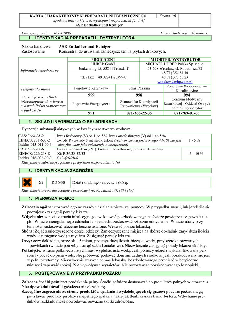 KARTA CHARAKTERYSTYKI PREPARATU NIEBEZPIECZNEGO zgodna z ustawą [1] oraz wymogami rozporządzeń [2, 3, 4] ASR Entkalker und Reiniger Data sprządzenia 16.08.2006 r. Strona 1/6 Data aktualizacji Wydanie 1. 1. IDENTYFIKACJA PREPARATU I DYSTRYBUTORA Nazwa handlowa Zastosowanie ASR Entkalker und Reiniger Koncentrat do usuwania zanieczyszczeń na płytach drukowych. Informacje teleadresowe Telefony alarmowe informacje o ośrodkach toksykologicznych w innych miastach Polski zamieszczono w punkcie 16 PRODUCENT HUBER GmbH Junkersring 15; 53844 Troisdorf IMPORTER/DYSTRYBUTOR MICHAEL HUBER Polska Sp. z o. o. 53-608 Wrocław, ul. Robotnicza 72 48(71) 354 81 10 tel. / fax: + 49 02241-23499-0 48(71) 373 50 23 [email protected] Pogotowie WodociągowoPogotowie Ratunkowe StraŜ PoŜarna Kanalizacyjne 999 998 Pogotowie Energetyczne Stanowisko Koordynacji Ratownictwa (Wrocław) 991 071-368-22-36 994 Centrum Medycyny Ratunkowej - Oddział Ostrych Zatruć - Dyspozytor (Wrocław) 071-789-01-65 2. SKŁAD I INFORMACJA O SKŁADNIKACH Dyspersja substancji aktywnych w kwaśnym roztworze wodnym. CAS: 7664-38-2 kwas fosforowy (V) od 1 do 5 %; kwas ortofosforowy (V) od 1 do 5 % EINECS: 231-633-2 zwroty R / zwroty S nie są określone (roztwór kwasu fosforowego <10 % nie jest Indeks: 015-011-00-6 klasyfikowany jako substancja niebezpieczna) CAS: 5329-14-6 kwas amidosiarkowy(VI); kwas amidosulfonowy; kwas sulfamidowy EINECS: 226-218-8 Xi; R 36/38-52/53 Indeks: 016-026-00-0 S (2-)26-28-61 Klasyfikacja substancji zgodnie z przepisami rozporządzenia [6] 1-5% 5 – 10 % 3. IDENTYFIKACJA ZAGROśEŃ Xi R 36/38 Działa draŜniąco na oczy i skórę. Klasyfikacja preparatu zgodnie z przepisami rozporządzeń [7], [8] i [19] 4. PIERWSZA POMOC Zalecenia ogólne: stosować ogólne zasady udzielania pierwszej pomocy. W przypadku awarii, lub jeŜeli źle się poczujesz - zasięgnij porady lekarza. Wdychanie: w razie zatrucia inhalacyjnego ewakuować poszkodowanego na świeŜe powietrze i zapewnić ciepło. W razie nieregularnego oddechu lub bezdechu zastosować sztuczne oddychanie. W razie utraty przytomności zastosować ułoŜenie boczne ustalone. Wezwać pomoc lekarską. Skóra: Zdjąć zanieczyszczone części odzieŜy. Zanieczyszczone miejsca na skórze dokładnie zmyć duŜą ilością wody, a następnie wodą z mydłem. Zasięgnąć porady lekarza. Oczy: oczy dokładnie, przez ok. 15 minut, przemyć duŜą ilością bieŜącej wody, przy szeroko rozwartych powiekach (w razie potrzeby usunąć szkła kontaktowe). Niezwłocznie zasięgnąć porady lekarza okulisty. Połknięcie: w razie połknięcia natychmiast wypłukać usta wodą. Jeśli pomocy udziela wykwalifikowany personel - podać do picia wodę. Nie próbować podawać doustnie Ŝadnych środków, jeśli poszkodowany nie jest w pełni przytomny. Niezwłocznie wezwać pomoc lekarską. Poszkodowanego przenieść w bezpieczne miejsce i zapewnić spokój. Nie wywoływać wymiotów. Nie pozostawiać poszkodowanego bez opieki. 5. POSTĘPOWANIE W PRZYPADKU POśARU Zalecane środki gaśnicze: produkt nie palny. Środki gaśnicze dostosować do produktów palnych w otoczeniu. Nieodpowiednie środki gaśnicze: nie określa się. Szczególne zagroŜenia ze strony produktów spalania i wydzielających się gazów: podczas poŜaru mogą powstawać produkty pirolizy i niepełnego spalania, takie jak tlenki siarki i tlenki fosforu. Wdychanie produktów rozkładu moŜe powodować powaŜne skutki zdrowotne. KARTA CHARAKTERYSTYKI PREPARATU NIEBEZPIECZNEGO zgodna z ustawą [1] oraz wymogami rozporządzeń [2, 3, 4] ASR Entkalker und Reiniger Strona 2/6 Specjalne wyposaŜenie ochronne straŜaków: wyposaŜenie straŜaków dostosować do lokalnych warunków akcji gaśniczej. Zaleca się pełne wyposaŜenie bojowe z aparatami oddechowymi. Inne informacje: sąsiednie pojemniki chłodzić wodą. 6. POSTĘPOWANIE W PRZYPADKU NIEZAMIERZONEGO UWOLNIENIA DO ŚRODOWISKA Indywidualne środki ostroŜności: Szczegółowe informacje zamieszczone są w punkcie 7 i 8. W przypadku uwolnienia w pomieszczeniu – zapewnić przewietrzanie pomieszczeń. Nie wdychać aerozoli. Unikać zanieczyszczenia oczu i skóry. UŜywać środków ochrony osobistej. UniemoŜliwić dostęp osób postronnych. Środki ostroŜności w zakresie ochrony środowiska: Nie dopuszczać do zanieczyszczania wód powierzchniowych (gruntowych) oraz gruntu. Zapobiegać przedostaniu się zanieczyszczeń do kanalizacji. W przypadku przedostania się do rzek, przewodów kanalizacyjnych lub wodociągowych, powiadomić odpowiednie władze (Inspekcja Ochrony Środowiska, Państwowa StraŜ PoŜarna, Przedsiębiorstwo Wodno - Kanalizacyjne). Metody oczyszczania/usuwania: W przypadku duŜego wycieku zatamować wypływ cieczy i przepompować ją do zamykanego, oznakowanego pojemnika, w celu dalszego bezpiecznego usunięcia. Pozostałości lub niewielką ilość rozlanej cieczy absorbować odpornym na kwasy materiałem chłonnym np. piaskiem, wermikulitem, ziemią okrzemkową. Zebrać sorbent - umieścić w zamykanym i oznakowanym pojemniku w celu dalszego bezpiecznego usunięcia. Zanieczyszczony grunt zebrać i umieścić w oznakowanym pojemniku. Postępowanie z odpadami - pkt 13. Pozostałości na powierzchni utwardzonej, po dokładnym zebraniu sorbentu, zmyć wodą z detergentem. 7. POSTĘPOWANIE Z SUBSTANCJĄ I JEJ MAGAZYNOWANIE Postępowanie z preparatem: Przestrzegać ogólnych zasad bezpieczeństwa i higieny pracy [22]. Otwierać pojemnik z preparatem zachowując ostroŜność. Podczas pracy nie jeść i nie pić. Nie wdychać aerozoli. Unikać kontaktu z oczami i ze skórą. Zapobiegać tworzeniu się aerozolu. Składniki preparatu przenikają przez skórę i błony śluzowe. Preparat nie jest palny. W kontakcie z metalami wydziela wodór tworzący z powietrzem mieszaniny wybuchowe - przestrzegać wymagań rozporządzenia [23]. UŜywać środków ochrony osobistej wymienionych w punkcie 8. Magazynowanie: Zabezpieczyć przed dostępe
