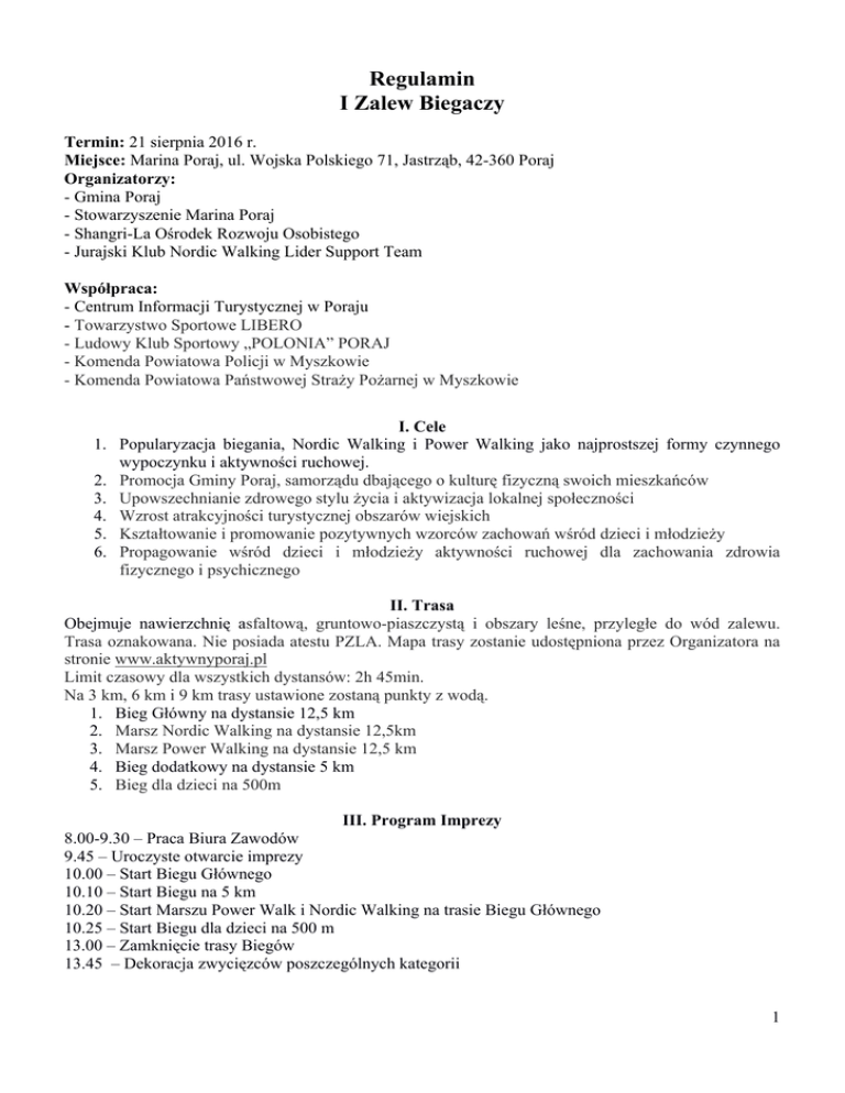 Regulamin I Zalew Biegaczy Termin: 21 sierpnia 2016 r. Miejsce: Marina Poraj, ul. Wojska Polskiego 71, Jastrząb, 42-360 Poraj Organizatorzy: - Gmina Poraj - Stowarzyszenie Marina Poraj - Shangri-La Ośrodek Rozwoju Osobistego - Jurajski Klub Nordic Walking Lider Support Team Współpraca: - Centrum Informacji Turystycznej w Poraju - Towarzystwo Sportowe LIBERO - Ludowy Klub Sportowy „POLONIA” PORAJ - Komenda Powiatowa Policji w Myszkowie - Komenda Powiatowa Państwowej Straży Pożarnej w Myszkowie I. Cele 1. Popularyzacja biegania, Nordic Walking i Power Walking jako najprostszej formy czynnego wypoczynku i aktywności ruchowej. 2. Promocja Gminy Poraj, samorządu dbającego o kulturę fizyczną swoich mieszkańców 3. Upowszechnianie zdrowego stylu życia i aktywizacja lokalnej społeczności 4. Wzrost atrakcyjności turystycznej obszarów wiejskich 5. Kształtowanie i promowanie pozytywnych wzorców zachowań wśród dzieci i młodzieży 6. Propagowanie wśród dzieci i młodzieży aktywności ruchowej dla zachowania zdrowia fizycznego i psychicznego II. Trasa Obejmuje nawierzchnię asfaltową, gruntowo-piaszczystą i obszary leśne, przyległe do wód zalewu. Trasa oznakowana. Nie posiada atestu PZLA. Mapa trasy zostanie udostępniona przez Organizatora na stronie www.aktywnyporaj.pl Limit czasowy dla wszystkich dystansów: 2h 45min. Na 3 km, 6 km i 9 km trasy ustawione zostaną punkty z wodą. 1. Bieg Główny na dystansie 12,5 km 2. Marsz Nordic Walking na dystansie 12,5km 3. Marsz Power Walking na dystansie 12,5 km 4. Bieg dodatkowy na dystansie 5 km 5. Bieg dla dzieci na 500m III. Program Imprezy 8.00-9.30 – Praca Biura Zawodów 9.45 – Uroczyste otwarcie imprezy 10.00 – Start Biegu Głównego 10.10 – Start Biegu na 5 km 10.20 – Start Marszu Power Walk i Nordic Walking na trasie Biegu Głównego 10.25 – Start Biegu dla dzieci na 500 m 13.00 – Zamknięcie trasy Biegów 13.45 – Dekoracja zwycięzców poszczególnych kategorii 1 IV. Uczestnictwo 1. Bieg jest otwarty dla wszystkich zainteresowanych, zarówno osób zrzeszonych w klubach sportowych, jak i amatorów. Limit Uczestników wynosi 400 osób. 2. Zawodnicy niepełnoletni muszą posiadać zgodę prawnych opiekunów na uczestnictwo w Biegu (podpisanie oświadczenia w Biurze Zawodów przez rodzica lub opiekuna prawnego po przedstawieniu dokumentu tożsamości). 3. W Biegu na 500m udział mogą brać dzieci w wieku przedszkolnym oraz dzieci z klas 1-3 Szkoły Podstawowej. 4. Każdy zawodnik startuje wyłącznie na własną odpowiedzialność, co potwierdza złożeniem podpisu pod oświadczeniem o zdolności do udziału w Biegu. Organizator nie ubezpiecza uczestników. 5. Wszyscy startujący zawodnicy muszą zostać zweryfikowani w Biurze Zawodów. 6. Podczas weryfikacji zawodnicy muszą okazać dokument tożsamości ze zdjęciem. 7. Zawody odbędą się bez względu na warunki atmosferyczne, z zastrzeżeniem sytuacji zagrażającym bezpieczeństwu. 8. Wyniki końcowe dostępne będą po zakończeniu imprezy na stronie http://wynikionline.pl/ 9. Zawodnicy wyrażają zgodę na przetwarzanie ich danych osobowych dla potrzeb wewnętrznych Oganizatora imprezy oraz na wykorzystanie ich wizerunku w materiałach informacyjnych i reklamowych. 10. W ramach pakietu startowego Uczestnicy otrzymują m.in. numer startowy wraz z agrafkami, poczęstunek po biegu, wodę mineralną na trasie i po biegu. 11. Uczestnicy, którzy przy dokonywaniu zgłoszenia zadeklarują chęć posiadania oficjalnej koszulki technicznej Biegu uiszczą wyższą opłatę startową, a także zostaną zweryfikowani w Biurze Zawodów otrzymają koszulkę techniczną. Rozmiar koszulki należy wybrać w formularzu zgłoszeniowym. Uwaga! Możliwość otrzymania koszulki technicznej po spełnieniu powyższych warunków istnieje tylko dla osób, którzy dokonają zgłoszenia do Biegu do dnia 12 sierpnia 2016 r. Po tej dacie nie będzie można dokonywać zgłoszeń do Biegu z opcją otrzymania koszulki technicznej. V. Pomiar czasu Prowadzony będzie elektroniczny pomiar czasu z wykorzystaniem chipów umieszczonych w numerze startowym. Oficjalnym czasem biegów jest czas BRUTTO. Numer startowy należy umieścić w widocznym miejscu na klatce piersiowej. Numer startowy nie może być zakryty ani zasłonięty, w przeciwnym wypadku Organizator nie gwarantuje prawidłowości pomiaru czasu. Wyniki nieoficjalne obowiązują przez 72 godziny od publikacji w tym czasie można składać reklamacje oraz wnosić o korektę danych. VI. Zgłoszenia i Opłaty 1. Zgłoszenia przyjmowane są poprzez wypełnienie formularza zgłoszeniowego dostępnego na stronie www.aktywnyporaj.pl do dnia 12 sierpnia 2016 r. lub w dniach 20-21 sierpnia 2016 r. w Biurze Zawodów. W razie wątpliwości prosimy o kontakt telefoniczny z Organizatorem. 2. Odbiór pakietu startowego będzie możliwy: a) w dniu 20 sierpnia 2016 r. w Centrum Informacji Turystycznej w Poraju, Dworzec PKP w Poraju ul. 3 Maja 1 w godzinach 9:00 – 12:00 b) w dniu 21 sierpnia 2016 r. - Marina Poraj, Jastrząb, ul. Wojska Polskiego 71 w godzinach 8:00 – 9:30. 3. W przypadku przekroczenia 400 zgłoszeń do udziału w Biegu Organizator automatycznie kończy przyjmowanie zgłoszeń. 4. Za zgłoszenie uważa się wypełnienie formularza zgłoszeniowego i uiszczenie opłaty startowej. 5. Każdy z Uczestników Biegu ma obowiązek sprawdzenia przed Biegiem czy jest umieszczony na liście startowej. 6. Dzieci w towarzystwie rodziców lub opiekunów biorą udział w zabawach i wyścigach po 2 uprzednim zarejestrowaniu się w Biurze Zawodów. 7. Wysokość opłaty startowej w Biegu Głównym i Marszu Nordic Walking: Bez koszulki technicznej Z koszulką techniczną Do dnia 21.07.2016 r. 35 zł Do dnia 21.07.2016 r. 45 zł Do dnia 12.08.2016 r. 50 zł Do dnia 12.08.2016 r. 60 zł 20-21.08.2016 60 zł 8. Wysokość opłaty startowej w Biegu na 5 km i Marszu Power Walking Bez koszulki technicznej Z koszulką techniczną Do dnia 21.0