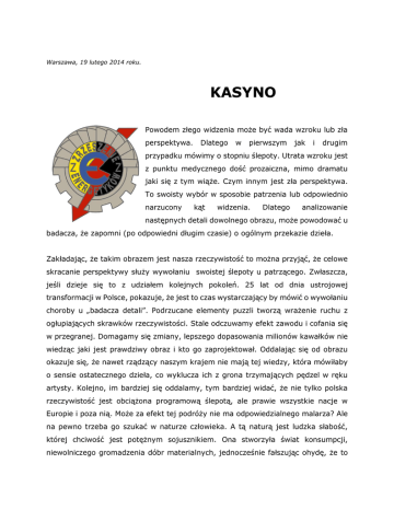 Warszawa, 19 lutego 2014 roku. KASYNO Powodem złego widzenia może być wada wzroku lub zła perspektywa. Dlatego w pierwszym jak i drugim przypadku mówimy o stopniu ślepoty. Utrata wzroku jest z punktu medycznego dość prozaiczna, mimo dramatu jaki się z tym wiąże. Czym innym jest zła perspektywa. To swoisty wybór w sposobie patrzenia lub odpowiednio narzucony kąt widzenia. Dlatego analizowanie następnych detali dowolnego obrazu, może powodować u badacza, że zapomni (po odpowiedni długim czasie) o ogólnym przekazie dzieła. Zakładając, że takim obrazem jest nasza rzeczywistość to można przyjąć, że celowe skracanie perspektywy służy wywołaniu swoistej ślepoty u patrzącego. Zwłaszcza, jeśli dzieje się to z udziałem kolejnych pokoleń. 25 lat od dnia ustrojowej transformacji w Polsce, pokazuje, że jest to czas wystarczający by mówić o wywołaniu choroby u „badacza detali”. Podrzucane elementy puzzli tworzą wrażenie ruchu z ogłupiających skrawków rzeczywistości. Stale odczuwamy efekt zawodu i cofania się w przegranej. Domagamy się zmiany, lepszego dopasowania milionów kawałków nie wiedząc jaki jest prawdziwy obraz i kto go zaprojektował. Oddalając się od obrazu okazuje się, że nawet rządzący naszym krajem nie mają tej wiedzy, która mówiłaby o sensie ostatecznego dzieła, co wyklucza ich z grona trzymających pędzel w ręku artysty. Kolejno, im bardziej się oddalamy, tym bardziej widać, że nie tylko polska rzeczywistość jest obciążona programową ślepotą, ale prawie wszystkie nacje w Europie i poza nią. Może za efekt tej podróży nie ma odpowiedzialnego malarza? Ale na pewno trzeba go szukać w naturze człowieka. A tą naturą jest ludzka słabość, której chciwość jest potężnym sojusznikiem. Ona stworzyła świat konsumpcji, niewolniczego gromadzenia dóbr materialnych, jednocześnie fałszując ohydę, że to istota postępu i rozwoju. Pozwoliło to stworzyć z każdego kraju pułapkę na kształt kasyna, gdzie wszyscy tłoczą się przy ruletce, w nadziei, że ograją krupiera i zaspokoją rządzę posiadania. Niestety, ale nie ograją. System oparty na rachunku prawdopodobieństwa nawet z nielicznymi szczęśliwcami zawsze powoduje, że to kasyno zarabia krocie a nie naiwne groszoroby. W tym otoczeniu doszukując się analogii do systemu państwa, rządzący politycy są tylko w obsłudze kasyna, które pozwala im zarabiać jako cieć pilnujący wejścia do przybytku oraz porządku na sali. Zatem z góry można założyć, że wszyscy są przegrani, poza bankierskim akcjonariatem, który to kasyno zmajstrował. Ślepota obywateli w tym przypadku jest nieodzowna, by grający nie miał świadomości, że w każdej sekundzie swojego życia przebywa w kasynie, i że jest na nie skazany. Będzie więc w znoju pracował do śmierci (do 67 lat) i tracił wszystko (ZUS i OFE): „Bo trzeba doić, strzyc to bydło, a kiedy padnie – zrobić mydło”. Czy jest zatem możliwość cudownego odzyskania wzroku i namalowania własnego obrazu? Na pewno jest. Bo co od człowieka pochodzi, człowiek może zmienić. Prostą receptą jest przecież możliwość zaprzestania gry w kasynie. I w tym miejscu kończy się wypowiedź, którą należy ponownie napisać, godząc się na to, że jest jeszcze inny świat poza kasynem - nie emigrując z własnego kraju.