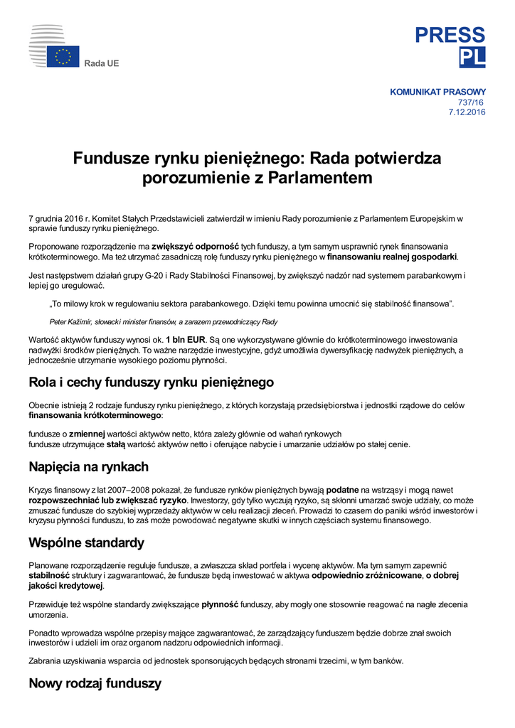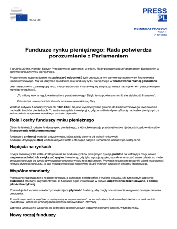 PRESS PL Rada UE KOMUNIKAT PRASOWY 737/16 7.12.2016 Fundusze rynku pieniężnego: Rada potwierdza porozumienie z Parlamentem 7 grudnia 2016 r. Komitet Stałych Przedstawicieli zatwierdził w imieniu Rady porozumienie z Parlamentem Europejskim w sprawie funduszy rynku pieniężnego. Proponowane rozporządzenie ma zwiększyć odporność tych funduszy, a tym samym usprawnić rynek finansowania krótkoterminowego. Ma też utrzymać zasadniczą rolę funduszy rynku pieniężnego w finansowaniu realnej gospodarki. Jest następstwem działań grupy G-20 i Rady Stabilności Finansowej, by zwiększyć nadzór nad systemem parabankowym i lepiej go uregulować. „To milowy krok w regulowaniu sektora parabankowego. Dzięki temu powinna umocnić się stabilność finansowa”. Peter Kažimír, słowacki minister finansów, a zarazem przewodniczący Rady Wartość aktywów funduszy wynosi ok. 1 bln EUR. Są one wykorzystywane głównie do krótkoterminowego inwestowania nadwyżki środków pieniężnych. To ważne narzędzie inwestycyjne, gdyż umożliwia dywersyfikację nadwyżek pieniężnych, a jednocześnie utrzymanie wysokiego poziomu płynności. Rola i cechy funduszy rynku pieniężnego Obecnie istnieją 2 rodzaje funduszy rynku pieniężnego, z których korzystają przedsiębiorstwa i jednostki rządowe do celów finansowania krótkoterminowego: fundusze o zmiennej wartości aktywów netto, która zależy głównie od wahań rynkowych fundusze utrzymujące stałą wartość aktywów netto i oferujące nabycie i umarzanie udziałów po stałej cenie. Napięcia na rynkach Kryzys finansowy z lat 2007–2008 pokazał, że fundusze rynków pieniężnych bywają podatne na wstrząsy i mogą nawet rozpowszechniać lub zwiększać ryzyko. Inwestorzy, gdy tylko wyczują ryzyko, są skłonni umarzać swoje udziały, co może zmuszać fundusze do szybkiej wyprzedaży aktywów w celu realizacji zleceń. Prowadzi to czasem do paniki wśród inwestorów i kryzysu płynności funduszu, to zaś może powodować negatywne skutki w innych częściach systemu finansowego. Wspólne standardy Planowane rozporządzenie reguluje fundusze, a zwłaszcza skład portfela i wycenę aktywów. Ma tym samym zapewnić stabilność struktury i zagwarantować, że fundusze będą inwestować w aktywa odpowiednio zróżnicowane, o dobrej jakości kredytowej. Przewiduje też wspólne standardy zwiększające płynność funduszy, aby mogły one stosownie reagować na nagłe zlecenia umorzenia. Ponadto wprowadza wspólne przepisy mające zagwarantować, że zarządzający funduszem będzie dobrze znał swoich inwestorów i udzieli im oraz organom nadzoru odpowiednich informacji. Zabrania uzyskiwania wsparcia od jednostek sponsorujących będących stronami trzecimi, w tym banków. Nowy rodzaj funduszy Nowym ważnym elementem rozporządzenia jest nowa stała kategoria „funduszy o niskiej zmienności wartości aktywów netto”. To realna alternatywa wobec dotychczasowych funduszy o stałej wartości aktywów netto. Na mocy nowego rozporządzenia fundusze będą podlegać nowym, surowszym wymogom płynnościowym i innym zabezpieczeniom. Fundusze o stałej i niskiej zmienności wartości aktywów opatrzono dodatkowymi zabezpieczeniami, takimi jak opłaty płynnościowe i progi umarzania. Mają one zapobiegać skutkom nagłej paniki wśród inwestorów i je ograniczać. Rozstrzygnięte kwestie Porozumienie z Parlamentem dotyczy zwłaszcza: wymogów płynnościowych i dywersyfikacyjnych aktywów, w które mogą inwestować fundusze, w tym roli długu publicznego przepisów o transparentności klauzuli przeglądowej dla funduszy długu publicznego o stałej wartości aktywów netto. Jeżeli chodzi o płynność, porozumienie zakłada następujące wymogi: dla funduszy o niskiej zmienności i o stałej wartości aktywów netto – minimum 10% inwestycji portfelowych w aktywa o jednodniowym terminie zapadalności i co najmniej 30% w aktywa o tygodniowym terminie zapadalności. W ramach minimalnej płynności wymaganej przy aktywach o tygodniowym terminie zapadalności najwyżej 17,5% może przypadać na instrumenty długu publicznego. dla funduszy o zmiennej wartości aktywów netto – minimum 7,5% inwestycji portfelowych w aktywa o jednodniowym terminie zapadalności i co najmniej 15% w aktywa o tygodniowym terminie zapadalności. W ramach minimalnej płynności wymaganej przy aktywach o tygodniowym terminie zapadalności najwyżej 7,5% może przypadać na instrumenty rynku pieniężnego lub jednostki/udziały innych funduszy rynku pieniężnego. Jeżeli chodzi o dywersyfikację, porozumienie przewiduje: 17,5% limitu na inwestycje w inne fundusze rynku pieniężnego, aby zapobiec inwestycjom cyrkularnym 15% limitu na umowy z przyrzeczeniem odkupu konkretne limity na listy zastawne i depozyty w tej samej instytucji kredytowej wyjątek od dywersyfikacji dla pracowniczych programów oszczędnościowych. Elementem porozumienia jest klauzula przeglądowa, która nakazuje Komisji przedstawić po pięciu latach sprawozdanie z funkcjonowania rozporządzenia. Jeżeli chodzi o fundusze długu publicznego o stałej wartości aktywów netto Komisja po pięciu latach zreferuje wykonalność 80-procentowego progu unijnego długu publicznego. Uwzględni dostępność krótkoterminowych instrumentów unijnego długu publicznego i oceni, czy fundusze o niskiej zmienności wartości aktywów netto byłby właściwą alternatywą dla funduszy nieunijnego długu publicznego o stałej wartości aktywów netto. Co dalej? Wstępne porozumienie z Parlamentem Europejskim nastąpiło 14 listopada 2016 r. Parlament ma zatwierdzić rozporządzenie w pierwszym czytaniu. Następnie przyjmie je Rada. Press office - General Secretariat of the Council Rue de la Loi 175 - B-1048 BRUSSELS - Tel.: +32 (0)2 281 6319 [email protected] - www.consilium.europa.eu/press