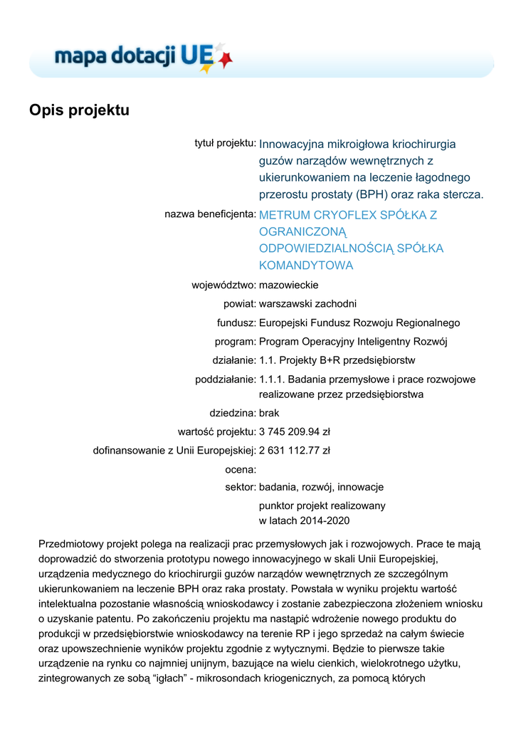 Opis projektu tytuł projektu: Innowacyjna mikroigłowa kriochirurgia guzów narządów wewnętrznych z ukierunkowaniem na leczenie łagodnego przerostu prostaty (BPH) oraz raka stercza. nazwa beneficjenta: METRUM CRYOFLEX SPÓŁKA Z OGRANICZONĄ ODPOWIEDZIALNOŚCIĄ SPÓŁKA KOMANDYTOWA województwo: mazowieckie powiat: warszawski zachodni fundusz: Europejski Fundusz Rozwoju Regionalnego program: Program Operacyjny Inteligentny Rozwój działanie: 1.1. Projekty B+R przedsiębiorstw poddziałanie: 1.1.1. Badania przemysłowe i prace rozwojowe realizowane przez przedsiębiorstwa dziedzina: brak wartość projektu: 3 745 209.94 zł dofinansowanie z Unii Europejskiej: 2 631 112.77 zł ocena: sektor: badania, rozwój, innowacje punktor projekt realizowany w latach 2014-2020 Przedmiotowy projekt polega na realizacji prac przemysłowych jak i rozwojowych. Prace te mają doprowadzić do stworzenia prototypu nowego innowacyjnego w skali Unii Europejskiej, urządzenia medycznego do kriochirurgii guzów narządów wewnętrznych ze szczególnym ukierunkowaniem na leczenie BPH oraz raka prostaty. Powstała w wyniku projektu wartość intelektualna pozostanie własnością wnioskodawcy i zostanie zabezpieczona złożeniem wniosku o uzyskanie patentu. Po zakończeniu projektu ma nastąpić wdrożenie nowego produktu do produkcji w przedsiębiorstwie wnioskodawcy na terenie RP i jego sprzedaż na całym świecie oraz upowszechnienie wyników projektu zgodnie z wytycznymi. Będzie to pierwsze takie urządzenie na rynku co najmniej unijnym, bazujące na wielu cienkich, wielokrotnego użytku, zintegrowanych ze sobą “igłach” - mikrosondach kriogenicznych, za pomocą których realizowana będzie procedura krioablacji guzów narządów wewnętrznych (w szczególności BPH oraz rak prostaty), bezpośrednio poprzez przebicie ich przez skórę oraz okoliczne tkanki pacjenta (mikrosondy mają około kilkanaście centumetrów długości). Urządzenie powstanie przy bliskiej współpracy wybitnych lekarzy i środowisk urologiczno - chirurgicznych z UE, aby zaspokoić oczekiwania chirurgów w zakresie skutecznej terapii łagodnego przerostu prostaty oraz raka prostaty. Wskazany aparat pozwoli na nowoczesną, niskoinwazyjną i skuteczną terapię BPH oraz guzów prostaty przy wielokrotnie niższych kosztach i znacznie mniejszych skutkach ubocznych w stosunku do innych metod alternatywnych. Zastosowana zostanie autorska opatentowana technologia przedsiębiorstwa w zakresie kriochirurgii bazującej na mieszaninie kriogenicznej na podtlenek azotu/dwutlenek węgla. Pomysł na projekt i opracowanie wskazanego urządzenia będącego rezultatem bezpośrednim przedmiotowego projektu jest odpowiedzią na zapytania naszych klientów, którzy byli źródłem inspiracji koncepcji nowego aparatu.