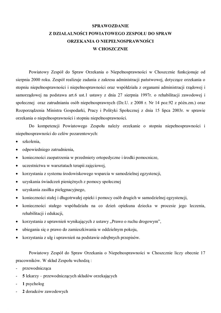 SPRAWOZDANIE Z DZIAŁALNOŚCI POWIATOWEGO ZESPOŁU DO SPRAW ORZEKANIA O NIEPEŁNOSPRAWNOŚCI W CHOSZCZNIE Powiatowy Zespół do Spraw Orzekania o Niepełnosprawności w Choszcznie funkcjonuje od sierpnia 2000 roku. Zespół realizuje zadania z zakresu administracji państwowej, dotyczące orzekania o stopniu niepełnosprawności i niepełnosprawności oraz współdziała z organami administracji rządowej i samorządowej na podstawa art.6 ust.1 ustawy z dnia 27 sierpnia 1997r. o rehabilitacji zawodowej i społecznej oraz zatrudnianiu osób niepełnosprawnych (Dz.U. z 2008 r. Nr 14 poz.92 z późn.zm.) oraz Rozporządzenia Ministra Gospodarki, Pracy i Polityki Społecznej z dnia 15 lipca 2003r. w sprawie orzekania o niepełnosprawności i stopniu niepełnosprawności. Do kompetencji Powiatowego Zespołu należy orzekanie o stopniu niepełnosprawności i niepełnosprawności do celów pozarentowych: • szkolenia, • odpowiedniego zatrudnienia, • konieczności zaopatrzenia w przedmioty ortopedyczne i środki pomocnicze, • uczestnictwa w warsztatach terapii zajęciowej, • korzystania z systemu środowiskowego wsparcia w samodzielnej egzystencji, • uzyskania świadczeń pieniężnych z pomocy społecznej • uzyskania zasiłku pielęgnacyjnego, • konieczności stałej i długotrwałej opieki i pomocy osób drugich w samodzielnej egzystencji, • konieczności stałego współudziału na co dzień opiekuna dziecka w procesie jego leczenia, rehabilitacji i edukacji, • korzystania z uprawnień wynikających z ustawy „Prawo o ruchu drogowym”, • ubiegania się o prawo do zamieszkiwania w oddzielnym pokoju, • korzystania z ulg i uprawnień na podstawie odrębnych przepisów. Powiatowy Zespół do Spraw Orzekania o Niepełnosprawności w Choszcznie liczy obecnie 17 pracowników. W skład Zespołu wchodzą : - przewodnicząca - 5 lekarzy – przewodniczących składów orzekających - 1 psycholog - 2 doradców zawodowych - 4 pracowników socjalnych - 1 pedagog - referent administracyjny Członkowie Zespołu byli poddani obowiązkowym szkoleniom i egzaminom. Wszyscy pracownicy zdali egzamin pomyślnie i uzyskali niezbędne zaświadczenia do orzekania o niepełnosprawności i stopniu niepełnosprawności. 2008r. do 30.09.2009r. Ilość złożonych wniosków -ogółem: 1131 802 w tym dzieci 174 102 dorośli 957 700 Ilość wydanych orzeczeń- ogółem 969 806 w tym dzieci 149 dorośli 820 110 802 Ogólna sytuacja Powiatowego Zespołu do Spraw Orzekania o Niepełnosprawności Do 15.10.2009r. odbyło się 93 posiedzeń. Wydano 307 legitymacji osobom niepełnosprawnym. Do Zespołu wpłynęło w b.r. 46 odwołań od wydanych przez Zespół orzeczeń. Większość odwołań rozpatrzonych przez Wojewódzki Zespół do Spraw Orzekania o Niepełnosprawności w Szczecinie lub przez Sąd Pracy i Ubezpieczeń Społecznych, zostało utrzymanych w mocy. W 2009r. budżet Zespołu wynosi 72 000 zł. W związku z małą ilością środków czynione są oszczędności : - przewodniczący pracując w składzie orzekającym wykonuje w ramach etatu pracę pracownika socjalnego, - większa część przesyłek pocztowych wysyłana jest listem zwykłym, - nie są wypłacane wynagrodzenia za orzekanie w sprawie odwołań i odroczeń oraz za oceny dokumentów, - nie wypłaca się delegacji osobom dojeżdżającym na posiedzenia składów. Wynika stąd, że w pewnej części praca zespołu jest pracą społeczną. Wszystkie inne czynności związane z pracą Zespołu wymagają dużych oszczędności. Działając w sprawach zgłaszanych przez obywateli mamy do dyspozycji dokumentację medyczną i inną dotyczącą istotnych spraw ludzkich objętych tajemnicą (dane wrażliwe), które wymagają odpowiedniego zabezpieczenia, czyli przechowywania w szafach zamkniętych i odpowiednio archiwizowanych. Zdarzają się wnioski o ustalenie stopnia niepełnosprawności osób, które nie mogą ze względu na stan zdrowia przybyć osobiście. Z tego powodu konieczne jest wydelegowanie składu orzekającego do miejsca zamieszkania osoby. Znaczną część budżetu pochłaniają opłaty pocztowe, nieuniknione w działalności Zespołu (każda przesyłka powinna być wysyłana za potwierdzeniem odbioru). Ilość wydanych orzeczeń z roku na rok wzrasta. Wydatki na umowy zlecenia uzależnione są od ilości napływających wniosków i wydawanych orzeczeń. Ze względu na dużą ilość napływających wniosków i zgodnie z wymaganiami standardowymi konieczne jest zabezpieczenie etatowe pracy Zespołu, jak również konieczne są wydatki na papier, tusze, segregatory, teczki, standardowe druki. Zatrudnienie od początku powołania Zespołu nie uległo zmianie, mimo tego, iż ilość wydanych orzeczeń wzrosła dwukrotnie. Niezbędne wydatki daleko przekraczają możliwości finansowe Zespołu. Otrzymane środki zabezpieczają tylko 40% potrzeb.