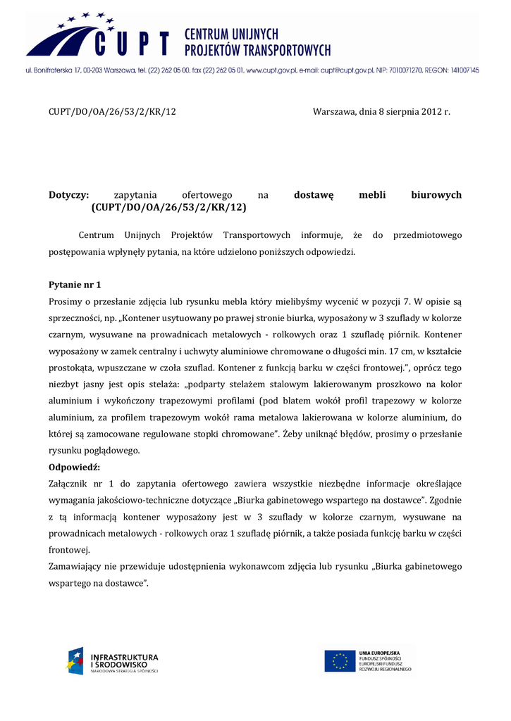 CUPT/DO/OA/26/53/2/KR/12 Dotyczy: Warszawa, dnia 8 sierpnia 2012 r. zapytania ofertowego (CUPT/DO/OA/26/53/2/KR/12) Centrum Unijnych Projektów na Transportowych dostawę informuje, mebli że do biurowych przedmiotowego postępowania wpłynęły pytania, na które udzielono poniższych odpowiedzi. Pytanie nr 1 Prosimy o przesłanie zdjęcia lub rysunku mebla który mielibyśmy wycenić w pozycji 7. W opisie są sprzeczności, np. „Kontener usytuowany po prawej stronie biurka, wyposażony w 3 szuflady w kolorze czarnym, wysuwane na prowadnicach metalowych - rolkowych oraz 1 szufladę piórnik. Kontener wyposażony w zamek centralny i uchwyty aluminiowe chromowane o długości min. 17 cm, w kształcie prostokąta, wpuszczane w czoła szuflad. Kontener z funkcją barku w części frontowej.”, oprócz tego niezbyt jasny jest opis stelaża: „podparty stelażem stalowym lakierowanym proszkowo na kolor aluminium i wykończony trapezowymi profilami (pod blatem wokół profil trapezowy w kolorze aluminium, za profilem trapezowym wokół rama metalowa lakierowana w kolorze aluminium, do której są zamocowane regulowane stopki chromowane”. Żeby uniknąć błędów, prosimy o przesłanie rysunku poglądowego. Odpowiedź: Załącznik nr 1 do zapytania ofertowego zawiera wszystkie niezbędne informacje określające wymagania jakościowo-techniczne dotyczące „Biurka gabinetowego wspartego na dostawce”. Zgodnie z tą informacją kontener wyposażony jest w 3 szuflady w kolorze czarnym, wysuwane na prowadnicach metalowych - rolkowych oraz 1 szufladę piórnik, a także posiada funkcję barku w części frontowej. Zamawiający nie przewiduje udostępnienia wykonawcom zdjęcia lub rysunku „Biurka gabinetowego wspartego na dostawce”. Pytanie nr 2 Proszę o wyjaśnienie dotyczące stelaża do biurka gabinetowego. Nie rozumiem jak ma wyglądać profil trapezowy za którym jest rama dodatkowo. Może wiedzą państwo, który z producentów posiada taki stelaż, gdyż nam znani dostawcy nie mają takiego modelu w ofercie. Odpowiedź: Załącznik nr 1 do zapytania ofertowego zawiera wszystkie niezbędne informacje określające wymagania jakościowo-techniczne dotyczące „Biurka gabinetowego wspartego na dostawce”. Zgodnie z tą informacją blat biurka powinien być wykonany z płyty wiórowej melaminowanej o grubości min. 12 mm, podparty stelażem stalowym lakierowanym proszkowo na kolor aluminium i wykończony trapezowymi profilami (pod blatem wokół profil trapezowy w kolorze aluminium, za profilem trapezowym wokół rama metalowa lakierowana w kolorze aluminium, do której są zamocowane regulowane stopki chromowane). Pytanie nr 3 Jakie są wymiary kontenera i proszę wyjaśnić pojęcie "funkcja barku w części frontowej". Odpowiedź: Załącznik nr 1 do zapytania ofertowego zawiera wszystkie niezbędne informacje określające wymagania jakościowo-techniczne dotyczące „Biurka gabinetowego wspartego na dostawce”. Zgodnie z tą informacją kontener wyposażony jest w 3 szuflady w kolorze czarnym, wysuwane na prowadnicach metalowych - rolkowych oraz 1 szufladę piórnik, a także posiada funkcję barku w części frontowej biurka (tył kontenera). Zamawiający nie wskazuje wymiarów kontenera, ponieważ musi on być kompatybilny z biurkiem. 2