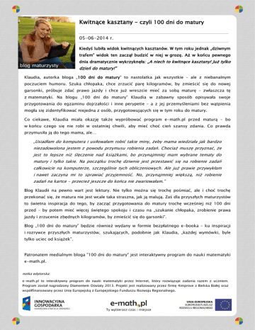 Kwitnące kasztany – czyli 100 dni do matury 05-06-2014 r. Kiedyś lubiła widok kwitnących kasztanów. W tym roku jednak „dziwnym trafem” widok ten zaczął budzić w niej w grozę. Aż w końcu pewnego dnia dramatycznie wykrzyknęła: „A niech to kwitnące kasztany! Już tylko dzień do matury!” Klaudia, autorka bloga „100 dni do matury” to nastolatka jak wszystkie – ale z niebanalnym poczuciem humoru. Szuka chłopaka, chce zrzucić parę kilogramów, by zmieścić się do nowej garsonki, próbuje zdać prawo jazdy i chce już wreszcie mieć za sobą maturę – zwłaszcza tę z matematyki. Na blogu „100 dni do matury” Klaudia w zabawny sposób opisywała swoje przygotowania do egzaminu dojrzałości i inne perypetie – a z jej przemyśleniami bez wątpienia mogła się zidentyfikować niejedna z osób, przygotowujących się w tym roku do matury. Co ciekawe, Klaudia miała okazję także wypróbować program e-math.pl przed maturą – bo w końcu czego się nie robi w ostatniej chwili, aby mieć choć cień szansy zdania. Co prawda przymusiła ją do tego mama, ale… „Usiadłam do komputera i usiłowałam robić takie miny, żeby mama wiedziała jak bardzo niezadowolona jestem z powodu przymusu robienia zadań. Chociaż muszę przyznać, że jest to lepsze niż ślęczenie nad książkami, bo przynajmniej mam wybrane tematy do matury i tylko takie. Na początku trochę dziwnie jest przestawić się na robienie zadań całkowicie na komputerze, szczególnie tych obliczeniowych. Ale już prawie przywykłam i nawet zaczyna mi to sprawiać przyjemność. No, przynajmniej większą, niż robienie zadań na kartce - przecież jeszcze do końca nie zwariowałam.” Blog Klaudii na pewno wart jest lektury. Nie tylko można się trochę pośmiać, ale i choć trochę przekonać się, że matura nie jest wcale taka straszna, jak ją malują. Zaś dla przyszłych maturzystów to świetna inspiracja do tego, by zacząć przygotowania do matury trochę wcześniej niż 100 dni przed – by potem mieć więcej świętego spokoju i czasu na „szukanie chłopaka, zrobienie prawa jazdy i zrzucenie zbędnych kilogramów, by zmieścić się do garsonki”. Blog „100 dni do matury” będzie również wydany w formie bezpłatnego e-booka – ku inspiracji i rozrywce przyszłych maturzystów, szukających, podobnie jak Klaudia, „każdej wymówki, byle tylko uciec od książek”. Patronatem medialnym bloga "100 dni do matury" jest interaktywny program do nauki matematyki e-math.pl. notka edytorska: e-math.pl to interaktywny program do nauki matematyki przez Internet, który rozwiązuje zadania razem z uczniem. Program został nagrodzony Diamentem Oświaty 2013. Projekt jest realizowany przez firmę 4improve z Bielska Białej oraz współfinansowany przez Unię Europejską z Europejskiego Funduszu Rozwoju Regionalnego.