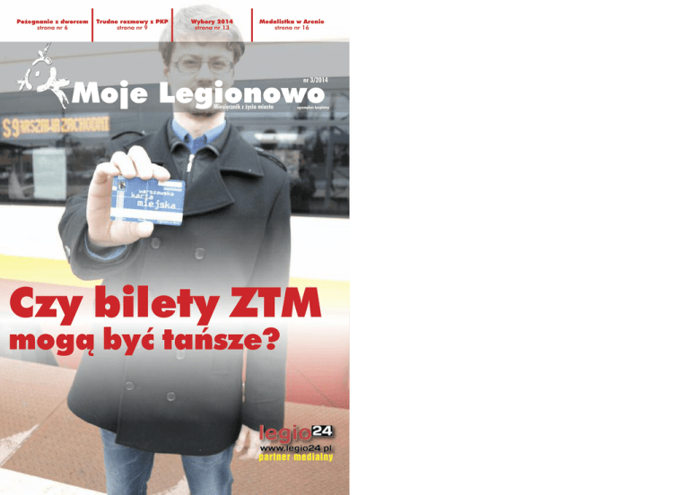 Pożegnanie z dworcem strona nr 6 Trudne rozmowy z PKP strona nr 9 Wybory 2014 strona nr 13 Medalistka w Arenie strona nr 16 nr 3/2014 Miesięcznik z życia miasta egzemplarz bezpłatny Czy bilety ZTM mogą być tańsze? partner medialny Szanowni Państwo, Drodzy Mieszkańcy! Wielkanoc to czas radości ze Zmartwychwstania Pańskiego, odradzania się wiary w siłę Chrystusa, nadziei na lepszą przyszłość. Z okazji zbliżających się Świąt Wielkiej Nocy życzymy, żeby budząca się do życia przyroda tchnęła w Państwa nowe siły do działania i zachęcała do podejmowania różnorodnej aktywności. Niech te dni będą dla Was czasem odpoczynku i życzliwości, wiosennej radości, smacznego jajka, mokrego dyngusa i spotkań w gronie najbliższych. Wesołego Alleluja! Roman Smogorzewski Janusz Klejment Prezydent Miasta Legionowo Przewodniczący Rady Miasta Legionowo Z ostatniej chwili Spotkania z Seniorami Media coraz częściej donoszą o próbach wyłudzenia pieniędzy od osób starszych. Pośpiech, roztargnienie, nadmierna ufność czy pragnienie kontaktu z innymi ludźmi sprawiają, że Seniorzy stają się łatwym łupem dla złodziei i wyłudzaczy. Straż Miejska przygotowała broszurę „Bezpieczny Senior” oraz cykl spotkań na temat niebezpieczeństw czających się na starszych mieszkańców. Oszuści kryją się pod różnymi postaciami – telefonicznie podają się za wnuczka lub krewnego, pukają do drzwi podszywając się pod przedstawiciela administracji osiedla. Straż Miejska organizuje serię spotkań dla legionowskich Seniorów, a najważniejsze informacje na temat zagrożeń, metod oszustów i złodziei zostały zawarte w dedykowanej osobom starszym broszurze. Spotkania odbędą się w 6 miejscach na terenie całego miasta. Oprócz przedstawicieli Straży Miejskiej udział wezmą Policja, przedstawicieli PCK i miejscy radni. O terminach informować będziemy przy pomocy plakatów, zaproszeń, ogłoszeń i strony www. Tamara Mytkowska Mieszkańcy powiedzieli NIE nazwom rond Zakończyły się konsultacje społeczne w sprawie nadania nazw dla dwóch nowych rond w Legionowie. Wypowiedziało się ponad 2 tysiące osób, większość była przeciwna zaproponowanym przez grupy radnych i grupę mieszkańców nazwom. Nazwy zaproponowane przez radnych otrzymały odpowiednio: • dla ronda u zbiegu ulic Sobieskiego i Parkowej: „Jana Pawła II” – 410/18,49% głosów, „Lecha i Marii Kaczyńskich” – 250/11% głosów. Moje Legionowo nr 3/2014 Zdjęcie miesiąca Ostatnie chwile dworca Aż 1557 osób (ponad 70%) nie przychyliło się do żadnej z tych opcji. • dla ronda u zbiegu ulic Cynkowej i Al. Legionów: „Ofiar Katastrofy Smoleńskiej” – 392/17% głosów. Ponad 82% głosujących (1825) wybrało inną opcję. Mieszkańcy mieli możliwość zgłoszenia swoich własnych propozycji. Najpopularniejsze nazwy to odpowiednio: • dla ronda u zbiegu ulic Sobieskiego i Parkowej: „Żołnierzy Wyklętych” – 248 głosów, „Narodowych Sił Zbrojnych” – 102 głosy • dla ronda u zbiegu ulic Cynkowej i Al. Legionów: „Żołnierzy Wyklętych” – 168 głosów, „Narodowych Sił Zbrojnych” – 104 głosy Wśród zgłaszanych nazw pojawiały się związane z postaciami z bajek, sportem i baloniarstwem. Marta Goźlińska n AKTUALNOŚCI Kartka z kalendarza Jacka Szczepańskiego .........................................4 Kultura na szczeblu powiatu ..............................................................5 MIASTO Pożegnanie z dworcem .....................................................................6 Park Zdrowia dla Seniorów ...............................................................7 SPOŁECZEŃSTWO Rekrutacja 2014 ..............................................................................8 WYWIAD Trudne rozmowy z PKP ......................................................................9 TEMAT NUMERU Komunikacja publiczna...................................................................10 MIASTO Ukraiński partner ...........................................................................12 Wybory do Parlamentu Europejskiego 2014 .....................................13 KULTURA Międzynarodowy Dzień Książki ........................................................14 HISTORIA Gabinet pisarza .............................................................................15 SPORT Luiza Złotkowska w Arenie ..............................................................16 FELIETON Żyć z Alzheimerem… Z grupą wsparcia łatwiej .................................17 foto Legio24.pl Prześlij nam swoją fotkę z Legionowa Redaktor Naczelny: Tamara Mytkowska Redakcja: Anna Szczepłek, Michał Kobrzyński, Łukasz Konstantynowicz Sekretarz Redakcji: Juliusz Żebrowski Stale współpracują: Małgorzata Charzyńska -Wróbel, Teresa Panek, Julita Ksionek, Piotr Kawala, Kamil Kalka, Wydziały i Referaty UM Legionowo, MOK, Miejska i Powiatowa Biblioteka Publiczna w Legionowie, Muzeum Historyczne w Legionowie Skład i łamanie: Studio DTP Rubin Nakład: 6000 egzemplarzy Moje Legionowo – Miesięcznik z życia miasta ISSN 2081-741X Wydawca: Urząd Miasta Legionowo Adres wydawcy i redakcji: Urząd Miasta Legionowo, ul. Piłsudskiego 41, 05–120 Legionowo, tel. 22 766 40 77, e-mail: [email protected] Redakcja nie zwraca nie zamówionych tekstów i fotografii oraz zastrzega sobie prawo skracania i redagowania nadesłanych materiałów. Rozpowszechnianie redakcyjnych materiałów publicystycznych bez zgody wydawcy jest zabronione. Redakcja nie ponosi odpowiedzialności za treść zamieszczanych ogłoszeń i reklam. po kilku długich, ponurych miesiącach w końcu nadeszła wiosna, która przyniosła nie tyko słońce i ciepło, ale też wysyp przykrych niespodzianek pozostawianych przez czworonogi na trawnikach. Zatem marzec to także czas ponownej odsłony miejskiego programu walki z psimi kupami. W tym roku nieco ostrzej i dosadniej, gdyż pozytyw