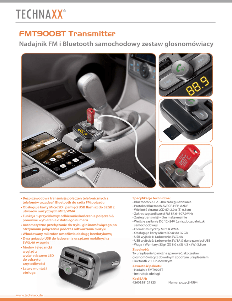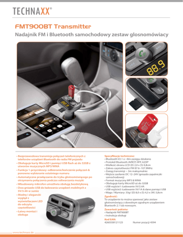 FMT900BT Transmitter Nadajnik FM i Bluetooth samochodowy zestaw glosnomówiacy • Bezprzewodowa transmisja połączeń telefonicznych z telefonów urządzeń Bluetooth do radia FM pojazdu • Obsługuje karty MicroSD i pamięci USB flash aż do 32GB z utworów muzycznych MP3/WMA • Funkcja 1-przyciskowy: odbieranie/kończenie połączeń & ponowne wybieranie ostatniego numeru • Automatyczne przełączanie do trybu głośnomówiącego po otrzymaniu połączenia podczas odtwarzania muzyki • Wbudowany mikrofon umożliwia obsługę bezdotykową • Dwa gniazdo USB do ładowania urządzeń mobilnych z 5V/3.4A w sumie • Modny i elegancki wygląd z wyświetlaczem LED do odczytu częstotliwości • Łatwy montaż i obsługa Specyfikacje techniczne: • Bluetooth V2.1 o ~8m zasięgu działania • Protokół Bluetooth AVRCP, HFP, A2DP • Wielkość ekranu LCD (D) 2,0 x (S) 0,8cm • Zakres częstotliwości FM 87.6–107.9MHz • Zasięg transmisji ~ 3m maksymalnie • Wejście zasilanie DC 12–24V (gniazdo zapalniczki samochodowej) • Format muzyczny MP3 & WMA • Obsługuje karty MicroSD aż do 32GB • USB wyjście1: Ładowanie 5V/2.4A • USB wyjście2: Ładowanie 5V/1A & dane pamięci USB • Waga / Wymiary: 33g/ (D) 8,0 x (S) 4,3 x (W) 3,8cm Zgodność: To urządzenie to można sparować jako zestaw głośnomówiący z dowolnym zgodnym urządzeniem Bluetooth 2.1 lub nowszym. Zawartość pakietu: • Nadajnik FMT900BT • Instrukcja obsługi Kod EAN: 4260358121123 www.technaxx.de Numer pozycji 4594