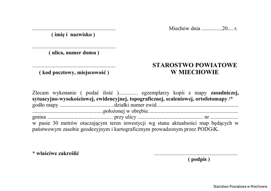 ............................................................. ( imię i nazwisko ) Miechów dnia ...............20.... r. ............................................................. ( ulica, numer domu ) ............................................................. ( kod pocztowy, miejscowość ) STAROSTWO POWIATOWE W MIECHOWIE Zlecam wykonanie ( podać ilość ).............. egzemplarzy kopii z mapy zasadniczej, sytuacyjno-wysokościowej, ewidencyjnej, topograficznej, scaleniowej, ortofotomapy /* godło mapy ........................................działki numer ewid............................................................ ....................................................położonej w obrębie.................................................................. gmina ................................................ przy ulicy ................................................ nr .................... w pasie 30 metrów otaczającym teren inwestycji wg stanu aktualności map będących w państwowym zasobie geodezyjnym i kartograficznym prowadzonym przez PODGiK. * właściwe zakreślić ............................................................. ( podpis ) Starostwo Powiatowe w Miechowie ..................Jan...Kowalski.................... ( imię i nazwisko ) Miechów dnia ...02.04....2010 r. ..................ul. Długa....15..................... ( ulica, numer domu ) WZÓR ............32-200...Miechów..................... ( kod pocztowy, miejscowość ) STAROSTWO POWIATOWE W MIECHOWIE Zlecam wykonanie ( podać ilość )......2...... egzemplarzy kopii z mapy zasadniczej, sytuacyjno-wysokościowej, ewidencyjnej, topograficznej, scaleniowej, ortofotomapy /* godło mapy ...............-.....................działki numer ewid...........52/8............................................ ....................................................położonej w obrębie.........Miechów.......................................... gmina ......Miechów.......................... przy ulicy ...............-.............................. nr ......-.............w pasie 30 metrów otaczającym teren inwestycji wg stanu aktualności map będących w państwowym zasobie geodezyjnym i kartograficznym prowadzonym przez PODGiK. * właściwe zakreślić .....................Jan.....Kowalski............... ( podpis ) Starostwo Powiatowe w Miechowie