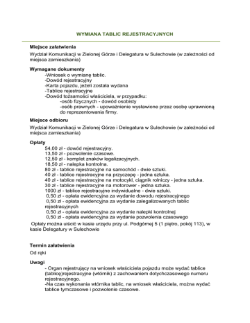 WYMIANA TABLIC REJESTRACYJNYCH Miejsce załatwienia Wydział Komunikacji w Zielonej Górze i Delegatura w Sulechowie (w zależności od miejsca zamieszkania) Wymagane dokumenty -Wniosek o wymianę tablic. -Dowód rejestracyjny -Karta pojazdu, jeżeli została wydana -Tablice rejestracyjne -Dowód tożsamości właściciela, w przypadku: -osób fizycznych - dowód osobisty -osób prawnych - upoważnienie wystawione przez osobę uprawnioną do reprezentowania firmy. Miejsce odbioru Wydział Komunikacji w Zielonej Górze i Delegatura w Sulechowie (w zależności od miejsca zamieszkania) Opłaty 54,00 zł - dowód rejestracyjny. 13,50 zł - pozwolenie czasowe. 12,50 zł - komplet znaków legalizacyjnych. 18,50 zł - nalepka kontrolna. 80 zł - tablice rejestracyjne na samochód - dwie sztuki. 40 zł - tablice rejestracyjne na przyczepę - jedna sztuka. 40 zł - tablice rejestracyjne na motocykl, ciągnik rolniczy - jedna sztuka. 30 zł - tablice rejestracyjne na motorower - jedna sztuka. 1000 zł - tablice rejestracyjne indywidualne - dwie sztuki. 0,50 zł - opłata ewidencyjna za wydanie dowodu rejestracyjnego 0,50 zł - opłata ewidencyjna za wydanie zalegalizowanych tablic rejestracyjnych 0,50 zł - opłata ewidencyjna za wydanie nalepki kontrolnej 0,50 zł - opłata ewidencyjna za wydanie pozwolenia czasowego Opłaty można uiścić w kasie urzędu przy ul. Podgórnej 5 (1 piętro, pokój 113), w kasie Delegatury w Sulechowie Termin załatwienia Od ręki Uwagi - Organ rejestrujący na wniosek właściciela pojazdu może wydać tablice (tablicę)rejestracyjne (wtórnik) z zachowaniem dotychczasowego numeru rejestracyjnego. -Na czas wykonania wtórnika tablic, na wniosek właściciela, można wydać tablice tymczasowe i pozwolenie czasowe. Podstawa prawna - §12 rozporządzenia ministra infrastruktury z dnia 22 lipca 2002 r. w sprawie rejestracji i oznaczania pojazdów (Dz.U. z 2002 r. Nr 133 poz. 1123 ze zmianami) - rozporządzenie ministra infrastruktury z dnia 22 grudnia 2003 r. w sprawie wysokości opłat za wydanie dowodu rejestracyjnego, pozwolenia czasowego, tablic (tablicy) rejestracyjnych pojazdów (Dz.U. z 2003 r. Nr 230, poz 2302 ze zmianami) - art. 75 ust. 2 ustawy z dnia 20 czerwca 1997 r. Prawo o ruchu drogowym (t. j. Dz.U. z 2005 r. Nr 108, poz. 908 ze zmianami) - rozporządzenie Ministra Spraw Wewnętrznych i Administracji z dnia 9 grudnia 2009r. w sprawie opłaty ewidencyjnej (Dz.U. Nr 210, poz. 1626) WNIOSEK Zielona Góra, _________ ________________________ ________________________ (imię i nazwisko) ________________________ (adres właściciela) ________________________ Starosta Zielonogórski ________________________ (nr PESEL lub REGON) Wnoszę o wydanie wtórnika tablic rejestracyjnych z powodu zagubienia/kradzieży/zniszczenia*. 1. rodzaj pojazdu i przeznaczenie ................................................................................. 2. marka, typ, model ….................................................................................................. 3. rok produkcji............................................................................................................... 4. numer identyfikacyjny VIN/nr nadwozia/podwozia.................................................... 5. numer silnika …......................................................................................................... 6. dotychczasowy numer rejestracyjny…....................................................................... 7. numer karty pojazdu…............................................................................................... Do wniosku załączam następujące dokumenty: 1. ……............................................................................................................................ 2. .................................................................................................................................... 3. …................................................................................................................................ 4. …................................................................................................................................ 5. .................................................................................................................................... 6. .................................................................................................................................... 7. .................................................................................................................................... Wnoszę o wydanie tablic rejestracyjnych indywidualnych o następującym wyróżniku: ............................................... ..................................... (podpis właściciela) * - niepotrzebne skreślić
