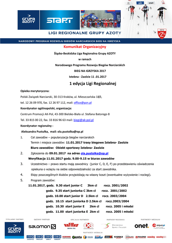 Komunikat Organizacyjny Śląsko-Beskidzka Liga Regionalna Grupy AZOTY w ramach Narodowego Programu Rozwoju Biegów Narciarskich BIEG NA IGRZYSKA 2017 Istebna - Zaolzie 11 .01.2017 1 edycja Ligi Regionalnej Opieka merytoryczna: Polski Związek Narciarski, 30-313 Kraków, ul. Mieszczańska 18/3, tel. 12 26 09 970, fax. 12 26 97 112, mail: [email protected] Koordynator ogólnopolski, organizacja: Centrum Promocji AK-Pol, 43-300 Bielsko-Biała ul. Stefana Batorego 8 Tel. 33 815 00 22, fax. 33 816 96 63 mail: [email protected] Koordynator regionalny : Aleksandra Pustułka, mail: [email protected] 1. Cel zawodów – popularyzacja biegów narciarskich Termin i miejsce zawodów: 11.01.2017 trasy biegowe Istebna- Zaolzie Biuro zawodów: Obiekt sportowy Istebna- Zaolzie 2. Zgłoszenia do 09.01.2017 na adres [email protected] Weryfikacja 11.01.2017 godz. 9.00-9.15 w biurze zawodów 3. Uczestnictwo – prawo startu mają zawodnicy (junior C, D, E, F) po przedstawieniu oświadczenia opiekuna o wzięciu na siebie odpowiedzialności za start zawodnika. 4. Ekipy poszczególnych klubów przyjeżdżają na własny koszt (ewentualne wyżywienie i noclegi). 5. Program zawodów: 11.01.2017, godz. 9.30 start junior C 3km cl rocz. 2001/2002 godz. 9.35 start juniorka C 3km cl rocz. 2001/2002 godz. 10.00 start junior D 2.5km cl rocz. 2003/2004 godz. 10.15 start juniorka D 2.5km cl rocz.2003/2004 godz. 10.30 start junior E 2km cl rocz. 2005 i młodsi godz. 11.00 start juniorka E 2km cl rocz. 2005 i młodsi Dekoracje będą w następujących kategoriach : 1. Junior i juniorka C . 2. Junior i juniorka D . 3. Dekoracje będą też w rocznikach startujących w kategorii open juniora E , F a więc : A/ rocznik 2005/2006 B/rocznik 2007 i młodsi /godziny biegów mogą ulec zmianie, otateczne ustalenia na odprawie technicznej w dniu 11.01.2017 godz. 9.00 - Zawodnicy biorący udział w zawodach muszą posiadać ważne badania lekarskie zezwalające na start w imprezie oraz ubezpieczenie od następstw nieszczęśliwych wypadków. - Organizator nie ponosi odpowiedzialności za ewentualne zaistniałe nieszczęśliwe wypadki podczas trwania imprezy oraz zastrzega sobie prawo zmiany programu zawodów. - Zawody zostaną rozegrane zgodnie z Narciarskim Regulaminem Sportowym PZN oraz regulaminem Lig Regionalnych Grupy AZOTY Organizator zapewnia w trakcie trwania zawodów ciepłe napoje, poczęstunek. Ligi Regionalne Grupy AZOTY są cyklem 25 zawodów w biegach narciarskich /po pięć w każdej z powyższych Lig Regionalnych/ przeznaczonym dla kategorii wiekowej Junior E (2005 i młodsi). Koordynator ogólnopolski dopuszcza możliwość startu w zawodach także kategorii Junior C (2001-2002), Junior D (2003-2004). Klasyfikacja generalna w danej Lidze Regionalnej Grupy AZOTY będzie prowadzona dla juniora E. Do klasyfikacji generalnej juniora E zaliczane będą cztery najlepsze starty z pięciu zawodów cyklu dla danej Ligi Regionalnej Grupy AZOTY. Najlepsi juniorzy E zostaną zakwalifikowani do finału Pucharu Grupy AZOTY. Prawo startu w finale Pucharu Grupy AZOTY będzie miało 12 najlepszych juniorek E i 12 najlepszych juniorów E z danej Ligi Regionalnej. Łącznie prawo kwalifikacji będzie miało 60 juniorek E i 60 juniorów E. 4. Punkty uzyskane przez juniorki/juniorów E w finale Pucharu Grupy AZOTY nie będą zaliczane do klasyfikacji klubowej Pucharu Grupy AZOTY. Niestawienie się zawodnika lub zawodniczki z numerem startowym na ceremonii dekoracji będzie skutkowało dyskwalifikacją, co jest równoznaczne z odebraniem punktów indywidualnych.