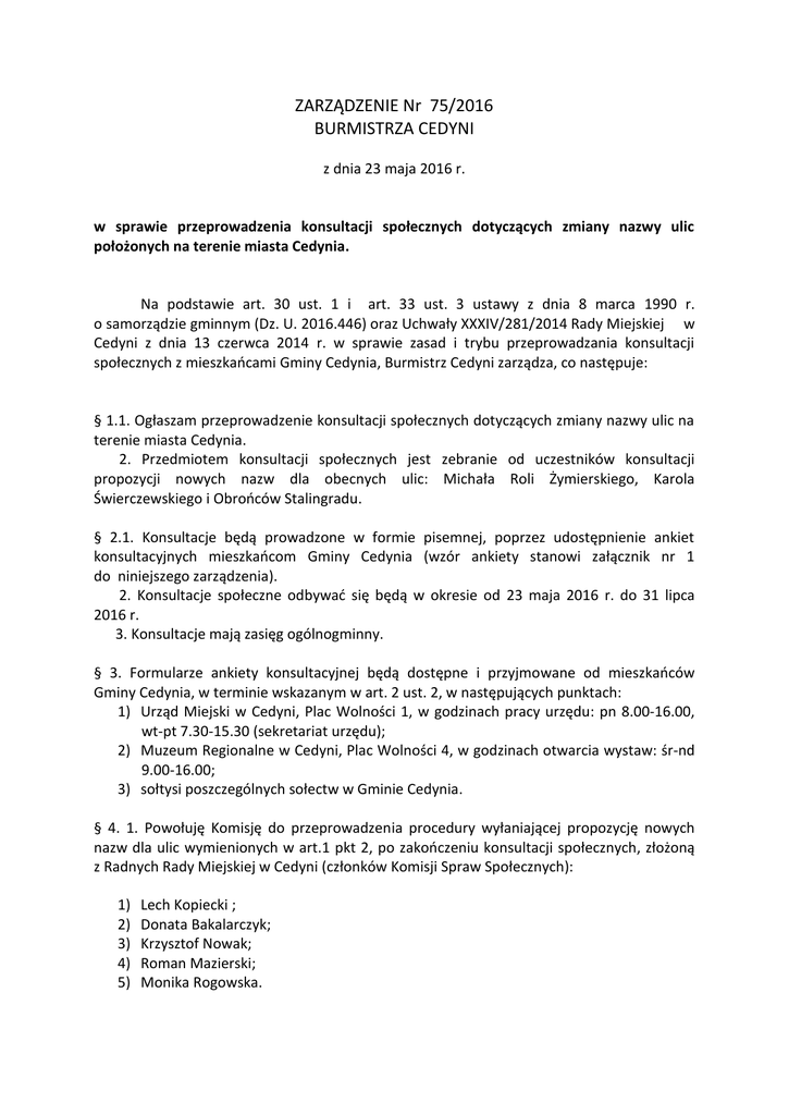 ZARZĄDZENIE Nr 75/2016 BURMISTRZA CEDYNI z dnia 23 maja 2016 r. w sprawie przeprowadzenia konsultacji społecznych dotyczących zmiany nazwy ulic położonych na terenie miasta Cedynia. Na podstawie art. 30 ust. 1 i art. 33 ust. 3 ustawy z dnia 8 marca 1990 r. o samorządzie gminnym (Dz. U. 2016.446) oraz Uchwały XXXIV/281/2014 Rady Miejskiej w Cedyni z dnia 13 czerwca 2014 r. w sprawie zasad i trybu przeprowadzania konsultacji społecznych z mieszkańcami Gminy Cedynia, Burmistrz Cedyni zarządza, co następuje: § 1.1. Ogłaszam przeprowadzenie konsultacji społecznych dotyczących zmiany nazwy ulic na terenie miasta Cedynia. 2. Przedmiotem konsultacji społecznych jest zebranie od uczestników konsultacji propozycji nowych nazw dla obecnych ulic: Michała Roli Żymierskiego, Karola Świerczewskiego i Obrońców Stalingradu. § 2.1. Konsultacje będą prowadzone w formie pisemnej, poprzez udostępnienie ankiet konsultacyjnych mieszkańcom Gminy Cedynia (wzór ankiety stanowi załącznik nr 1 do niniejszego zarządzenia). 2. Konsultacje społeczne odbywać się będą w okresie od 23 maja 2016 r. do 31 lipca 2016 r. 3. Konsultacje mają zasięg ogólnogminny. § 3. Formularze ankiety konsultacyjnej będą dostępne i przyjmowane od mieszkańców Gminy Cedynia, w terminie wskazanym w art. 2 ust. 2, w następujących punktach: 1) Urząd Miejski w Cedyni, Plac Wolności 1, w godzinach pracy urzędu: pn 8.00-16.00, wt-pt 7.30-15.30 (sekretariat urzędu); 2) Muzeum Regionalne w Cedyni, Plac Wolności 4, w godzinach otwarcia wystaw: śr-nd 9.00-16.00; 3) sołtysi poszczególnych sołectw w Gminie Cedynia. § 4. 1. Powołuję Komisję do przeprowadzenia procedury wyłaniającej propozycję nowych nazw dla ulic wymienionych w art.1 pkt 2, po zakończeniu konsultacji społecznych, złożoną z Radnych Rady Miejskiej w Cedyni (członków Komisji Spraw Społecznych): 1) 2) 3) 4) 5) Lech Kopiecki ; Donata Bakalarczyk; Krzysztof Nowak; Roman Mazierski; Monika Rogowska. 2. Do obsługi administracyjno-technicznej komisji, określonej w ust 1, wyznaczam Pana Marcina Krysiaka - podinspektora ds. inwestycji w Referacie Planowania, Infrastruktury i Ochrony Środowiska Urzędu Miejskiego w Cedyni. 3. Z przeprowadzonych konsultacji sporządzone zostanie sprawozdanie, podane do publicznej wiadomości na stronie internetowej Urzędu Miejskiego: www.cedynia.pl. § 5. Zarządzenie podaje się do publicznej wiadomości poprzez umieszczenie w Biuletynie Informacji Publicznej i na stronie internetowej Urzędu Miejskiego w Cedyni pod adresem www.cedynia.pl oraz poprzez umieszczenie na tablicy ogłoszeń Urzędu Miejskiego w Cedyni. § 6. Wykonanie zarządzenia powierzam Sekretarzowi Cedyni. § 7. Zarządzenie wchodzi w życie z dniem podjęcia. Opinia prawna: podpis: Gabriela Kotowicz Burmistrz Cedyni przygotowała: Malwina Markiewicz specjalista w Centrum Promocji i Turystyki w Cedyni sprawdziła: Ewa Pawłowska Sekretarz Gminy Cedynia