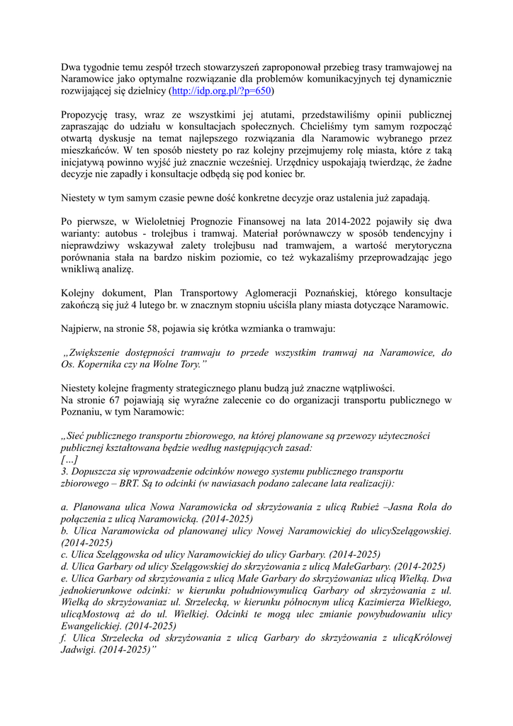 Dwa tygodnie temu zespół trzech stowarzyszeń zaproponował przebieg trasy tramwajowej na Naramowice jako optymalne rozwiązanie dla problemów komunikacyjnych tej dynamicznie rozwijającej się dzielnicy (http://idp.org.pl/?p=650) Propozycję trasy, wraz ze wszystkimi jej atutami, przedstawiliśmy opinii publicznej zapraszając do udziału w konsultacjach społecznych. Chcieliśmy tym samym rozpocząć otwartą dyskusje na temat najlepszego rozwiązania dla Naramowic wybranego przez mieszkańców. W ten sposób niestety po raz kolejny przejmujemy rolę miasta, które z taką inicjatywą powinno wyjść już znacznie wcześniej. Urzędnicy uspokajają twierdząc, że żadne decyzje nie zapadły i konsultacje odbędą się pod koniec br. Niestety w tym samym czasie pewne dość konkretne decyzje oraz ustalenia już zapadają. Po pierwsze, w Wieloletniej Prognozie Finansowej na lata 2014-2022 pojawiły się dwa warianty: autobus - trolejbus i tramwaj. Materiał porównawczy w sposób tendencyjny i nieprawdziwy wskazywał zalety trolejbusu nad tramwajem, a wartość merytoryczna porównania stała na bardzo niskim poziomie, co też wykazaliśmy przeprowadzając jego wnikliwą analizę. Kolejny dokument, Plan Transportowy Aglomeracji Poznańskiej, którego konsultacje zakończą się już 4 lutego br. w znacznym stopniu uściśla plany miasta dotyczące Naramowic. Najpierw, na stronie 58, pojawia się krótka wzmianka o tramwaju: „Zwiększenie dostępności tramwaju to przede wszystkim tramwaj na Naramowice, do Os. Kopernika czy na Wolne Tory.” Niestety kolejne fragmenty strategicznego planu budzą już znaczne wątpliwości. Na stronie 67 pojawiają się wyraźne zalecenie co do organizacji transportu publicznego w Poznaniu, w tym Naramowic: „Sieć publicznego transportu zbiorowego, na której planowane są przewozy użyteczności publicznej kształtowana będzie według następujących zasad: […] 3. Dopuszcza się wprowadzenie odcinków nowego systemu publicznego transportu zbiorowego – BRT. Są to odcinki (w nawiasach podano zalecane lata realizacji): a. Planowana ulica Nowa Naramowicka od skrzyżowania z ulicą Rubież –Jasna Rola do połączenia z ulicą Naramowicką. (2014-2025) b. Ulica Naramowicka od planowanej ulicy Nowej Naramowickiej do ulicySzelągowskiej. (2014-2025) c. Ulica Szelągowska od ulicy Naramowickiej do ulicy Garbary. (2014-2025) d. Ulica Garbary od ulicy Szelągowskiej do skrzyżowania z ulicą MałeGarbary. (2014-2025) e. Ulica Garbary od skrzyżowania z ulicą Małe Garbary do skrzyżowaniaz ulicą Wielką. Dwa jednokierunkowe odcinki: w kierunku południowymulicą Garbary od skrzyżowania z ul. Wielką do skrzyżowaniaz ul. Strzelecką, w kierunku północnym ulicą Kazimierza Wielkiego, ulicąMostową aż do ul. Wielkiej. Odcinki te mogą ulec zmianie powybudowaniu ulicy Ewangelickiej. (2014-2025) f. Ulica Strzelecka od skrzyżowania z ulicą Garbary do skrzyżowania z ulicąKrólowej Jadwigi. (2014-2025)” W kolejnym fragmencie pojawia się zapis o dopuszczeniu tramwaju na Naramowice, jednak w zupełnie innym miejscu: „7. Dopuszcza się wprowadzenie nowych odcinków sieci tramwajowej uzależnionych pozytywnym wynikiem analiz techniczno-ekonomicznych (w nawiasach podano zalecane lata realizacji): e. Połączenie tramwajowe na Naramowice od Ronda Solidarności przez ulicę Murawa do ulicy Rubież i pętli tramwajowej na Naramowicach.” Następny akapit wyraźnie określa priorytety dla poszczególnych inwestycji. W pierwszej kolejności miałby powstać system BRT. Dopiero po jego uruchomieniu rozważa się tramwaj przez ulicę Murawa, a na samym końcu jako alternatywa pozostaje tramwaj od Pętli Wilczak do Naramowic: „Połączenie to powinno być wybudowane dopiero po uruchomieniu na Naramowicach systemu BRT i analizie techniczno-ekonomicznej, która może wykazać konieczność rezygnacji z tego odcinka. Alternatywnie połączenie od Pętli Wilczak wzdłuż ulicy Naramowickiej i Nowej Naramowickiej do pętli tramwajowej na Naramowicach. (2014-2025)” Całość dopełnia tabelka przedstawiająca planowany harmonogram prac, w którym już teraz system BRT bez wykonania żadnych analiz uznaje się za zalecany: 14. PROPONOWANY HARMONOGRAM WDRAŻANIA INWESTYCJI ROZWOJOWYCH ZWIAZANYCH Z PLANEMTRANSPORTOWYM Lata 2014-2020 Inwestycje rozwoju sieci wymagane Planem transportowym objęte propozycją wnioskowania o środki unijne z rozdania 2014-2020 Budowa systemu BRT od Naramowic do ul. Królowej Jadwigi. Inwestycja wymaga pozytywnej oceny analizy technicznoekonomicznej. Lata 2021-2025 Inwestycje rozwoju sieci wymagane Planem transportowym po 2025 r. Inwestycje kierunkowe rozwoju sieci nieobjęte zakresem inwestycji rozwojowych Planu transportowego Budowa systemu BRT od Naramowic do ul. Królowej Jadwigi. Inwestycja wymaga pozytywnej oceny analizy technicznoekonomicznej. Budowa połączenia tramwajowego od ul. Królowej Jadwigi do Pętli Wilczak w przypadku rezygnacji z zalecanego systemu BRT. Opcjonalnie budowa połączenia tramwajowego od Pętli Wilczak wzdłuż ulicy Naramowickiej i Nowej Naramowickiej do pętli tramwajowej na Naramowicach. Opcjonalnie budowa połączenia tramwajowego od Pętli Wilczak wzdłuż ulicy Naramowickiej i Nowej Naramowickiej do pętli tramwajowej na Naramowicach. Alternatywnie budowa połączenia tramwajowego od ul. Królowej Jadwigi do Pętli Wilczak w przypadku rezygnacji z zalecanego systemu BRT. Alternatywnie budowa połączenia tramwajowego od ul. Królowej Jadwigi do Pętli Wilczak w przypadku rezygnacji z zalecanego systemu BRT. Zastanawiamy się jak zapisy tego dokumentu mają się do słów Z-CY Dyrektora Biura Koordynacji Projektów UM Grzegorza Kamińskiego wypowiedzianych dla telewizji WTK 20 stycznia br. : „Dzisiaj nie definiujemy jeszcze, jakie to maja być konkretnie rozwiązania. Wskazujemy pewne kierunki w jakich chcielibyśmy w przyszłości rozwiązać problemy komunikacyjne na Naramowicach. […] Z