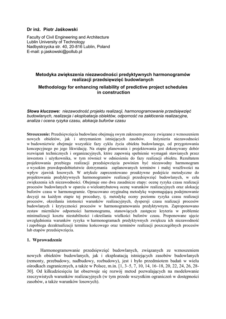 Dr inż. Piotr Jaśkowski Faculty of Civil Engineering and Architecture Lublin University of Technology Nadbystrzycka str. 40, 20-816 Lublin, Poland E-mail: [email protected] Metodyka zwiększenia niezawodności predyktywnych harmonogramów realizacji przedsięwzięć budowlanych Methodology for enhancing reliability of predictive project schedules in construction Słowa kluczowe: niezawodność projektu realizacji, harmonogramowanie przedsięwzięć budowlanych, realizacja i eksploatacja obiektów, odporność na zakłócenia realizacyjne, analiza i ocena ryzyka czasu, alokacja buforów czasu Streszczenie: Przedsięwzięcia budowlane obejmują swym zakresem procesy związane z wznoszeniem nowych obiektów, jak i utrzymaniem istniejących zasobów. Inżynieria niezawodności w budownictwie obejmuje wszystkie fazy cyklu życia obiektu budowlanego, od przygotowania koncepcyjnego po jego likwidację. Na etapie planowania i projektowania jest dokonywany dobór rozwiązań technicznych i organizacyjnych, które zapewnią spełnienie wymagań stawianych przez inwestora i użytkownika, w tym również w odniesieniu do fazy realizacji obiektu. Rezultatem projektowania przebiegu realizacji przedsięwzięcia powinien być niezawodny harmonogram o wysokim prawdopodobieństwie dotrzymania zaplanowanych terminów i małej wrażliwości na wpływ zjawisk losowych. W artykule zaprezentowano proaktywne podejście metodyczne do projektowania predyktywnych harmonogramów realizacji przedsięwzięć budowlanych, w celu zwiększenia ich niezawodności. Obejmuje ono dwa zasadnicze etapy: ocenę ryzyka czasu realizacji procesów budowlanych w oparciu o wieloatrybutową ocenę warunków realizacyjnych oraz alokację buforów czasu w harmonogramie. Opracowano oryginalną metodykę wspomagającą podejmowanie decyzji na każdym etapie tej procedury, tj. metodykę oceny poziomu ryzyka czasu realizacji procesów, określania istotności warunków realizacyjnych, dyspersji czasu realizacji procesów budowlanych i krytyczności procesów w harmonogramowaniu predyktywnym. Zaproponowano zestaw mierników odporności harmonogramu, stanowiących zastępcze kryteria w problemie minimalizacji kosztu niestabilności i określania wielkości buforów czasu. Proponowane ujęcie uwzględnienia warunków ryzyka w harmonogramach predyktywnych zwiększa ich niezawodność i zapobiega dezaktualizacji terminu końcowego oraz terminów realizacji poszczególnych procesów lub etapów przedsięwzięcia. 1. Wprowadzenie Harmonogramowanie przedsięwzięć budowlanych, związanych ze wznoszeniem nowych obiektów budowlanych, jak i eksploatacją istniejących zasobów budowlanych (remonty, przebudowy, nadbudowy, rozbudowy), jest i było przedmiotem badań w wielu ośrodkach zagranicznych, a także w Polsce, m.in. [1, 3–5, 7, 10, 14, 16–18, 20, 22, 24, 26, 2830]. Od kilkudziesięciu lat obserwuje się rozwój metod pozwalających na modelowanie rzeczywistych warunków realizacyjnych (w tym przede wszystkim ograniczeń w dostępności zasobów, a także warunków losowych). Realizacja przedsięwzięcia odbywa się często w warunkach ryzyka, negatywnie oddziaływującego na terminowość realizacji [8, 11, 14, 16–18, 21, 24, 26–27]. Dążenie do ograniczenia skutków zjawisk losowych przyczyniło się do rozwoju metod odpornych (ang. robust) w statystyce i w badaniach operacyjnych [2], mających zastosowania w wielu dziedzinach gospodarki. W zarządzaniu przedsięwzięciami należy do nich harmonogramowanie predyktywne (ang. predictive scheduling) z podejściem proaktywnym [29], w którym jest opracowywany harmonogram odporny na zakłócenia (ang. robust schedule). Podejście to jest oceniane w literaturze przedmiotu jako bardziej efektywne od postępowania reaktywnego, polegającego na aktualizacji harmonogramów, gdy w trakcie realizacji wystąpią zakłócenia wymagające zmian wcześniej sporządzonych planów. Odporność harmonogramu na zakłócenia należy rozumieć jako zdolność do przeciwdziałania skutkom nieznacznych wydłużeń czasów wykonania procesów, które mogą być spowodowane przez czynniki ryzyka [1]. Stosowane są dwa podejścia optymalizacyjne [28], których celem nadrzędnym jest zwiększenie: odporności jakości harmonogramu (ang. quality robustness) – podejście, w którym kluczowym zadaniem jest dotrzymanie planowanego terminu zakończenia realizacji przedsięwzięcia (ang. stability of makespan); odporności harmonogramu (ang. solution robustness) – podejście, w którym dąży się do wykonania procesów zgodnie z planem; antycypacja zaburzeń produkcyjnych ma doprowadzić do minimalizacji odchyleń rzeczywistych terminów rozpoczęcia zadań od ustalonych w harmonogramie. Oba podejścia prowadzą do zwiększenia niezawodności haromonogramu, rozumianej jako prawdopodobieństwo spełnienia przez harmonogram stawianych mu wymagań w zakresie poprawności ustaleń terminów realizacji procesów (terminu zakończenia przedsięwzięcia i terminów realizacji poszczególnych procesów). Większość istniejących metod planowania wykorzystywanych w budownictwie, w których czasy trwania procesów budowlanych są zmiennymi losowymi, koncentrują się najczęściej jedynie na określeniu terminu zakończenia realizacji przedsięwzięcia z zadanym prawdopodobieństwem jego nieprzekroczenia [14, 20], w mniejszym stopniu na zagadnieniu tworzenia harmonogramu z dyrektywnymi terminami rozpoczynania procesów. Analiza modelu sieciowego w funkcji czasu dostarcza zwykle informacji o charakterze probabilistycznym, co utrudnia planowanie produkcji pomocniczej i obsługi logistycznej. Dużym utrudnieniem może być również konieczność określania rozkładów prawdopodobieństwa czasu wykonania procesów. Większość opracowanych metod (PERT – ang. Program Evaluation and Review Technique), PNET (ang. Probabilistic Network Evaluation Technique), NRB (ang. Narrow Reliability Bounds method) zakłada równie