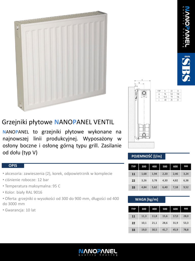 Grzejniki płytowe NANOPANEL VENTIL NANOPANEL to grzejniki płytowe wykonane na najnowszej linii produkcyjnej. Wyposażony w osłony boczne i osłonę górną typu grill. Zasilanie od dołu (typ V) OPIS • akcesoria: zawieszenia (2), korek, odpowietrznik w komplecie • ciśnienie robocze: 12 bar • Temperatura maksymalna: 95 C • Kolor: biały RAL 9016 • Oferta: grzejniki o wysokości od 300 do 900 mm, długości od 400 do 3000 mm • Gwarancja: 10 lat POJEMNOŚĆ [l/m] TYP 300 400 500 600 900 11 1,68 1,94 2,20 2,46 3,24 22 3,26 3,78 4,30 4,82 6,38 33 4,84 5,62 6,40 7,18 9,52 WAGA [kg/m] TYP 300 400 500 600 900 11 11,3 11,8 15,6 17,0 28,0 22 10,1 21,1 28,6 31,9 53,3 33 19,0 30,5 41,7 45,9 78,8 Grzejniki płytowe NANOPANEL COMPACT NANOPANEL to grzejniki płytowe wykonane na najnowszej linii produkcyjnej. Wyposażony w osłony boczne i osłonę górną typu grill. Zasilanie z boku (typ C) OPIS • akcesoria: zawieszenia (2), korek, odpowietrznik w komplecie • ciśnienie robocze: 12 bar • Temperatura maksymalna: 95 C • Kolor: biały RAL 9016 • Oferta: grzejniki o wysokości od 300 do 900 mm, długości od 400 do 3000 mm • Gwarancja: 10 lat POJEMNOŚĆ [l/m] TYP 300 400 500 600 900 11 1,58 1,84 2,10 2,36 4,14 22 3,16 3,68 4,20 4,72 6,28 33 4,74 5,52 6,30 7,08 9,42 WAGA [kg/m] TYP 300 400 500 600 900 11 11,0 11,5 15,2 16,6 27,5 22 9,8 20,7 28,1 31,4 52,5 33 18,6 30,0 41,1 45,2 77,8 Dlaczego NANO? Grzejniki NANOPANEL produkowane są na najnowszych liniach produkcyjnych, a także na nowoczesnej linii lakierniczej. W procesie przygotowania powierzchni zastosowano innowacyjną technologię firmy HENKEL – NANOceramicznej obróbki wstępnej metalu. Jest to specjalna powłoka stanowiąca najwyższą ochronę antykorozyjną. NANO technologia wykorzystuje małe cząstki do tworzenia wielkich efektów. Jest to nowatorski proces powlekania do wstępnej obróbki metali przed ich malowaniem, powodując zwiększenie pola powierzchni metalu zapewniając farbie lepszą i większą powierzchnię przylegania. SZANOWNI PAOSTWO tak powstają nowe grzejniki pod marką Grupy SBS