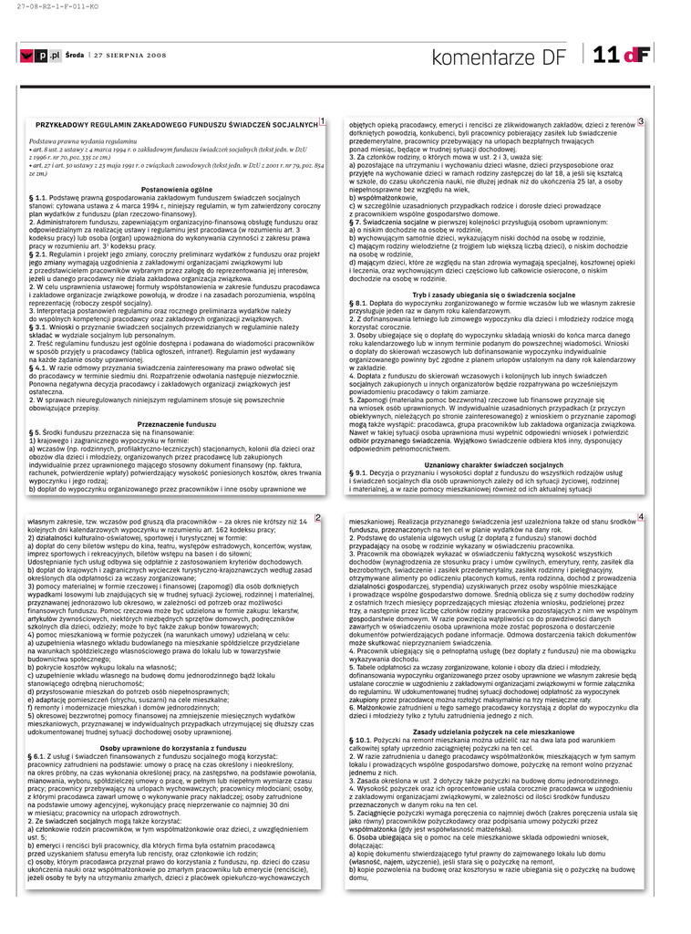 27-08-RZ-1-F-011-KO ◊ rp .pl komentarze DF Środa | 27 sierpnia 2008 PRZYKŁADOWY REGULAMIN ZAKŁADOWEGO FUNDUSZU ŚWIADCZEŃ SOCJALNYCH 1 Podstawa prawna wydania regulaminu • art. 8 ust. 2 ustawy z 4 marca 1994 r. o zakładowym funduszu świadczeń socjalnych (tekst jedn. w DzU z 1996 r. nr 70, poz. 335 ze zm.) • art. 27 i art. 30 ustawy z 23 maja 1991 r. o związkach zawodowych (tekst jedn. w DzU z 2001 r. nr 79, poz. 854 ze zm.) Postanowienia ogólne § 1.1. Podstawę prawną gospodarowania zakładowym funduszem świadczeń socjalnych stanowi: cytowana ustawa z 4 marca 1994 r., niniejszy regulamin, w tym zatwierdzony coroczny plan wydatków z funduszu (plan rzeczowo-finansowy). 2. Administratorem funduszu, zapewniającym organizacyjno-finansową obsługę funduszu oraz odpowiedzialnym za realizację ustawy i regulaminu jest pracodawca (w rozumieniu art. 3 kodeksu pracy) lub osoba (organ) upoważniona do wykonywania czynności z zakresu prawa pracy w rozumieniu art. 31 kodeksu pracy. § 2.1. Regulamin i projekt jego zmiany, coroczny preliminarz wydatków z funduszu oraz projekt jego zmiany wymagają uzgodnienia z zakładowymi organizacjami związkowymi lub z przedstawicielem pracowników wybranym przez załogę do reprezentowania jej interesów, jeżeli u danego pracodawcy nie działa zakładowa organizacja związkowa. 2. W celu usprawnienia ustawowej formuły współstanowienia w zakresie funduszu pracodawca i zakładowe organizacje związkowe powołują, w drodze i na zasadach porozumienia, wspólną reprezentację (roboczy zespół socjalny). 3. Interpretacja postanowień regulaminu oraz rocznego preliminarza wydatków należy do wspólnych kompetencji pracodawcy oraz zakładowych organizacji związkowych. § 3.1. Wnioski o przyznanie świadczeń socjalnych przewidzianych w regulaminie należy składać w wydziale socjalnym lub personalnym. 2. Treść regulaminu funduszu jest ogólnie dostępna i podawana do wiadomości pracowników w sposób przyjęty u pracodawcy (tablica ogłoszeń, intranet). Regulamin jest wydawany na każde żądanie osoby uprawnionej. § 4.1. W razie odmowy przyznania świadczenia zainteresowany ma prawo odwołać się do pracodawcy w terminie siedmiu dni. Rozpatrzenie odwołania następuje niezwłocznie. Ponowna negatywna decyzja pracodawcy i zakładowych organizacji związkowych jest ostateczna. 2. W sprawach nieuregulowanych niniejszym regulaminem stosuje się powszechnie obowiązujące przepisy. Przeznaczenie funduszu § 5. Środki funduszu przeznacza się na finansowanie: 1) krajowego i zagranicznego wypoczynku w formie: a) wczasów (np. rodzinnych, profilaktyczno-leczniczych) stacjonarnych, kolonii dla dzieci oraz obozów dla dzieci i młodzieży, organizowanych przez pracodawcę lub zakupionych indywidualnie przez uprawnionego mającego stosowny dokument finansowy (np. faktura, rachunek, potwierdzenie wpłaty) potwierdzający wysokość poniesionych kosztów, okres trwania wypoczynku i jego rodzaj; b) dopłat do wypoczynku organizowanego przez pracowników i inne osoby uprawnione we własnym zakresie, tzw. wczasów pod gruszą dla pracowników – za okres nie krótszy niż 14 2 kolejnych dni kalendarzowych wypoczynku w rozumieniu art. 162 kodeksu pracy; 2) działalności kulturalno-oświatowej, sportowej i turystycznej w formie: a) dopłat do ceny biletów wstępu do kina, teatru, występów estradowych, koncertów, wystaw, imprez sportowych i rekreacyjnych, biletów wstępu na basen i do siłowni; Udostępnianie tych usług odbywa się odpłatnie z zastosowaniem kryteriów dochodowych. b) dopłat do krajowych i zagranicznych wycieczek turystyczno-krajoznawczych według zasad określonych dla odpłatności za wczasy zorganizowane; 3) pomocy materialnej w formie rzeczowej i finansowej (zapomogi) dla osób dotkniętych wypadkami losowymi lub znajdujących się w trudnej sytuacji życiowej, rodzinnej i materialnej, przyznawanej jednorazowo lub okresowo, w zależności od potrzeb oraz możliwości finansowych funduszu. Pomoc rzeczowa może być udzielona w formie zakupu: lekarstw, artykułów żywnościowych, niektórych niezbędnych sprzętów domowych, podręczników szkolnych dla dzieci, odzieży; może to być także zakup bonów towarowych; 4) pomoc mieszkaniową w formie pożyczek (na warunkach umowy) udzielaną w celu: a) uzupełnienia własnego wkładu budowlanego na mieszkanie spółdzielcze przydzielane na warunkach spółdzielczego własnościowego prawa do lokalu lub w towarzystwie budownictwa społecznego; b) pokrycie kosztów wykupu lokalu na własność; c) uzupełnienie wkładu własnego na budowę domu jednorodzinnego bądź lokalu stanowiącego odrębną nieruchomość; d) przystosowanie mieszkań do potrzeb osób niepełnosprawnych; e) adaptację pomieszczeń (strychu, suszarni) na cele mieszkalne; f) remonty i modernizacje mieszkań i domów jednorodzinnych; 5) okresowej bezzwrotnej pomocy finansowej na zmniejszenie miesięcznych wydatków mieszkaniowych, przyznawanej w indywidualnych przypadkach utrzymującej się dłuższy czas udokumentowanej trudnej sytuacji dochodowej osoby uprawnionej. Osoby uprawnione do korzystania z funduszu § 6.1. Z usług i świadczeń finansowanych z funduszu socjalnego mogą korzystać: pracownicy zatrudnieni na podstawie: umowy o pracę na czas określony i nieokreślony, na okres próbny, na czas wykonania określonej pracy, na zastępstwo, na podstawie powołania, mianowania, wyboru, spółdzielczej umowy o pracę, w pełnym lub niepełnym wymiarze czasu pracy; pracownicy przebywający na urlopach wychowawczych; pracownicy młodociani; osoby, z którymi pracodawca zawarł umowę o wykonywanie pracy nakładczej; osoby zatrudnione na podstawie umowy agencyjnej, wykonujący pracę nieprzerwanie co najmniej 30 dni w miesiącu; pracownicy na urlopach zdrowotnych. 2. Ze świadczeń socjalnych mogą także korzystać: a) członkowie rodzin pracowników, w tym współmałżonkowie oraz dzieci, z uwzględ