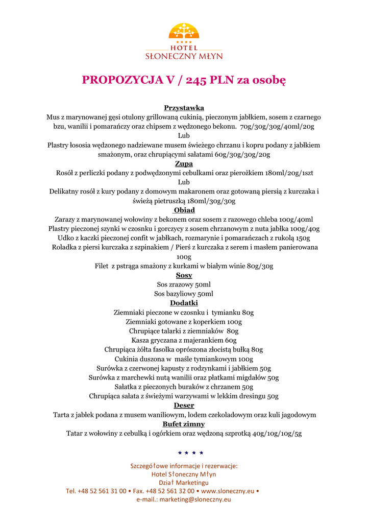 PROPOZYCJA V / 245 PLN za osobę Przystawka Mus z marynowanej gęsi otulony grillowaną cukinią, pieczonym jabłkiem, sosem z czarnego bzu, wanilii i pomarańczy oraz chipsem z wędzonego bekonu. 70g/30g/30g/40ml/20g Lub Plastry łososia wędzonego nadziewane musem świeżego chrzanu i kopru podany z jabłkiem smażonym, oraz chrupiącymi sałatami 60g/30g/30g/20g Zupa Rosół z perliczki podany z podwędzonymi cebulkami oraz pierożkiem 180ml/20g/1szt Lub Delikatny rosół z kury podany z domowym makaronem oraz gotowaną piersią z kurczaka i świeżą pietruszką 180ml/30g/30g Obiad Zarazy z marynowanej wołowiny z bekonem oraz sosem z razowego chleba 100g/40ml Plastry pieczonej szynki w czosnku i gorczycy z sosem chrzanowym z nuta jabłka 100g/40g Udko z kaczki pieczonej confit w jabłkach, rozmarynie i pomarańczach z rukolą 150g Roladka z piersi kurczaka z szpinakiem / Pierś z kurczaka z serem i masłem panierowana 100g Filet z pstrąga smażony z kurkami w białym winie 80g/30g Sosy Sos zrazowy 50ml Sos bazyliowy 50ml Dodatki Ziemniaki pieczone w czosnku i tymianku 80g Ziemniaki gotowane z koperkiem 100g Chrupiące talarki z ziemniaków 80g Kasza gryczana z majerankiem 60g Chrupiąca żółta fasolka oprószona złocistą bułką 80g Cukinia duszona w maśle tymiankowym 100g Surówka z czerwonej kapusty z rodzynkami i jabłkiem 50g Surówka z marchewki nutą wanilii oraz płatkami migdałów 50g Sałatka z pieczonych buraków z chrzanem 50g Chrupiąca sałata z świeżymi warzywami w lekkim dresingu 50g Deser Tarta z jabłek podana z musem waniliowym, lodem czekoladowym oraz kuli jagodowym Bufet zimny Tatar z wołowiny z cebulką i ogórkiem oraz wędzoną szprotką 40g/10g/10g/5g Szczegółowe informacje i rezerwacje: Hotel Słoneczny Młyn Dział Marketingu Tel. +48 52 561 31 00 • Fax. +48 52 561 32 00 • www.sloneczny.eu • e-mail.: [email protected] Plastry wołowiny „sous vide” marynowanej w soli morskiej z musem z musztardy 50g/30g Karczek wieprzowy pieczony w chrzanie i śliwkach 70g/20g Pasztet z kaczki podany z sosem z agrestu i mięty 50g Chrupiące satae z kurczaka z sosem słodko-pikantnym 50g/20g Tym baliki z marynowanej piersi z kurczaka z plastrami cytryn 50g/20g Mus z indyka z sosem z sera pleśniowego i winogrona 50g/ Mini tarty z musem z : - pstrąga wędzonego 1szt/os -papryki z rozmarynem 1szt/os Śledziki w dwóch odsłonach 50g Marynowane klopsiki w occie 40g Bufet sałatkowy Sałatka z kurczakiem BBQ oraz sosem „cezar” Sałatka z makaronu penne z szynką, sosem jogurtowym z szczypiorkiem Bufet Słodki Babeczki z owocami 1szt/os Babeczki z kajmakiem i orzechami 1szt/os Ciasto dwa rodzaje 50g/50g Kosze drobnych owoców lub platery owoców filetowanych 150g/ 100g Dania serwowane po północy Barszcz czerwony na wędzonce i suszonych grzybach z pasztecikiem (180g/60g) Żeberka wolno pieczone z sosem z wędzonych śliwek 100g/50g Szczegółowe informacje i rezerwacje: Hotel Słoneczny Młyn Dział Marketingu Tel. +48 52 561 31 00 • Fax. +48 52 561 32 00 • www.sloneczny.eu • e-mail.: [email protected]