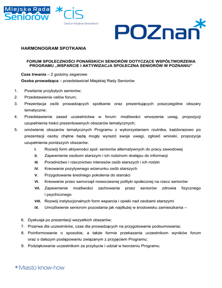 HARMONOGRAM SPOTKANIA FORUM SPOŁECZNOŚCI PONAŃSKICH SENIORÓW DOTYCZĄCE WSPÓŁTWORZENIA PROGRAMU „WSPARCIE I AKTYWIZACJA SPOŁECZNA SENIORÓW W POZNANIU” Czas trwania – 2 godziny zegarowe Osoba prowadząca – przedstawiciel Miejskiej Rady Seniorów 1. Powitanie przybyłych seniorów; 2. Przedstawienie celów forum; 3. Prezentacja osób prowadzących spotkanie oraz prezentujących poszczególne obszary tematyczne; 4. Przedstawienie zasad uczestnictwa w forum: możliwości wnoszenia uwag, propozycji uzupełnienia treści prezentowanych obszarów tematycznych; 5. omówienie obszarów tematycznych Programu z wykorzystaniem rzutnika, każdorazowo po prezentacji osoby chętne będą mogły wyrazić swoje uwagi, zgłosić wnioski, propozycje uzupełnienia poniższych obszarów: I. Rozwój form aktywności społ. seniorów alternatywnych do pracy zawodowej II. Zapewnienie osobom starszym i ich rodzinom dostępu do informacji III. Poradnictwo i rzecznictwo interesów osób starszych i ich rodzin IV. Kreowanie pozytywnego wizerunku osób starszych V. Przygotowanie średniego pokolenia do starości VI. Kreowanie przez samorząd nowoczesnej polityki społecznej na rzecz seniorów VII. Zapewnienie możliwości zachowania przez seniorów zdrowia fizycznego i psychicznego VIII. Rozwój instytucjonalnych form wsparcia i opieki nad osobami starszymi IX. Umożliwienie seniorom pozostania jak najdłużej w środowisku zamieszkania – 6. Dyskusja po prezentacji wszystkich obszarów; 7. Przerwa dla uczestników, czas dla prowadzących na przygotowanie podsumowania; 8. Poinformowanie o sposobie, a także formie przekazania uczestnikom wyników forum oraz o dalszym postępowaniu związanym z przyjęciem Programu; 9. Podziękowanie uczestnikom za przybycie i udział w tworzeniu Programu.