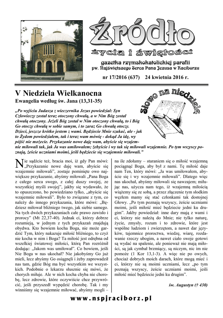 gazetka rzymskokatolickiej parafii pw. Najświętszego Serca Pana Jezusa w Raciborzu nr 17/2016 (637) 24 kwietnia 2016 r. V Niedziela Wielkanocna Ewangelia według św. Jana (13,31-35) „Po wyjściu Judasza z wieczernika Jezus powiedział: Syn Człowieczy został teraz otoczony chwałą, a w Nim Bóg został chwałą otoczony. JeŜeli Bóg został w Nim otoczony chwałą, to i Bóg Go otoczy chwałą w sobie samym, i to zaraz Go chwałą otoczy. Dzieci, jeszcze krótko jestem z wami. Będziecie Mnie szukać, ale - jak to śydom powiedziałem, tak i teraz wam mówię - dokąd Ja idę, wy pójść nie moŜecie. Przykazanie nowe daję wam, abyście się wzajemnie miłowali tak, jak Ja was umiłowałem; Ŝebyście i wy tak się miłowali wzajemnie. Po tym wszyscy poznają, Ŝeście uczniami moimi, jeśli będziecie się wzajemnie miłowali.” N ie sądźcie teŜ, bracia moi, iŜ gdy Pan mówi: „Przykazanie nowe daję wam, abyście się wzajemnie miłowali”, zostaje pominięte owo największe przykazanie, abyśmy miłowali „Pana Boga z całego serca swego, z całej duszy swojej, ze wszystkiej myśli swojej”, jakby się wydawało, Ŝe to opuszczono, bo powiedziano tylko, „abyście się wzajemnie miłowali”. Było to związane z tym, co naleŜy do innego przykazania, które mówi: „Będziesz miłował bliźniego twego, jak siebie samego. Na tych dwóch przykazaniach całe prawo zawisło i prorocy” (Mt 22,37-40). Jednak ci, którzy dobrze rozumieją, w jednym z tych przykazań znajdują obydwa. Kto bowiem kocha Boga, nie moŜe gardzić Tym, który nakazuje miłość bliźniego, to czyŜ nie kocha w nim i Boga? Ta miłość jest odrębna od wszelkiej światowej miłości, którą Pan rozróŜnił dodając: „Jakom was umiłował”. Co bowiem, jeśli Nie Boga w nas ukochał? Nie jakobyśmy Go juŜ mieli, lecz abyśmy Go osiągnęli i Ŝeby zaprowadził nas tam, gdzie Bóg ma być wszystkim we wszystkich. Podobnie o lekarzu słusznie się mówi, Ŝe chorych miłuje. Ale w nich kocha chyba nie chorobę, lecz zdrowie, które oczywiście chce przywrócić, jeśli przyszedł wypędzić chorobę. Tak i my winniśmy się wzajemnie miłować, abyśmy mogli – na ile zdołamy – staraniem się o miłość wzajemną pociągnąć Boga, aby był z nami. Tę miłość daje nam Ten, który mówi: „Ja was umiłowałem, abyście się i wy wzajemnie miłowali”. Dlatego więc nas ukochał, abyśmy miłowali się nawzajem; miłując nas, uŜycza nam tego, iŜ wzajemną miłością wiąŜemy się ze sobą, a przez złączenie tym słodkim węzłem mamy się stać członkami tak dostojnej Głowy. „Po tym poznają wszyscy, Ŝeście uczniami moimi, jeśli miłość mieć będziecie jedni ku drugim”. Jakby powiedział: inne dary mają z wami i ci, którzy nie naleŜą do Mnie; nie tylko naturę, Ŝycie, zmysły, rozum i to zdrowie, które jest wspólne ludziom i zwierzętom, a nawet dar języków, tajemnice proroctwa, wiedzę, wiarę, rozdawanie rzeczy ubogim, a nawet ciało swoje gotowi są wydać na spalenie, ale poniewaŜ nie mają miłości, są jak cymbał brzmiący, są niczym, nic im nie pomoŜe (1 Kor 13,1-3). A więc nie po owych, chociaŜ dobrych moich darach, które mogą mieć i ci, którzy nie są moimi uczniami, lecz „po tym poznają wszyscy, Ŝeście uczniami moimi, jeśli miłość mieć będziecie jedni ku drugim”. www.nspjraciborz.pl św. Augustyn († 430) 2 Źródło - gazetka Poniedziałek – 25 kwietnia 2016 – św. Marka Ewangelisty Mk 16,15-20 630 Za † brata Ryszarda Marcinkiewicza, †† rodziców Hildegardę i Piotra i †† z pokrewieństwa 900 Za †† rodziców Józefa i Marię Klinik, córkę Łucję, synów Pawła, Antoniego i Karola, dziadków z obu stron i dusze w czyśćcu cierpiące 1800 1. Do BoŜej Opatrzności z podziękowaniem za otrzymane łaski, z prośbą o dalsze BoŜe błogosławieństwo na dalsze lata Ŝycia dla Genowefy z okazji 70. rocznicy urodzin oraz o BoŜe błogosławieństwo dla córek, zięciów i wnuków 2. Za † męŜa i ojca Aleksandra w rocznicę urodzin i za †† z rodziny Wtorek – 26 kwietnia 2016 J 14,27-31 630 Do BoŜej Opatrzności w intencji Julii w 94. rocznicę urodzin z podziękowaniem za otrzymane łaski, z prośbą o zdrowie i BoŜe błogosławieństwo dla całej rodziny, przyjaciół, sąsiadów oraz za †† syna Stanisława, męŜa Stanisława Uhryn 800 W języku niemieckim: W intencji chrzestnych rodziców: matki chrzestnej Gabrieli o BoŜe błogosławieństwo i opiekę Matki BoŜej, † ojca chrzestnego Engelberta o radość w Ŝyciu wiecznym 1800 1. Za † Urszulę Mandera 2. Do Miłosierdzia BoŜego za † męŜa Władysława Łubik w 19. rocznicę śmierci oraz za †† rodziców z obu stron, dwóch braci, szwagrów Józefa i Stanisława, szwagierkę Annę z męŜem i † Józefa Wajda 3. Za † Lucję Świniarską w 12. rocznicę śmierci oraz za wszystkich †† z rodziny (do modlitwy wiernych: w intencji Mai Łubik w 5. rocznicę urodzin) Środa – 27 kwietnia 2016 J 15,1-8 630 Do Miłosierdzia BoŜego za † Zdzisława Kucharczyka w 1. r. śmierci o dar Ŝycia wiecznego 900 Za †† Jakuba i Annę Mrozek 1800 1. Do Miłosierdzia BoŜego za † ojca Stefana Oleksy oraz wszystkich †† z rodziny i pokrewieństwa 2. Za †† rodziców Władysławę i Stanisława Węgrzyniak Adoracja Najświętszego Sakramentu (Ruch Rodzin Nazaretańskich) Czwartek – 28 kwietnia 2016 J 15,9-11 630 Za † Zofię Rejman (od współlokatorów z ulicy Polnej) 1630 Szkolna: Za †† Reinholda, Jadwigę i Beatę Miler oraz dusze w czyśćcu cierpiące 1800 1. Do BoŜej Opatrzności w intencji Katarzyny, Wiktora i Martina z podziękowaniem za otrzymane łaski, z prośbą o BoŜe błogosławieństwo i zdrowie 2. Za †† babcię Salomeę i dziadka Jana Czernieckich w 21. rocznicę śmierci z prośbą o dar Ŝycia wiecznego Piątek – 29 kwietnia 2016 – św. Katarzyny Sieneńskiej, dz. i doktora K-ła Mt 11,25-