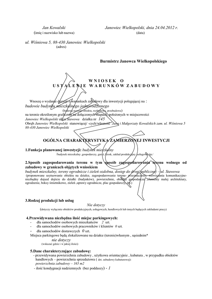 Jan Kowalski (imię i nazwisko lub nazwa) Janowiec Wielkopolski, dnia 24.04.2012 r. (data) ul. Wiśniowa 5, 88-430 Janowiec Wielkopolski (adres) Burmistrz Janowca Wielkopolskiego WNIOSEK O USTALENIE WARUNKÓW ZABUDOWY Wnoszę o wydanie decyzji o warunkach zabudowy dla inwestycji polegającej na : budowie budynku mieszkalnego jednorodzinnego (budowa nowego obiektu, rozbudowa, przebudowa) na terenie określonym graficznie na dołączonych mapach, położonych w miejscowości Janowiec Wielkopolski ulica Stawowa działka nr 145 Obręb Janowiec Wielkopolski stanowiącej/ -cych/własność Jana i Małgorzaty Kowalskich zam. ul. Wiśniowa 5 88-430 Janowiec Wielkopolski OGÓLNA CHARAKTERYSTYKA ZAMIERZONEJ INWESTYCJI 1.Funkcja planowanej inwestycji: budynek mieszkalny /budynek mieszkalny ,gospodarczy, garaż, kiosk, zakład produkcyjny ,usługowy itp./ 2.Sposób zagospodarowania terenu w tym sposób zagospodarowania terenu wolnego od zabudowy w granicach objętych wnioskiem budynek mieszkalny, tereny ogrodnicze i zieleń ozdobna, dostęp do drogi publicznej – ul. Stawowa (proponowane usytuowanie obiektu na działce, zagospodarowanie terenu- przeznaczenie, rozwiązania komunikacyjneniezbędny dojazd dojście do działki (budynków), powierzchnie, obsługa gospodarcza ,elementy małej architektury, ogrodzenie, boksy śmietnikowe, zieleń ,uprawy ogrodnicze, plac gospodarczy, itp.) 3.Rodzaj produkcji lub usług Nie dotyczy (dotyczy wyłącznie obiektów produkcyjnych, usługowych, handlowych lub innych będących zakładami pracy) 4.Przewidywana niezbędna ilość miejsc parkingowych: dla samochodów osobowych mieszkańców 2 szt. dla samochodów osobowych pracowników i klientów 0 szt. - dla samochodów dostawczych 0 szt. Miejsca parkingowe będą zlokalizowane na działce (terenie)własnym , sąsiednim* - nie dotyczy (wskazać gdzie i w jakiej ilości) 5.Dane charakteryzujące zabudowę: - przewidywana powierzchnia zabudowy , użytkowa orientacyjnie , kubatura , w przypadku obiektów handlowych – powierzchnia sprzedażowa ( dot. zabudowy kubaturowej): powierzchnia zabudowy – 165 m2 - ilość kondygnacji nadziemnych (bez poddaszy) - 1 - proponowane rozwiązania architektoniczne ,technologia wykonawstwa , sposób zadaszenia (dach płaski, stromy, ilość połaci dachowych),proponowane materiały wykończeniowe ścian zewn. i pokrycia dachowego , itp.: dach dwuspadowy, blacho dachówka, ściany z bloczków betonowych 6. Zapotrzebowanie w media i sposób usuwania nieczystości: woda /do celów bytowych z sieci*/inne*/...........................................................w ilości 10m3/m energia elektryczna /do celów bytowych z sieci*/inne*/.................................... w ilości 16 kV/m gaz /do celów bytowych z sieci*/inne*/.............................................................. w ilości 8m3/m sposób ogrzewania budynku – centralne ogrzewanie sposób odprowadzenia wód opadowych /do kanalizacji deszczowej*/powierzchniowo*/do rowu melioracyjnego*/inny (podać jaki)*/ - do kanalizacji deszczowej f) sposób odprowadzania lub oczyszczania ścieków sanitarnych:/do kanalizacji sanitarnej*/do przydomowej oczyszczalni ścieków*/ do zbiornika bezodpływowego*/ g) sposób unieszkodliwiania odpadów – wywóz przez uprawnioną firmę a) b) c) d) e) 7. Charakterystyczne parametry techniczne inwestycji oraz w przypadku braku obowiązku przeprowadzenia postępowania w sprawie oceny oddziaływania na środowisko , dane charakteryzujące jej wpływ na środowisko lub jego wykorzystanie Nie dotyczy Jan Kowalski (podpis wnioskodawcy)