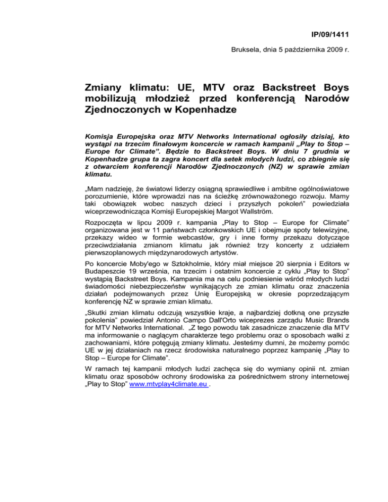 IP/09/1411 Bruksela, dnia 5 października 2009 r. Zmiany klimatu: UE, MTV oraz Backstreet Boys mobilizują młodzież przed konferencją Narodów Zjednoczonych w Kopenhadze Komisja Europejska oraz MTV Networks International ogłosiły dzisiaj, kto wystąpi na trzecim finałowym koncercie w ramach kampanii „Play to Stop – Europe for Climate”. Będzie to Backstreet Boys. W dniu 7 grudnia w Kopenhadze grupa ta zagra koncert dla setek młodych ludzi, co zbiegnie się z otwarciem konferencji Narodów Zjednoczonych (NZ) w sprawie zmian klimatu. „Mam nadzieję, że światowi liderzy osiągną sprawiedliwe i ambitne ogólnoświatowe porozumienie, które wprowadzi nas na ścieżkę zrównoważonego rozwoju. Mamy taki obowiązek wobec naszych dzieci i przyszłych pokoleń” powiedziała wiceprzewodnicząca Komisji Europejskiej Margot Wallström. Rozpoczęta w lipcu 2009 r. kampania „Play to Stop – Europe for Climate” organizowana jest w 11 państwach członkowskich UE i obejmuje spoty telewizyjne, przekazy wideo w formie webcastów, gry i inne formy przekazu dotyczące przeciwdziałania zmianom klimatu jak również trzy koncerty z udziałem pierwszoplanowych międzynarodowych artystów. Po koncercie Moby'ego w Sztokholmie, który miał miejsce 20 sierpnia i Editors w Budapeszcie 19 września, na trzecim i ostatnim koncercie z cyklu „Play to Stop” wystąpią Backstreet Boys. Kampania ma na celu podniesienie wśród młodych ludzi świadomości niebezpieczeństw wynikających ze zmian klimatu oraz znaczenia działań podejmowanych przez Unię Europejską w okresie poprzedzającym konferencję NZ w sprawie zmian klimatu. „Skutki zmian klimatu odczują wszystkie kraje, a najbardziej dotkną one przyszłe pokolenia” powiedział Antonio Campo Dall'Orto wiceprezes zarządu Music Brands for MTV Networks International. „Z tego powodu tak zasadnicze znaczenie dla MTV ma informowanie o naglącym charakterze tego problemu oraz o sposobach walki z zachowaniami, które potęgują zmiany klimatu. Jesteśmy dumni, że możemy pomóc UE w jej działaniach na rzecz środowiska naturalnego poprzez kampanię „Play to Stop – Europe for Climate”. W ramach tej kampanii młodych ludzi zachęca się do wymiany opinii nt. zmian klimatu oraz sposobów ochrony środowiska za pośrednictwem strony internetowej „Play to Stop” www.mtvplay4climate.eu . Kontekst: Działania UE w zakresie zmian klimatu Celem grudniowej konferencji NZ w Kopenhadze jest zawarcie nowego ogólnoświatowego porozumienia w sprawie zmian klimatu, które zastąpi wygasający w 2012 r. Protokół z Kioto. Podjęcie działań na wczesnym etapie jest niezbędne: destabilizacja klimatu stała się już rzeczywistością, a wszelkie opóźnienia w osiągnięciu porozumienia nieuchronnie opóźnią globalne działania w tym zakresie i pogłębią skutki zmian klimatu oraz zwiększą koszty tych działań. Unia Europejska odgrywa już teraz wiodącą rolę w przeciwdziałaniu zmianom klimatu na poziomie ogólnoświatowym. W grudniu 2008 r. UE przyjęła zintegrowany pakiet działań w obszarze energii i zmian klimatu, zawierający ambitne cele, które mają zostać zrealizowane do 2020 r. Działania te mają skierować Europę na właściwe tory – ku przyjaznej dla środowiska przyszłości z gospodarką niskoemisyjną i racjonalnym zużyciem energii. Cele te mają zostać osiągnięte dzięki: - zmniejszeniu ilości gazów cieplarnianych o 20 proc. (a nawet 30 proc. w przypadku zawarcia odpowiedniego porozumienia międzynarodowego) - zmniejszeniu o 20 proc. zużycia energii dzięki zwiększonej efektywności energetycznej - zwiększeniu do 20 proc. udziału energii odnawialnej w całkowitym zużyciu energii. Kampania „Play to Stop – Europe for Climate” prowadzona jest w Bułgarii, Danii, Francji, Niemczech, Polsce, Republice Czeskiej, Rumunii, Szwecji, na Węgrzech, we Włoszech i w Zjednoczonym Królestwie. Tych 11 państw jest reprezentowanych przez ambasadorów ze świata rozrywki, którzy promują wysiłki na rzecz przeciwdziałania zmianom klimatu. Będą nimi: bułgarska tenisistka Magdalena Maleeva, czeska piosenkarka Aneta Langerová, duńska piosenkarka Anna David, francuski aktor Paslac Légitimus, aktor z Niemiec Tobias Schenke, węgierski mistrz aerobiku Attila Katus, włoska gwiazda telewizyjna Paola Maugeri, polski prezenter telewizyjny Michał Piróg oraz Serban Miron Copot - rumuński działacz zajmujący się klimatem. 2