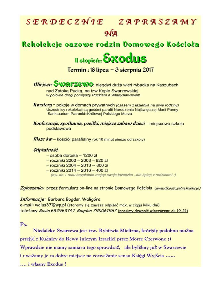SERDECZNIE ZAPRASZAMY NA Rekolekcje oazowe rodzin Domowego Kościoła Exodus II stopień:: Termin : 18 lipca – 3 sierpnia 2017 Miejsce: Swarzewo; niegdyś duża wieś rybacka na Kaszubach nad Zatoką Pucką, na tzw Kępie Swarzewskiej w połowie drogi pomiędzy Puckiem a Władysławowem Kwatery - pokoje w domach prywatnych (czasem 1 łazienka na dwie rodziny) Uczestnicy rekolekcji są gośćmi parafii Narodzenia Najświętszej Marii Panny -Sanktuarium Patronki=Królowej Polskiego Morza Konferencje, spotkania, posiłki, miejsce zabaw dzieci – miejscowa szkoła podstawowa Msze św – kościół parafialny (ok 10 minut pieszo od szkoły) Odpłatność: osoba dorosła – 1200 zł roczniki 2000 – 2003 – 920 zł roczniki 2004 – 2013 -- 800 zł roczniki 2014 – 2016 – 400 zł (ew. do 1 roku bezpłatnie mając swoje łóżeczko ..lub śpiąc z rodzicami :) Zgłoszenia: przez formularz on-line na stronie Domowego Kościoła (www.dk.oaza.pl/rekolekcje) Informacje: Barbara Bogdan Waligóra e-mail: [email protected] (staramy się zawsze odpisać max. w ciągu kilku dni) telefony Basia 692963747 Bogdan 795061967 (prosimy dzwonić wieczorem; ok 19-21) Ps. Niedaleko Swarzewa jest tzw. Rybitwia Mielizna, którędy podobno można przejść z Kuźnicy do Rewy (niczym Izraelici przez Morze Czerwone ;) Wprawdzie nie mamy zamiaru tego sprawdzać, ale byliśmy już w Swarzewie i uważamy je za dobre miejsce na rozważanie sensu Księgi Wyjścia …... …. i własny Exodus !