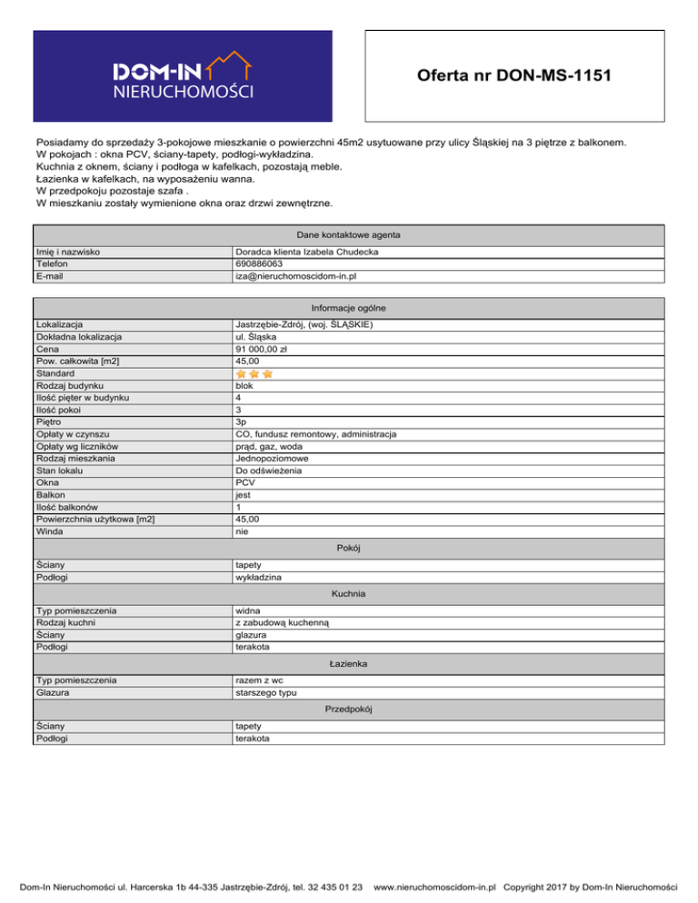 Oferta nr DON-MS-1151 Posiadamy do sprzedaży 3-pokojowe mieszkanie o powierzchni 45m2 usytuowane przy ulicy Śląskiej na 3 piętrze z balkonem. W pokojach : okna PCV, ściany-tapety, podłogi-wykładzina. Kuchnia z oknem, ściany i podłoga w kafelkach, pozostają meble. Łazienka w kafelkach, na wyposażeniu wanna. W przedpokoju pozostaje szafa . W mieszkaniu zostały wymienione okna oraz drzwi zewnętrzne. Dane kontaktowe agenta Imię i nazwisko Telefon E-mail Doradca klienta Izabela Chudecka 690886063 [email protected] Informacje ogólne Lokalizacja Dokładna lokalizacja Cena Pow. całkowita [m2] Standard Rodzaj budynku Ilość pięter w budynku Ilość pokoi Piętro Opłaty w czynszu Opłaty wg liczników Rodzaj mieszkania Stan lokalu Okna Balkon Ilość balkonów Powierzchnia użytkowa [m2] Winda Jastrzębie-Zdrój, (woj. ŚLĄSKIE) ul. Śląska 91 000,00 zł 45,00 blok 4 3 3p CO, fundusz remontowy, administracja prąd, gaz, woda Jednopoziomowe Do odświeżenia PCV jest 1 45,00 nie Pokój Ściany Podłogi tapety wykładzina Kuchnia Typ pomieszczenia Rodzaj kuchni Ściany Podłogi widna z zabudową kuchenną glazura terakota Łazienka Typ pomieszczenia Glazura razem z wc starszego typu Ściany Podłogi tapety terakota Przedpokój Dom-In Nieruchomości ul. Harcerska 1b 44-335 Jastrzębie-Zdrój, tel. 32 435 01 23 www.nieruchomoscidom-in.pl Copyright 2017 by Dom-In Nieruchomości
