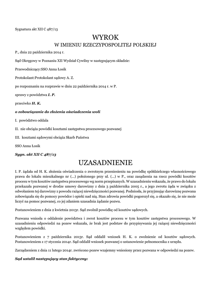 Sygnatura akt XII C 487/13 WYROK W IMIENIU RZECZYPOSPOLITEJ POLSKIEJ P., dnia 22 października 2014 r. Sąd Okręgowy w Poznaniu XII Wydział Cywilny w następującym składzie: Przewodniczący:SSO Anna Łosik Protokolant:Protokolant sądowy A. Z. po rozpoznaniu na rozprawie w dniu 22 października 2014 r. w P. sprawy z powództwa I. P. przeciwko H. K. o zobowiązanie do złożenia oświadczenia woli I. powództwo oddala II. nie obciąża powódki kosztami zastępstwa procesowego pozwanej III. kosztami sądowymi obciąża Skarb Państwa SSO Anna Łosik Sygn. akt XII C 487/13 UZASADNIENIE I. P. żądała od H. K. złożenia oświadczenia o zwrotnym przeniesieniu na powódkę spółdzielczego własnościowego prawa do lokalu mieszkalnego nr (...) położonego przy ul. (...) w P., oraz zasądzenia na rzecz powódki kosztów procesu w tym kosztów zastępstwa procesowego wg norm przepisanych. W uzasadnieniu wskazała, że prawo do lokalu przekazała pozwanej w drodze umowy darowizny z dnia 3 października 2005 r., a jego zwrotu żąda w związku z odwołaniem tej darowizny z powodu rażącej niewdzięczności pozwanej. Podniosła, że przyjmując darowiznę pozwana zobowiązała się do pomocy powódce i opieki nad nią. Stan zdrowia powódki pogorszył się, a okazało się, że nie może liczyć na pomoc pozwanej, co jej zdaniem uzasadnia żądanie pozwu. Postanowieniem z dnia 2 kwietnia 2013r. Sąd zwolnił powódkę od kosztów sądowych. Pozwana wniosła o oddalenie powództwa i zwrot kosztów procesu w tym kosztów zastępstwa procesowego. W uzasadnieniu odpowiedzi na pozew wskazała, że brak jest podstaw do przypisywania jej rażącej niewdzięczności względem powódki. Postanowieniem z 7 października 2013r. Sąd oddalił wniosek H. K. o zwolnienie od kosztów sądowych. Postanowieniem z 17 stycznia 2014r. Sąd oddalił wniosek pozwanej o ustanowienie pełnomocnika z urzędu. Zarządzeniem z dnia 11 lutego 2014r. zwrócono pozew wzajemny wniesiony przez pozwana w odpowiedzi na pozew. Sąd ustalił następujący stan faktyczny: I. P. i H. K. są znajomymi ze wspólnoty religijnej świadków Jehowy, łączyły je dobre relacje koleżeńskie. W 2004 roku powódka szukała rozwiązania, które pozwoliłoby jej zabezpieczyć swoją "starość". Liczyła wówczas 75 lat, jej jedyna córka mieszkała na Śląsku. Z racji tego, że powódka i pozwana były członkiniami jednego zboru religijnego, spotykały się na cotygodniowych zebraniach. We wspólnocie, do której obie przynależą, obowiązuje zasada pomagania innym w potrzebie, w szczególności zaś osobom starszym, które są otaczane opieką duchową i wspierane przez współczłonków wspólnoty. Pozwana interesowała się problemami powódki jako, że była ona osobą starszą i samotną. Powódka radziła się pozwanej, jak powinna postąpić, by odpowiednio urządzić się na przyszłość, gdyż obawiała się, że w swojej sytuacji pozostanie bez pomocy, kiedy będzie jej potrzebowała. Powódka rozważała przeniesienie blisko rodziny na (...), ale ostatecznie zdecydowała, że najlepiej będzie zorganizować wszystko tak, aby miała jakąś pomoc na miejscu. Pozwana pracowała wówczas w biurze kredytowym i zaproponowała, że pomoże powódce w wykupie od spółdzielni mieszkaniowej prawa do lokalu, w którego posiadaniu była I. P.. Powódce odpowiadał ten pomysł i obie prowadziły rozmowy zmierzające do sformalizowania idei. Pozwana w przeciwieństwie do powódki posiadała zdolność kredytową i zaoferowała, że może przekazać środki na wykup prawa do lokalu. Kobiety ustalały w rozmowach, że pozwana w zamian za to miałaby przejąć lokal po jej śmierci. Ostatecznie jednak strony przyjęły takie rozwiązanie, że pozwana sfinansuje koszty wykupu mieszkania, a powódka przeniesie na pozwaną prawo do lokalu w drodze umowy darowizny, z zapewnieniem sobie prawa dożywotniego bezpłatnego użytkowania mieszkania. Pozwana przekazała powódce własne środki w celu wykupu prawa do lokalu w spółdzielni, a nadto sfinansowała koszty umowy darowizny. Łącznie wydatkowała na ten cel 28.045,76zł. W dniu 3 października 2005r. strony zawarły przed notariuszem umowę darowizny, mocą której I. P. darowała H. K. własnościowe spółdzielcze prawo do lokalu i oświadczyła, że zastrzega dla siebie bezpłatne użytkowanie przedmiotu umowy na czas nieokreślony, nieograniczony do czasu życia strony uprawnionej postanawiając, że świadczenie trwać będzie niewątpliwie przez 30 lat. Strony nie zawarły w treści umowy żadnego postanowienia, które konkretyzowałoby obowiązek opieki nad powódką ze strony pozwanej. Nie precyzowały też ustnie, na czym pomoc ze strony pozwanej miałaby polegać. Powódka rozumiała zapisy umowy w ten sposób, że pozwana będzie sprawowała nad nią stałą bezpośrednią opiekę, kiedy tylko ta będzie jej oczekiwała. Z kolei według świadomości pozwanej, pomoc miała opiewać na pozostawanie w gotowości do udzielenia pomocy w razie wyższej konieczności. Od 2006r. mąż pozwanej Z. K. choruje na nowotwór złośliwy- chłoniaka z przerzutami na kości. Wiąże się to z poddawaniem radioterapii i chemioterapii, która skrajnie wyczerpuje organizm, okresowymi pobytami w szpitalu. Pozwana opiekuje się nim na stałe od momentu zdiagnozowania choroby do chwili obecnej. W przebiegu choroby, mąż pozwanej często pozostawał w bardzo osłabiony i konieczne było sprawowanie nad nim opieki całodobowej, a bywały okresy, w których sytuacja względnie się poprawiała i wówczas był samodzielny. Przez cały czas jednak pozwana była i jest obciążona psychicznie samym faktem śmiertelnej choroby męża i ciągłym oczekiwaniem na poprawę jego zdrowia. W okresie od momentu przekazania lokalu pozwanej, powódka zamieszkiwała sama i była osobą samodzielną wykonywała wszystkie czynności bieżące bez pomocy osób trzecich. Przez ten czas kilkukrotnie zwracała się d