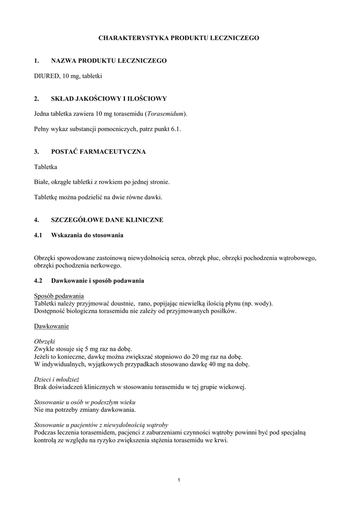 CHARAKTERYSTYKA PRODUKTU LECZNICZEGO 1. NAZWA PRODUKTU LECZNICZEGO DIURED, 10 mg, tabletki 2. SKŁAD JAKOŚCIOWY I ILOŚCIOWY Jedna tabletka zawiera 10 mg torasemidu (Torasemidum). Pełny wykaz substancji pomocniczych, patrz punkt 6.1. 3. POSTAĆ FARMACEUTYCZNA Tabletka Białe, okrągłe tabletki z rowkiem po jednej stronie. Tabletkę można podzielić na dwie równe dawki. 4. SZCZEGÓŁOWE DANE KLINICZNE 4.1 Wskazania do stosowania Obrzęki spowodowane zastoinową niewydolnością serca, obrzęk płuc, obrzęki pochodzenia wątrobowego, obrzęki pochodzenia nerkowego. 4.2 Dawkowanie i sposób podawania Sposób podawania Tabletki należy przyjmować doustnie, rano, popijając niewielką ilością płynu (np. wody). Dostępność biologiczna torasemidu nie zależy od przyjmowanych posiłków. Dawkowanie Obrzęki Zwykle stosuje się 5 mg raz na dobę. Jeżeli to konieczne, dawkę można zwiększać stopniowo do 20 mg raz na dobę. W indywidualnych, wyjątkowych przypadkach stosowano dawkę 40 mg na dobę. Dzieci i młodzież Brak doświadczeń klinicznych w stosowaniu torasemidu w tej grupie wiekowej. Stosowanie u osób w podeszłym wieku Nie ma potrzeby zmiany dawkowania. Stosowanie u pacjentów z niewydolnością wątroby Podczas leczenia torasemidem, pacjenci z zaburzeniami czynności wątroby powinni być pod specjalną kontrolą ze względu na ryzyko zwiększenia stężenia torasemidu we krwi. 1 4.3 Przeciwwskazania Nadwrażliwość na torasemid, inne pochodne sulfonylomocznika lub na którąkolwiek substancję pomocniczą wymienioną w punkcie 6.1. Zaburzenia czynności nerek z bezmoczem. Śpiączka wątrobowa i stany przedśpiączkowe. Niedociśnienie tętnicze. Ciąża i karmienie piersią. Zaburzenia rytmu serca. Jednoczesne stosowanie z antybiotykami z grupy aminoglikozydów oraz cefalosporyn. 4.4 Specjalne ostrzeżenia i środki ostrożności dotyczące stosowania Przed rozpoczęciem leczenia torasemidem należy przywrócić równowagę wodno-elektrolitową (hipoglikemia, hipotermia, hipowolemia) i usunąć przyczynę zaburzeń w oddawaniu moczu. Podczas długotrwałego leczenia torasemidem zaleca się regularną kontrolę gospodarki wodno-elektrolitowej, stężenia glukozy, kwasu moczowego, kreatyniny i lipidów we krwi. Zaleca się dokładną kontrolę pacjentów ze skłonnością do zwiększonego stężenia kwasu moczowego we krwi (hiperurykemia) i skazy moczanowej. U pacjentów z utajoną lub jawną cukrzycą należy kontrolować metabolizm węglowodanów. 4.5 Interakcje z innymi produktami leczniczymi i inne rodzaje interakcji W przypadku jednoczesnego stosowania torasemidu z glikozydami nasercowymi może dochodzić do zwiększenia wrażliwości mięśnia sercowego na te leki – z powodu obniżenia stężenia potasu i (lub) magnezu w osoczu. W połączeniu z mineralo- i glikokortykosteroidami oraz środkami przeczyszczającymi może powodować zwiększenie wydalania potasu z moczem. Podobnie jak w przypadku innych leków diuretycznych, może wystąpić nasilenie działania obniżającego ciśnienie krwi podczas podawania jednocześnie innych leków przeciwnadciśnieniowych. Torasemid, zwłaszcza w dużych dawkach, może zwiększać toksyczność antybiotyków aminoglikozydowych, cisplatyny, neurotoksyczność cefalosporyn oraz kardio- i neurotoksyczność litu. Działanie leków zwiotczających mięśnie zawierających kurarę oraz działanie teofiliny może ulec nasileniu podczas jednoczesnego stosowania z torasemidem. U pacjentów otrzymujących duże dawki salicylanów może zwiększyć się ich toksyczność. Działanie leków przeciwcukrzycowych może ulegać osłabieniu. Zastosowanie inhibitorów konwertazy angiotensyny (ACE) po leczeniu torasemidem, albo rozpoczęcie terapii skojarzonej tymi lekami, może powodować przemijające spadki ciśnienia. Działanie to można zminimalizować zmniejszając początkową dawkę inhibitora angiotensyny i (lub) zmniejszenie dawki albo czasowe odstawienie torasemidu. Torasemid może zwiększać reaktywność tętnic na leki obkurczające naczynia (np. adrenalina, noradrenalina). Niesteroidowe leki przeciwzapalne (np. indometacyna) i probenecyd mogą zmniejszać działanie moczopędne i hipotensyjne torasemidu. 2 Nie badano jednoczesnego podawania torasemidu i kolestyraminy u ludzi, ale w badaniach na zwierzętach stwierdzono zmniejszenie absorpcji doustnego torasemidu. 4.6 Wpływ na płodność, ciążę i laktację Torasemid jest przeciwwskazany w okresie ciąży i karmienia piersią. Ciąża Brak danych na temat wpływu torasemidu na zarodek i płód u ludzi. W badaniach na szczurach nie wykazano działania teratogennego. Po podaniu dużych dawek ciężarnym królikom, obserwowano wady rozwojowe płodów. Karmienie piersią Brak danych dotyczących wydzielania leku do mleka matki. 4.7 Wpływ na zdolność prowadzenia pojazdów i obsługiwania maszyn Tak jak w przypadku innych leków wpływających na ciśnienie krwi, pacjenci u których występują zawroty głowy lub podobne objawy, nie powinni prowadzić pojazdów i obsługiwać urządzeń mechanicznych w ruchu. 4.8 Działania niepożądane Częstość występowania działań niepożądanych określono następująco: Bardzo często (≥1/10) Często (≥1/100 do <1/10) Niezbyt często (≥1/1 000 do <1/100) Rzadko (≥1/10 000 do <1/1 000) Bardzo rzadko (<1/10 000) Częstość nieznana (nie może być określona na podstawie dostępnych danych) Zaburzenia krwi i układu chłonnego Bardzo rzadko Zmniejszenie liczby płytek krwi, czerwonych i (lub) białych krwinek Zaburzenia naczyniowe Bardzo rzadko Powikłania zakrzepowe spowodowane zagęszczeniem krwi, dezorientacja, zaburzenia krążenia sercowego i centralnego układu nerwowego (włączając niedokrwienie sercowe i mózgowe), co może doprowadzić do np. arytmii serca, dusznicy bolesnej, zawału serca lub omdlenia Zaburzenia żołądka i jelit Często Dolegliwości żołądkowo-jelitowe (np. zmniejszenie apetytu, ból żo