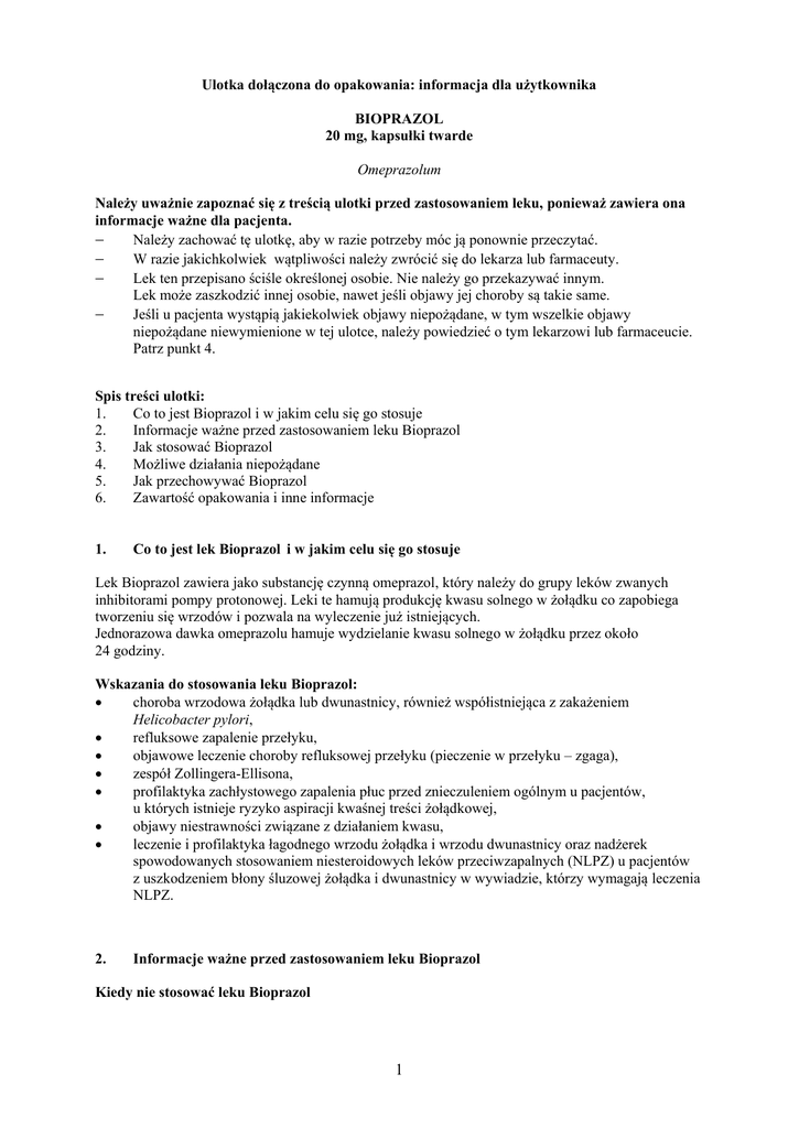 Ulotka dołączona do opakowania: informacja dla użytkownika BIOPRAZOL 20 mg, kapsułki twarde Omeprazolum Należy uważnie zapoznać się z treścią ulotki przed zastosowaniem leku, ponieważ zawiera ona informacje ważne dla pacjenta. Należy zachować tę ulotkę, aby w razie potrzeby móc ją ponownie przeczytać. W razie jakichkolwiek wątpliwości należy zwrócić się do lekarza lub farmaceuty. Lek ten przepisano ściśle określonej osobie. Nie należy go przekazywać innym. Lek może zaszkodzić innej osobie, nawet jeśli objawy jej choroby są takie same. Jeśli u pacjenta wystąpią jakiekolwiek objawy niepożądane, w tym wszelkie objawy niepożądane niewymienione w tej ulotce, należy powiedzieć o tym lekarzowi lub farmaceucie. Patrz punkt 4. Spis treści ulotki: 1. Co to jest Bioprazol i w jakim celu się go stosuje 2. Informacje ważne przed zastosowaniem leku Bioprazol 3. Jak stosować Bioprazol 4. Możliwe działania niepożądane 5. Jak przechowywać Bioprazol 6. Zawartość opakowania i inne informacje 1. Co to jest lek Bioprazol i w jakim celu się go stosuje Lek Bioprazol zawiera jako substancję czynną omeprazol, który należy do grupy leków zwanych inhibitorami pompy protonowej. Leki te hamują produkcję kwasu solnego w żołądku co zapobiega tworzeniu się wrzodów i pozwala na wyleczenie już istniejących. Jednorazowa dawka omeprazolu hamuje wydzielanie kwasu solnego w żołądku przez około 24 godziny. Wskazania do stosowania leku Bioprazol: choroba wrzodowa żołądka lub dwunastnicy, również współistniejąca z zakażeniem Helicobacter pylori, refluksowe zapalenie przełyku, objawowe leczenie choroby refluksowej przełyku (pieczenie w przełyku – zgaga), zespół Zollingera-Ellisona, profilaktyka zachłystowego zapalenia płuc przed znieczuleniem ogólnym u pacjentów, u których istnieje ryzyko aspiracji kwaśnej treści żołądkowej, objawy niestrawności związane z działaniem kwasu, leczenie i profilaktyka łagodnego wrzodu żołądka i wrzodu dwunastnicy oraz nadżerek spowodowanych stosowaniem niesteroidowych leków przeciwzapalnych (NLPZ) u pacjentów z uszkodzeniem błony śluzowej żołądka i dwunastnicy w wywiadzie, którzy wymagają leczenia NLPZ. 2. Informacje ważne przed zastosowaniem leku Bioprazol Kiedy nie stosować leku Bioprazol 1 jeśli pacjent ma uczulenie na omeprazol lub którykolwiek z pozostałych składników tego leku (wymienionych w punkcie 6), jeśli pacjent jednocześnie przyjmuje lek atazanawir (lek stosowany w leczeniu zakażenia wirusem HIV). Ostrzeżenia i środki ostrożności Przed rozpoczęciem stosowania Bioprazolu należy omówić to z lekarzem lub farmaceutą. Przed rozpoczęciem leczenia choroby wrzodowej żołądka lub w razie wystąpienia jakichkolwiek niepokojących objawów (tj. znaczna, niespodziewana utrata masy ciała, nawracające wymioty, zaburzenia połykania, wymioty z domieszką krwi, smoliste stolce) należy wykluczyć możliwość nowotworowego charakteru choroby, ponieważ leczenie omeprazolem może złagodzić objawy i opóźnić rozpoznanie. Zmniejszona kwaśność soku żołądkowego, wywołana jakimikolwiek przyczynami, włączając inhibitory pompy protonowej, powoduje zwiększenie ilości bakterii normalnie obecnych w przewodzie pokarmowym. Terapia lekami zmniejszającymi kwaśność soku żołądkowego może prowadzić do zwiększenia ryzyka zakażeń bakteriami Salmonella i Campylobacter. W przypadku planowania wykonania jakichkolwiek testów należy wcześniej poinformować lekarza o przyjmowaniu leku Bioprazol, ponieważ może to mieć wpływ na jego wyniki. Przed przyjęciem leku należy poinformować lekarza: o planowanym specyficznym badaniu krwi (stężenie chromograniny A). Przyjmując inhibitory pompy protonowej jak Bioprazol, zwłaszcza w okresie dłuższym niż jeden rok, może zwiększyć się nieznacznie ryzyko wystąpienia złamań kości biodrowej, kości nadgarstka lub kręgosłupa. Należy poinformować lekarza w przypadku rozpoznanej osteoporozy lub przyjmowania leków z grupy kortykosteroidów (mogących zwiększać ryzyko wystąpienia osteoporozy). Należy zwrócić się do lekarza, nawet jeśli powyższe ostrzeżenia dotyczą sytuacji występujących w przeszłości. Przed rozpoczęciem przyjmowania leku Bioprazol należy skonsultować się z lekarzem: • jeśli u pacjenta kiedykolwiek występowała reakcja skórna w wyniku stosowania leku podobnego do leku Bioprazol, który zmniejsza wydzielanie kwasu żołądkowego. Jeśli u pacjenta wystąpiła wysypka skórna, zwłaszcza w miejscach narażonych na działanie promieni słonecznych, należy jak najszybciej powiedzieć o tym lekarzowi, ponieważ konieczne może być przerwanie stosowania leku Bioprazol. Należy również powiedzieć o wszelkich innych występujących działaniach niepożądanych, takich jak ból stawów. Dzieci i młodzież Leku Bioprazol nie podaje się dzieciom do 3 lat. W przypadku konieczności zastosowania omeprazolu u dzieci powyżej 3 lat, należy zwrócić się do lekarza (patrz również punkt 3. Jak stosować Bioprazol). Stosowanie leku Bioprazol u pacjentów z zaburzeniami czynności wątroby U pacjentów z niewydolnością wątroby należy zmniejszyć dobową dawkę leku. Stosowanie leku Bioprazol u pacjentów z zaburzeniami czynności nerek Niewydolność nerek nie wymaga zmiany dawki. Bioprazol a inne leki Należy powiedzieć lekarzowi o wszystkich lekach przyjmowanych przez pacjenta obecnie lub ostatnio a także o lekach, które pacjent planuje przyjmować. 2 Stosowanie leku Bioprazol należy skonsultować z lekarzem lub farmaceutą, jeżeli przyjmowany jest jeden z następujących leków: warfaryna (lek przeciwzakrzepowy), fenytoina (lek przeciwpadaczkowy), diazepam, heksabarbital (leki uspokajające i nasenne), atazanawir (lek stosowany w leczeniu zakażenia wirusem HIV), takrolimus (lek stosowany podczas transplantacji narządów oraz w leczeniu atopowego zapalenia skóry