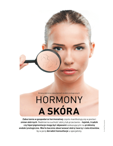 medical beauty Zmiany skórne w zaburzeniach endokrynologicznych Zaburzenia w gospodarce hormonalnej często manifestują się w postaci zmian skórnych. Nadmierna suchość skóry lub przeciwnie – łojotok, trądzik czy hiperpigmentacje mogą być objawami wskazującymi na problemy endokrynologiczne. Warto bacznie obserwować skórę twarzy i ciała klientów, by w porę doradzić konsultacje u specjalisty. 64 BEAUTY FORUM | 10/2013 Fot.: iStock©/Tijana, skynesher HORMONY A SKÓRA medical beauty z miany skórne są powodowane przez hormony biorące udział w różnych mechanizmach. Po pierwsze, hormony mogą wpływać bezpośrednio na pewne struktury skóry. Po drugie, tzw. endokrynopatia wpływa na skórę w ramach ogólnego działania na organizm. I po trzecie, zmiany skórne występują także jako efekt leczenia zaburzeń hormonalnych. Gdy winna jest tarczyca Nadczynność tarczycy – W nadczynności tarczycy skóra jest ciepła, zaczerwieniona i nadmiernie wilgotna. Może występować świąd, bielactwo, rozległe łysienie lub łysienie plackowate. Obserwowano również, głównie w chorobie Gravesa-Basedowa, rozległe przebarwienia. Czasami obserwuje się tzw. paznokcie Plummera, w których dochodzi do oddzielenia się dystalnego brzegu płytki paznokciowej od łożyska paznokcia. Charakterystyczne dla nadczynności tarczycy są również płaskie nacieki guzowate na wyprostnej powierzchni podudzi. Guzy są dość twarde, sinobrunatne lub nieznacznie różniące się zabarwieniem od skóry zdrowej. Mają nierówną powierzchnię, jakby złożoną z mniejszych wykwitów guzowatych, są niebolesne i wzrastają bardzo powoli. Niedoczynność tarczycy – W przebiegu niedoczynności tarczycy występuje tzw. obrzęk śluzowaty uogólniony. Skóra ma barwę woskowożółtą. Jest sucha, szorstka, blada, występuje ciastowaty obrzęk, w którym ucisk palcem nie pozostawia zagłębienia. Naskórek często złuszcza się łupieżowato. Wydzielanie potu i łoju jest obniżone. Nasilenie zmian występuje głównie na twarzy, karku i szyi oraz rękach. Występuje objaw „brudnych łokci”. Twarz staje się maskowata wskutek obrzęku nosa, warg i powiek. Może też dojść do utraty bocznej 1/3 brwi. Zmiany zachodzą również w paznokciach. Stają się one matowe, rozwłóknione i łatwo się kruszą. Także włosy są suche, łamliwe, pozbawione połysku i często występuje znaczne wyłysienie. W niedoczynności tarczycy może również dojść do nagromadzenia karotenu w warstwie rogowej, co objawia się zażółceniem dłoni i stóp. Częstym objawem jest także, w związku z uszkodzeniem drobnych naczyń krwionośnych, marmurkowatość skóry. Czasami dochodzi do plamicy. Możemy mieć również do czynienia z obrzękiem śluzowatym ogniskowym, który występuje w postaci wy- Szorstka, blada i łuszcząca się skóra, łamliwe włosy i paznokcie mogą świadczyć o zaburzeniach pracy tarczycy. niosłych tworów guzowatych lub płaskowyniosłych nacieków. Nadnercza pod lupą Nadczynność nadnerczy – Najczęstszym zaburzeniem nadczynności nadnerczy jest zespół Cushinga, związany m.in. z nadmiernym wydzielaniem kortyzolu. U chorych dochodzi do charakterystycznego odkładania się tłuszczu w obrębie tułowia i twarzy (twarz księżycowata), przy stosunkowo szczupłych kończynach. Na skórze brzucha, a czasem również na ramionach, sutkach i udach, pojawiają się szerokie czerwonofioletowe rozstępy. Obserwuje się również suchość skóry i liczne zmiany naczyniowe. Charakterystyczny jest także tzw. byczy kark. Skóra na twarzy jest sinoczerwona, szczególnie w obrębie policzków. U osób z hiperkortyzolemią istnieje też większa skłonność do zachorowań na grzybicę i łupież pstry. W nadczynności nadnerczy mogą wystąpić: trądzik posteroidowy, objawy hirsutyzmu u kobiet, czyli nadmierne owłosienie wargi górnej, bródki i typ męski owłosienia łonowego, skłonność do wypadania włosów i łysienie. Trądzik, hirsutyzm i tzw. androgenne łysienie jest związane z nadmiernym wydzielaniem androgenów. U niektórych pacjentów występuje również hiperpigmentacja, która jest zwykle związana z podwyższeniem ACTH. ACTH, czyli adrenokortykotropina, jest BEAUTY FORUM | 10/2013 65 medical beauty WARTO WIEDZIEĆ Do cukrzycy dochodzi na skutek zmniejszonego wydzielania insuliny lub upośledzenia odpowiedzi na ten hormon. Prowadzi to do hiperglikemii, czyli nadmiaru cukru we krwi i związanych z tym licznych zaburzeń metabolicznych. Długo trwająca hiperglikemia prowadzi do nieenzymatycznej glikozylacji białek. W jej wyniku białka zmieniają swoje właściwości (starzeją się). Stają się bardziej stabilne, słabiej rozpuszczalne, bardziej oporne na działanie temperatury i enzymatyczne trawienie. To prowadzi do zaburzeń krążenia obwodowego, zwyrodnienia włókien kolagenowych i elastycznych, uszkodzenia nerwów obwodowych oraz upośledzenia mechanizmów odpornościowych oraz do rozwoju licznych chorób skóry. hormonem wydzielanym przez przysadkę – czasami jego zwiększone wydzielanie jest przyczyną nadczynności nadnerczy i tym samym zwiększonego wydzielania kortyzolu i innych steroidów nadnerczowych. Niedoczynność nadnerczy – Przewlekła niedoczynność nadnerczy, zwana chorobą Addisona, charakteryzuje się licznymi objawami. Jeżeli chodzi o zmiany skórne to typowym i jednym z najwcześniejszych objawów jest hiperpigmentacja, będąca następstwem zwiększonego odkładania się melaniny w obrębie skóry. Brązowe przebarwienia obserwuje się u 94 proc. pacjentów. Są one szczególnie intensywne w okolicach narażonych na działanie promieni słonecznych, np. wokół warg, ale także w obrębie dłoni i stóp (szczególnie wzdłuż linii papilarnych), w okolicy pach, odbytu i brodawek sutkowych. Obserwuje się również ściemnienie znamion barwnikowych, błon śluzowych, blizn i włosów. Czasem stwierdza się podłużne pasma prz