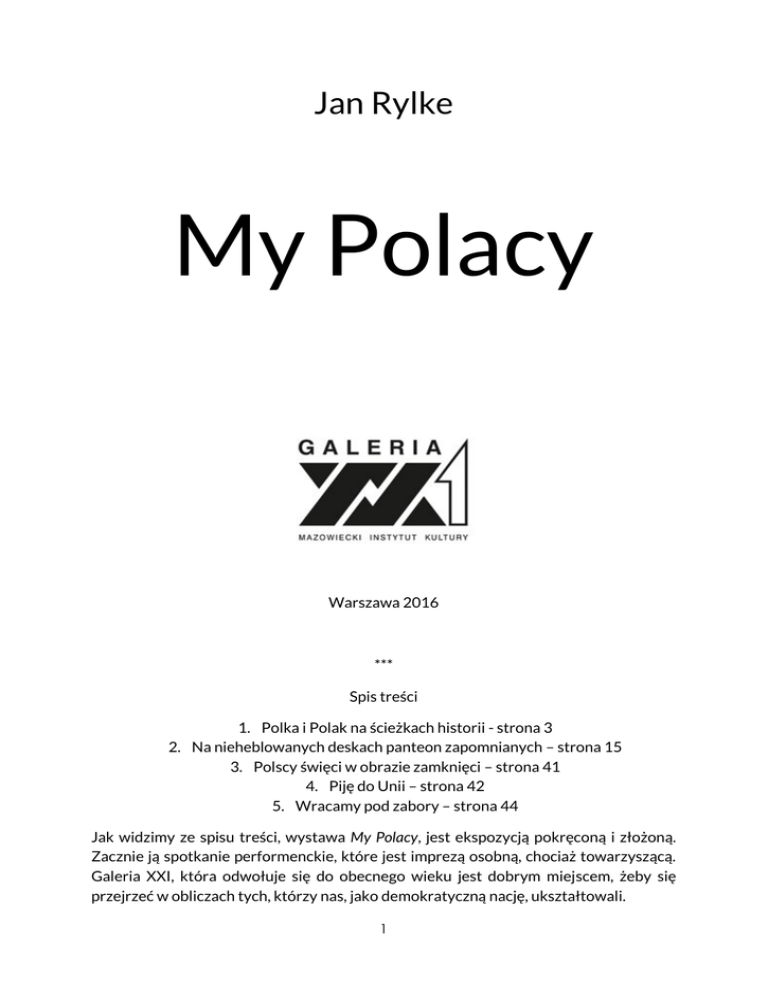 Jan Rylke My Polacy Warszawa 2016 *** Spis treści 1. Polka i Polak na ścieżkach historii - strona 3 2. Na nieheblowanych deskach panteon zapomnianych – strona 15 3. Polscy święci w obrazie zamknięci – strona 41 4. Piję do Unii – strona 42 5. Wracamy pod zabory – strona 44 Jak widzimy ze spisu treści, wystawa My Polacy, jest ekspozycją pokręconą i złożoną. Zacznie ją spotkanie performenckie, które jest imprezą osobną, chociaż towarzyszącą. Galeria XXI, która odwołuje się do obecnego wieku jest dobrym miejscem, żeby się przejrzeć w obliczach tych, którzy nas, jako demokratyczną nację, ukształtowali. 1 Galerię XXI prowadzą: Ryszard Ługowski – kurator programowy Eliza Nadulska Druk: Fabryka Druku, ul. Staniewicka 18, Warszawa ISBN: 978-83-63427-66-5 2 Polka i Polak na ścieżkach historii Obrazy z cyklu: Polka i Polak na ścieżkach historii powstały pod wpływem manifestacji kibiców Mistrzostw Europy w piłce nożnej, które odbyły się w 2012 roku. Chociaż drużyna narodowa nie osiągnęła w tych mistrzostwach sukcesu, kibice w szalikach z orłem poczuli więź narodową. Zauważalne u kibiców swobodne podejście do powiązań przyczyn i skutków nasunął mi myśl, że mogę włączyć w swoich obrazach rodaków w różne istotne wydarzenia historyczne. Nie na wszystkie wydarzenia miałem pomysł, ale te, które wykorzystałem, zamknęły się w liczbie dziesięciu, co uznałem za znak, że jest to seria wystarczająca. Obrazy namalowałem w wymiarze 81x100cm, to znaczy mają format rozszerzonego plakatu. Układ pionowy prostokątnego obrazu jest dostosowany do umieszczenia sceny figuralnej o niewielkiej liczbie uczestników. Klasyczny format plakatu został opracowany dla obrazu stabilnego; jego rozszerzenie o 10 centymetrów pozwala na wprowadzenie do przedstawianych scen bardziej dynamicznej akcji. Każdy z obrazów poprzedziły szkice, w których zawiązywałem akcję (dwa ze szkiców pokazuję poniżej). Potem zbierałem, lub wykonywałem, zdjęcia do tła i postaci występujących na obrazie. Z tła i postaci ustawiałem scenę z właściwą (lub celowo zaburzoną) perspektywą, cieniami etc. Kolejnym etapem było opracowanie kolorystyki przy pomocy farb akrylowych. Na farby akrylowe nakładałem farby olejno-wodne bezpośrednio z tub. Z jednej strony nałożone grudy farby zacierały realizm rysunku, pozostawiając obszar dla wyobraźni, z drugiej strony struktura impasto nałożonych kolorów podstawowych wzmacnia emocjonalne oddziaływanie obrazu. W większości wypadków obrazom towarzyszy krótki tekst. Obraz wyposażony w tekst, podobnie jak historyczne wizerunki z Dalekiego Wschodu, czy współczesne graffiti, oddziałują obok obrazu także słowem, co angażuje większe obszary naszego mózgu. Na koniec oprawienie obrazów w listwy o barwach narodowych stworzyły z obrazów jednolity, odwołujący się do patriotyzmu, cykl. Szkice do obrazu Polak dyskutuje z Sokratesem 3 Raj A gdy kobieta zauważyła, że drzewo to ma owoce dobre do jedzenia i że były miłe dla oczu, i godne pożądania dla zdobycia mądrości, zerwała z niego owoc i jadła. Dała też mężowi swojemu, który był z nią, i on też jadł. Wojciech Dembołęcki twierdził, że Polacy są najstarszym z narodów, że po polsku mówili Adam i Ewa, a łacina i wszystkie języki europejskie to tylko zniekształcona polszczyzna. Wzór dla Adama zaczerpnąłem z antycznej rzeźby, dla Ewy z rysunku Fragonarda, dla Polki z Internetu. Drzewo i węża wziąłem z głowy. Polka podająca jabłko Adamowi (grzech jest pod skórką; obiorę ci jabłko). Akryl i olej, płótno, 81x100cm, 2012 4 Ateny W Atenach żył wtedy jeszcze także inny znany człowiek, imieniem Sokrates. Chodził on po mieście na bosaka i kazał ludziom precyzować, co dokładnie mają na myśli. Nauczał też, że dobre życie polega na tym, aby być dobrym, oraz że cnota jest wiedzą, a wiedza cnotą. Jak napisał w internetowym blogu Polski Emeryt – Sokrates: Super wyczyn Polaków! Jako pierwsi ludzie w historii zdobyli Mount Everest w klapkach! W tle obrazu widzimy trzy gracje, czyli antyk w marmurze; Sokrates siedzi w pozie myśliciela, do postaci Polaka sam pozowałem. Polak dyskutuje z Sokratesem (wiedza to cnota, toż to durnota). Akryl i olej, płótno, 81x100cm, 2012 5 Jerozolima A gdy nastała pora, zajął miejsce przy stole, a apostołowie z nim. I rzekł do nich: Gorąco pragnąłem spożyć tę wieczerzę paschalną z wami przed moją męką; powiadam wam bowiem, iż nie będę już jej spożywał, aż nastąpi spełnienie w Królestwie Bożym. W Polsce przy okrągłym stole pito z Judaszem wódkę. Do Polki pozowała mi córka, do Chrystusa z apostołami syn. Polka nalewająca wino na Ostatniej Wieczerzy (śmiało! Pij krew, jedz ciało). Akryl i olej, płótno, 81x100cm, 2012 6 Rzym W 455 roku Wandalowie pod wodzą Genzeryka zdobywają i łupią Rzym. Jak pisał Dzierzwa: Polacy pochodzą z rodu Jafeta, syna Noego (…) Alanus — który jako pierwszy przybył do Europy — zrodził Negnona, Negnon zaś zrodził czterech synów, z których pierworodnym był Wandal, od którego wywodzą się Wandalici, zwani obecnie Polakami. W tle rekonstrukcja płonącego Forum Romanum. Wandalowie są wzorowani na mongolskich zapaśnikach a pozy Rzymianek wziąłem z secesyjnych malowideł. Polak zdobywa z Wandalami Rzym (Wandal rujnuje, Polak szabruje). Akryl i olej, płótno, 81x100cm, 2013 7 Medyna W Medynie objawione zostały sury medyńskie Koranu. Na miejscu domu, w którym mieszkał Mahomet powstał meczet, w którym obok grobu proroka znajduje się również grób jego córki, Fatimy. Groby te są celem pielgrzymek setek tysięcy muzułmanów. W tle centrum Medyny. Polka występuje w stroju wzorowanym na kostiumie Miss Arabii. Polka oprowadza Mahometa po Medynie (plac szeroki zmieści zwłoki). Akryl i olej, płótno, 81x100cm, 2013 8 Ameryka W 1492 roku Krzysztof Kolumb dotarł do wy