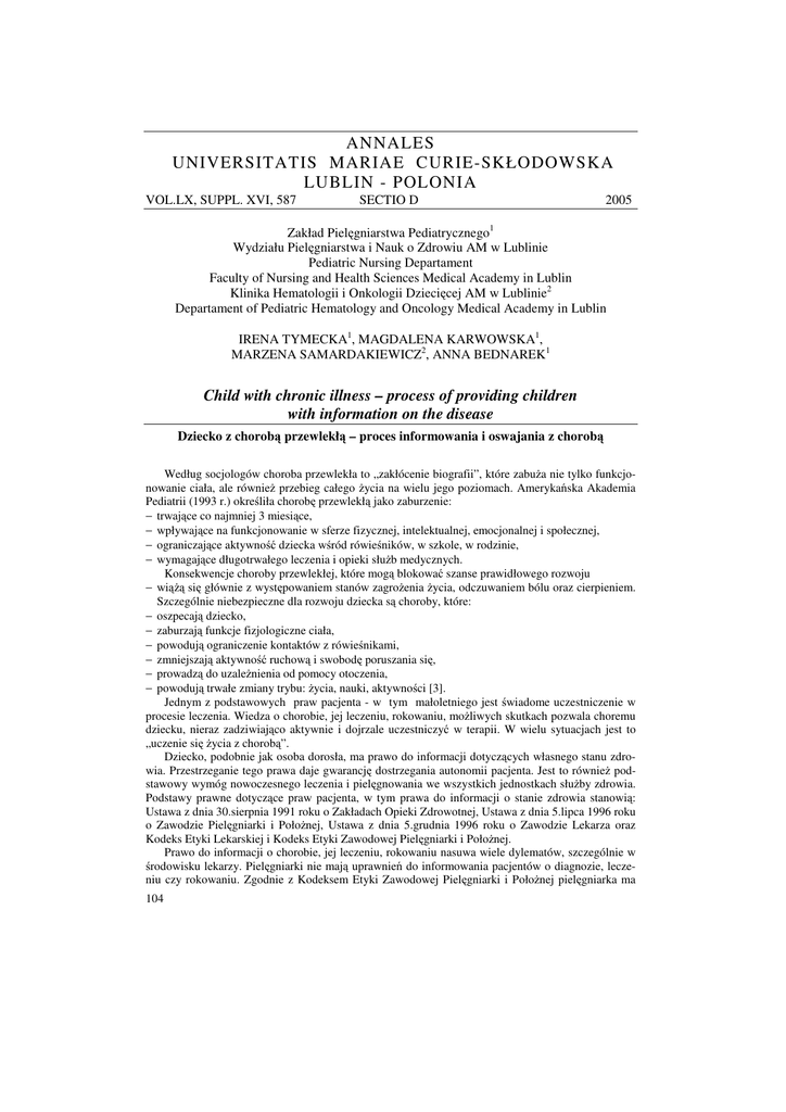ANNALES UNIVERSITATIS MARIAE CURIE-SKŁODOWSKA LUBLIN - POLONIA VOL.LX, SUPPL. XVI, 587 SECTIO D 2005 Zakład Pielęgniarstwa Pediatrycznego1 Wydziału Pielęgniarstwa i Nauk o Zdrowiu AM w Lublinie Pediatric Nursing Departament Faculty of Nursing and Health Sciences Medical Academy in Lublin Klinika Hematologii i Onkologii Dziecięcej AM w Lublinie2 Departament of Pediatric Hematology and Oncology Medical Academy in Lublin IRENA TYMECKA1, MAGDALENA KARWOWSKA1, MARZENA SAMARDAKIEWICZ2, ANNA BEDNAREK1 Child with chronic illness – process of providing children with information on the disease Dziecko z chorobą przewlekłą – proces informowania i oswajania z chorobą Według socjologów choroba przewlekła to „zakłócenie biografii”, które zabuża nie tylko funkcjonowanie ciała, ale również przebieg całego życia na wielu jego poziomach. Amerykańska Akademia Pediatrii (1993 r.) określiła chorobę przewlekłą jako zaburzenie: − trwające co najmniej 3 miesiące, − wpływające na funkcjonowanie w sferze fizycznej, intelektualnej, emocjonalnej i społecznej, − ograniczające aktywność dziecka wśród rówieśników, w szkole, w rodzinie, − wymagające długotrwałego leczenia i opieki służb medycznych. Konsekwencje choroby przewlekłej, które mogą blokować szanse prawidłowego rozwoju − wiążą się głównie z występowaniem stanów zagrożenia życia, odczuwaniem bólu oraz cierpieniem. Szczególnie niebezpieczne dla rozwoju dziecka są choroby, które: − oszpecają dziecko, − zaburzają funkcje fizjologiczne ciała, − powodują ograniczenie kontaktów z rówieśnikami, − zmniejszają aktywność ruchową i swobodę poruszania się, − prowadzą do uzależnienia od pomocy otoczenia, − powodują trwałe zmiany trybu: życia, nauki, aktywności [3]. Jednym z podstawowych praw pacjenta - w tym małoletniego jest świadome uczestniczenie w procesie leczenia. Wiedza o chorobie, jej leczeniu, rokowaniu, możliwych skutkach pozwala choremu dziecku, nieraz zadziwiająco aktywnie i dojrzale uczestniczyć w terapii. W wielu sytuacjach jest to „uczenie się życia z chorobą”. Dziecko, podobnie jak osoba dorosła, ma prawo do informacji dotyczących własnego stanu zdrowia. Przestrzeganie tego prawa daje gwarancję dostrzegania autonomii pacjenta. Jest to również podstawowy wymóg nowoczesnego leczenia i pielęgnowania we wszystkich jednostkach służby zdrowia. Podstawy prawne dotyczące praw pacjenta, w tym prawa do informacji o stanie zdrowia stanowią: Ustawa z dnia 30.sierpnia 1991 roku o Zakładach Opieki Zdrowotnej, Ustawa z dnia 5.lipca 1996 roku o Zawodzie Pielęgniarki i Położnej, Ustawa z dnia 5.grudnia 1996 roku o Zawodzie Lekarza oraz Kodeks Etyki Lekarskiej i Kodeks Etyki Zawodowej Pielęgniarki i Położnej. Prawo do informacji o chorobie, jej leczeniu, rokowaniu nasuwa wiele dylematów, szczególnie w środowisku lekarzy. Pielęgniarki nie mają uprawnień do informowania pacjentów o diagnozie, leczeniu czy rokowaniu. Zgodnie z Kodeksem Etyki Zawodowej Pielęgniarki i Położnej pielęgniarka ma 104 natomiast obowiązek informowania (adekwatnie do wieku i percepcji dziecka) o wszystkich wykonywanych czynnościach pielęgnacyjnych oraz ich oddziaływaniu na stan dziecka oraz udzielenia informacji dotyczących diagnozy pielęgniarskiej oraz dalszych etapów procesu pielęgnowania [9]. Proces informowania dziecka oraz jego bliskich rozpoczyna się już w momencie przyjmowania do szpitala. Wtedy to pacjenci powinni zostać poinformowani o swoich prawach, regulaminie oddziału, możliwości pobytu rodziny w oddziale oraz jej zadaniach. Problem informowania chorego dziecka jest szczególnie trudny i jeszcze bardziej skomplikowany w sytuacji choroby przewlekłej, o poważnym rokowaniu. Ze względu na niedojrzałość fizyczną, psychiczną i emocjonalną dziecka oraz ograniczoną możliwość percepcji (zwłaszcza w stresie) opieka nad dzieckiem wymaga ogromnej wiedzy i dojrzałości zawodowej personelu. Musi opierać się na zaufaniu, dobrym kontakcie z dzieckiem i jego bliskimi oraz na właściwym przepływie informacji. Dlatego też informowanie małego pacjenta o jego chorobie powinno być „zorganizowane”, przemyślane, a całość musi stanowić proces rozłożony w czasie [8]. Informowanie dziecka oraz rodziców ma na celu: − wyjaśnienie wszystkich wątpliwości odnośnie stanu zdrowia, − zapewnienie komfortu psychicznego, zwłaszcza w czasie pobytu w szpitalu, − ochronę przed niepotrzebnymi stresami i błędami jatrogennymi, − mobilizację i przygotowanie dziecka, jego bliskich do trudnego i często długiego okresu leczenia, walki o zdrowie, − akceptację i przystosowanie do życia z chorobą, niekiedy na całe życie [10]. Przepływ informacji pomiędzy wszystkimi członkami zespołu terapeutycznego powinien być szczególnie wyważony, przedyskutowany i starannie zaplanowany. W oddziałach, w których hospitalizowani są pacjenci z choroba przewlekłą (zwłaszcza ci hospitalizowani pierwszy raz) powinny istnieć procedury informowania i oswajania pacjenta wraz ze sprecyzowaniem kto, kiedy, w jakim zakresie, na jakim etapie ma udzielać informacji. Pielęgniarka, jako ta osoba, która spędza z dzieckiem i jego bliskimi najwięcej czasu, powinna wiedzieć na jakim etapie „procesu informowania” znajduje się dziecko. Często zdarza się, że pielęgniarki zbywają dziecko oraz rodziców milczeniem. Może to wynikać na przykład z faktu braku wiedzy, nieprzygotowania do rozmów lub zakazu rozmawiania z pacjentami o stanie ich zdrowia. W takich sytuacjach pielęgniarki nie mogą wykorzystywać swoich możliwości psychoterapeutycznego oddziaływania, minimalizowania lęku i frustracji związanych z chorobą i hospitalizacją. Nawet, jeśli w oddziałach zatrudniony jest psycholog kliniczny, to nie ma on tak częstego kontaktu z dziećmi i ich rodzinami. Słynna pielęgniarka June Jolly – twórczyni podwalin