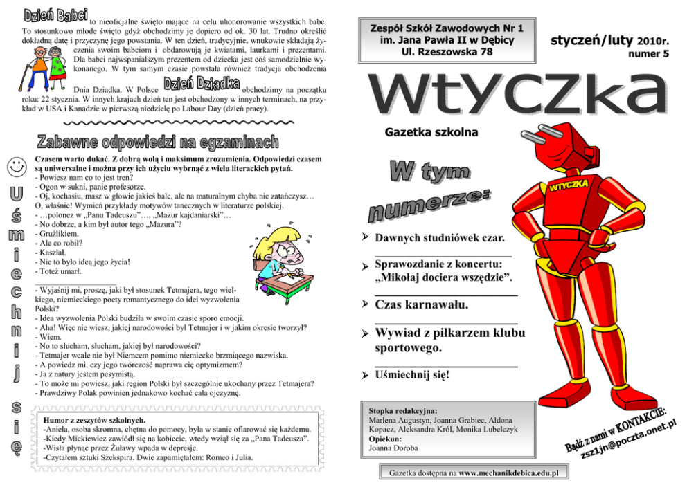 to nieoficjalne święto mające na celu uhonorowanie wszystkich babć. To stosunkowo młode święto gdyż obchodzimy je dopiero od ok. 30 lat. Trudno określić dokładną datę i przyczynę jego powstania. W ten dzień, tradycyjnie, wnukowie składają życzenia swoim babciom i obdarowują je kwiatami, laurkami i prezentami. Dla babci najwspanialszym prezentem od dziecka jest coś samodzielnie wykonanego. W tym samym czasie powstała również tradycja obchodzenia Zespół Szkół Zawodowych Nr 1 im. Jana Pawła II w Dębicy Ul. Rzeszowska 78 styczeń/luty 2010r. numer 5 Dnia Dziadka. W Polsce obchodzimy na początku roku: 22 stycznia. W innych krajach dzień ten jest obchodzony w innych terminach, na przykład w USA i Kanadzie w pierwszą niedzielę po Labour Day (dzień pracy). Gazetka szkolna Czasem warto dukać. Z dobrą wolą i maksimum zrozumienia. Odpowiedzi czasem są uniwersalne i można przy ich użyciu wybrnąć z wielu literackich pytań. - Powiesz nam co to jest tren? - Ogon w sukni, panie profesorze. - Oj, kochasiu, masz w głowie jakieś bale, ale na maturalnym chyba nie zatańczysz… O, właśnie! Wymień przykłady motywów tanecznych w literaturze polskiej. - …polonez w „Panu Tadeuszu”…, „Mazur kajdaniarski”… - No dobrze, a kim był autor tego „Mazura”? - Gruźlikiem. - Ale co robił? - Kaszlał. - Nie to było ideą jego życia! - Toteż umarł. ____________________ - Wyjaśnij mi, proszę, jaki był stosunek Tetmajera, tego wielkiego, niemieckiego poety romantycznego do idei wyzwolenia Polski? - Idea wyzwolenia Polski budziła w swoim czasie sporo emocji. - Aha! Więc nie wiesz, jakiej narodowości był Tetmajer i w jakim okresie tworzył? - Wiem. - No to słucham, słucham, jakiej był narodowości? - Tetmajer wcale nie był Niemcem pomimo niemiecko brzmiącego nazwiska. - A powiedz mi, czy jego twórczość naprawa cię optymizmem? - Ja z natury jestem pesymistą. - To może mi powiesz, jaki region Polski był szczególnie ukochany przez Tetmajera? - Prawdziwy Polak powinien jednakowo kochać cała ojczyznę. Humor z zeszytów szkolnych. -Aniela, osoba skromna, chętna do pomocy, była w stanie ofiarować się każdemu. -Kiedy Mickiewicz zawiódł się na kobiecie, wtedy wziął się za „Pana Tadeusza”. -Wisła płynąc przez Żuławy wpada w depresje. -Czytałem sztuki Szekspira. Dwie zapamiętałem: Romeo i Julia. Dawnych studniówek czar. ________________________ Sprawozdanie z koncertu: „Mikołaj dociera wszędzie”. _________________________ Czas karnawału. _________________________ Wywiad z piłkarzem klubu sportowego. _________________________ Uśmiechnij się! Stopka redakcyjna: Marlena Augustyn, Joanna Grabiec, Aldona Kopacz, Aleksandra Król, Monika Lubelczyk Opiekun: Joanna Doroba Gazetka dostępna na www.mechanikdebica.edu.pl @p 1jn zsz oc .pl net o . zta Dawne studniówki odbywały się wyłącznie w szkołach, a ich organizacja i program wymagały zezwolenia dyrekcji. Nie było mowy o makijażu, biżuterii i "cywilnych" strojach. Chłopców obowiązywały białe koszule i czarne spodnie, dziewczęta występowały w białych bluzkach i granatowych spódniczkach. Uczniowie bawili się we własnym gronie. Kiedyś studniówka była w głównej mierze wyczekiwanym wydarzeniem kulturalnym, prezentacją nabytej wiedzy przed szkolnym gremium. Przygotowywano się do niego starannie, bo ambicją każdego rocznika było wpisanie się w historię szkoły w sposób niebanalny. Bufet i zabawa taneczna były raczej sprawą drugorzędną. Do tańca przygrywała własna lub zaproszona szkolna orkiestra, taneczną część zabawy inaugurował polonez, a ulubionymi przez młodzież tańcami były polka i walc. Zabawa kończyła się z wybiciem północy. Być może okres trzech miesięcy został uznany za wystarczający na powtórzenie i doszlifowanie przyswojonych wiadomości. Setny dzień przed egzaminem uznano za ostatni dzień młodzieńczej wolności i ostatniej zabawy pod kuratelą dorosłych. Maturzyści, czyli ludzie światli i już dojrzali przestrzegają pilnie przesądów, które mają im zapewnić powodzenie na maturze. Gdy widmo egzaminów płoszy rozsądek, szare komórki odmawiają współpracy, maturzystę może uratować już tylko magia. ☺ Wielu psychologów jest zdania, że zima może być okresem depresji oraz kiepskiego samopoczucia. Pogoda skłania nas do siedzenia w ciepłym mieszkaniu i odstrasza od wystawienia nosa na mróz. Aktywne spędzanie czasu na świeżym, mroźnym powietrzu może jednak dostarczyć nam wspaniałych wspomnień, umocnić więzi rodzinne oraz dostarczyć wiele radości. Ferie to najmilszy, zimowy okres, wolny od obowiązków życia codziennego. Jednym z atrakcyjnych regionów są góry, a co za tym idzie, możliwość uprawiania sportów zimowych. Istnieje wiele miejscowości, gdzie można udać się na zimowy wypoczynek. Każdy, niezależnie od wieku i zainteresowań, znajdzie coś dla siebie. Bajecznie pięknych, beztrosko ale bezpiecznie spędzonych ferii i udanego wypoczynku życzy redakcja Wtyczki. Karnawał w Rio rusza w tym roku 11. lutego Karnawał w Wenecji powinien odbyć się 16 lutego. W 2010 roku karnawał kończy się 16 lutego i trwa 42 dni. Karnawał to okres zabaw, bali, pochodów noworocznych trwający od Trzech Króli (6 stycznia) do Środy Popielcowej. Niekiedy karnawałem nazywa się jedynie ostatnie dni tego okresu, kiedy to organizowane są huczne parady przebierańców. Nazwa pochodzi od łacińskiego wyrażenia carrus navalis (wóz w kształcie okrętu). Taki wóz, zazwyczaj, prowadził parady w czasie rzymskich bachanalii. Był to okres zabaw przy winie, tańców, biesiad, bali przebierańców i maskarad. Według innej teorii nazwa karnawał pochodzi od łacińskiego słowa carnavale (pożegnanie mięsa), gdyż jest to okres poprzedzający Wielki Post. W tym roku Mikołaj dotarł także do Boliwii, a to za sprawą koncertu charytatywnego. Uczniowie Miejskiego Gimnazju