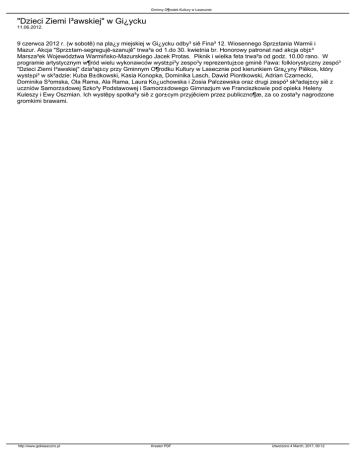Gminny O¶rodek Kultury w Lasecznie "Dzieci Ziemi I³awskiej" w Gi¿ycku 11.06.2012. 9 czerwca 2012 r. (w sobotê) na pla¿y miejskiej w Gi¿ycku odby³ siê Fina³ 12. Wiosennego Sprz±tania Warmii i Mazur. Akcja "Sprz±tam-segregujê-szanujê" trwa³a od 1.do 30. kwietnia br. Honorowy patronat nad akcja obj±³ Marsza³ek Województwa Warmiñsko-Mazurskiego Jacek Protas. Piknik i wielka feta trwa³a od godz. 10.00 rano. W programie artystycznym w¶ród wielu wykonawców wyst±pi³y zespo³y reprezentuj±ce gminê I³awa: folklorystyczny zespó³ "Dzieci Ziemi I³awskiej" dzia³aj±cy przy Gminnym O¶rodku Kultury w Lasecznie pod kierunkiem Gra¿yny Piêkos, który wyst±pi³ w sk³adzie: Kuba B±dkowski, Kasia Konopka, Dominika Lasch, Dawid Piontkowski, Adrian Czarnecki, Dominika S³omska, Ola Rama, Ala Rama, Laura Ko¿uchowska i Zosia Palczewska oraz drugi zespó³ sk³adaj±cy siê z uczniów Samorz±dowej Szko³y Podstawowej i Samorz±dowego Gimnazjum we Franciszkowie pod opiek± Heleny Kuleszy i Ewy Oszmian. Ich wystêpy spotka³y siê z gor±cym przyjêciem przez publiczno¶æ, za co zosta³y nagrodzone gromkimi brawami. http://www.goklaseczno.pl Kreator PDF Utworzono 4 March, 2017, 00:12