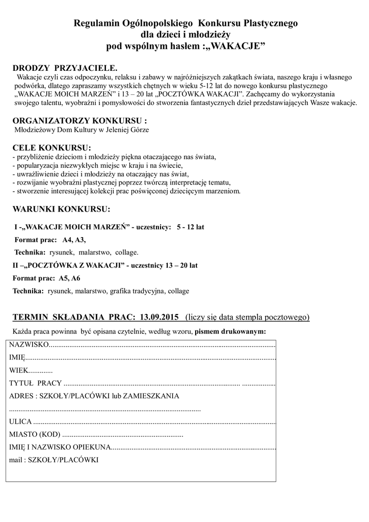 Regulamin Ogólnopolskiego Konkursu Plastycznego dla dzieci i młodzieży pod wspólnym hasłem :„WAKACJE” DRODZY PRZYJACIELE. Wakacje czyli czas odpoczynku, relaksu i zabawy w najróżniejszych zakątkach świata, naszego kraju i własnego podwórka, dlatego zapraszamy wszystkich chętnych w wieku 5-12 lat do nowego konkursu plastycznego „WAKACJE MOICH MARZEŃ” i 13 – 20 lat „POCZTÓWKA WAKACJI”. Zachęcamy do wykorzystania swojego talentu, wyobraźni i pomysłowości do stworzenia fantastycznych dzieł przedstawiających Wasze wakacje. ORGANIZATORZY KONKURSU : Młodzieżowy Dom Kultury w Jeleniej Górze CELE KONKURSU: - przybliżenie dzieciom i młodzieży piękna otaczającego nas świata, - popularyzacja niezwykłych miejsc w kraju i na świecie, - uwrażliwienie dzieci i młodzieży na otaczający nas świat, - rozwijanie wyobraźni plastycznej poprzez twórczą interpretację tematu, - stworzenie interesującej kolekcji prac poświęconej dziecięcym marzeniom. WARUNKI KONKURSU: I -„WAKACJE MOICH MARZEŃ” - uczestnicy: 5 - 12 lat Format prac: A4, A3, Technika: rysunek, malarstwo, collage. II –„POCZTÓWKA Z WAKACJI” - uczestnicy 13 – 20 lat Format prac: A5, A6 Technika: rysunek, malarstwo, grafika tradycyjna, collage TERMIN SKŁADANIA PRAC: 13.09.2015 (liczy się data stempla pocztowego) Każda praca powinna być opisana czytelnie, według wzoru, pismem drukowanym: NAZWISKO......................................................................................................................................... . IMIĘ...................................................................................................................................................... WIEK............. TYTUŁ PRACY ............................................................................................... .................................... ADRES : SZKOŁY/PLACÓWKI lub ZAMIESZKANIA ....................................................................................................... ULICA .................................................................................................................................................. MIASTO (KOD) ................................................................. IMIĘ I NAZWISKO OPIEKUNA....................................................................................................E mail : SZKOŁY/PLACÓWKI - Każda praca może mieć tylko jednego autora – w konkursie nie mogą brać udziału prace zbiorowe. - Nadesłane na konkurs prace nie mogą być zrolowane. - Organizatorzy nie odpowiadają za zniszczenie prac podczas ich przewozu. - Prace niezgodne z regulaminem nie będą brane pod uwagę. -Nadesłanie prac na konkurs oznacza zapoznanie się z regulaminem i jest równoznaczne z wyrażeniem zgody na przetwarzanie danych osobowych na potrzeby konkursu - Nadesłane na konkurs prace nie będą zwracane ich autorom, pozostaną własnością organizatorów, którzy zastrzegają sobie możliwość ich publikowania. -Nagrody uczestnikom spoza Jeleniej Góry prześlemy pocztą. PRACE PROSIMY PRZESYŁAĆ NA ADRES : Młodzieżowy Dom Kultury ul.M.Skłodowskiej-Curie 12 58-500 Jelenia Góra tel. 75-64 24 460 , e-mail: [email protected] www.mdkjelonek.pl z dopiskiem “WAKACJE” Protokół z posiedzenia komisji konkursowej pojawi się na stronie MDK w dniach 28 – 30 września 2015r. WAŻNE!!!! PRZYJMUJEMY RÓWNIEŻ PRACE INDYWIDUALNE
