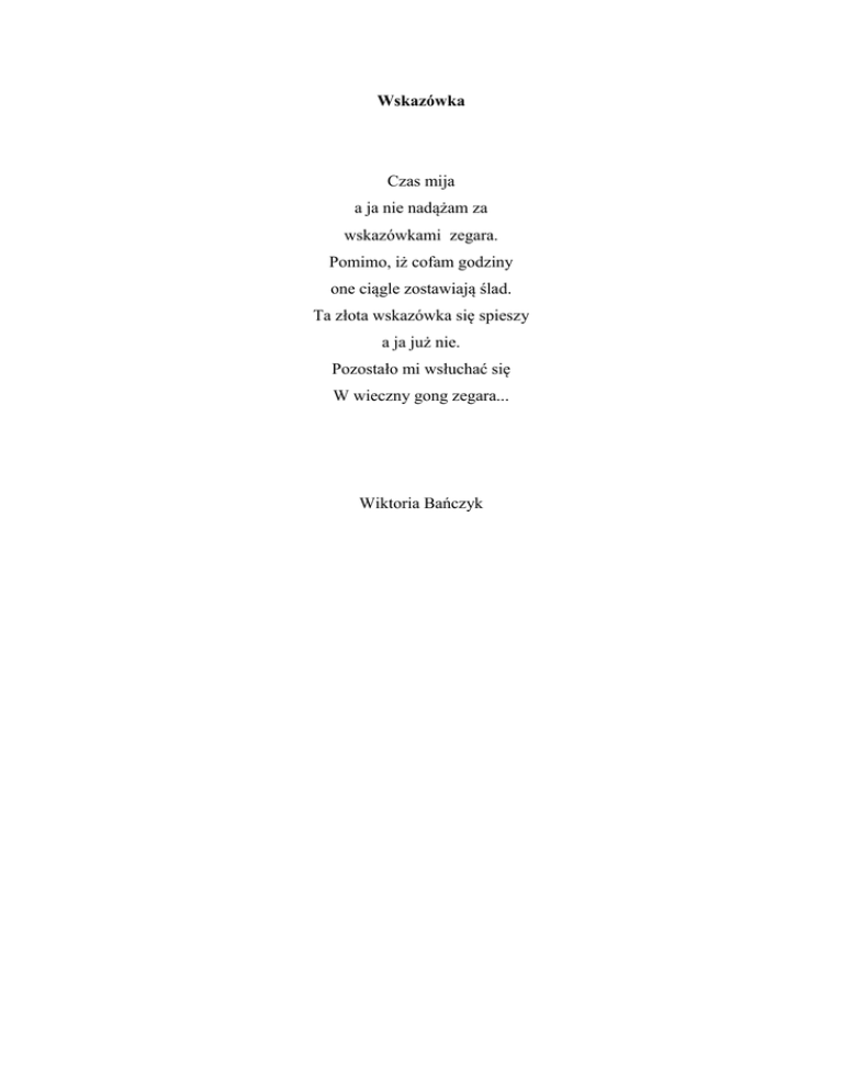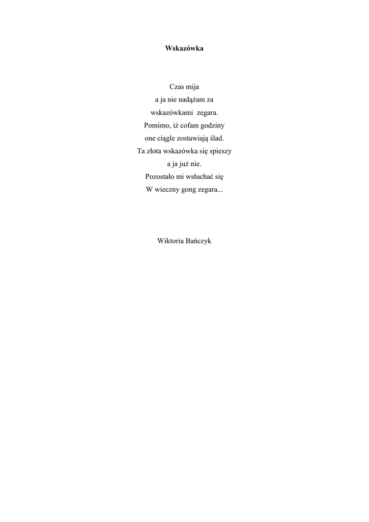 Wskazówka Czas mija a ja nie nadążam za wskazówkami zegara. Pomimo, iż cofam godziny one ciągle zostawiają ślad. Ta złota wskazówka się spieszy a ja już nie. Pozostało mi wsłuchać się W wieczny gong zegara... Wiktoria Bańczyk