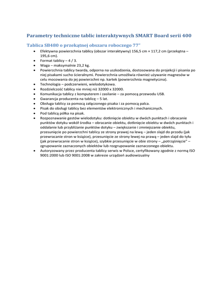 Parametry techniczne tablic interaktywnych SMART Board serii 400 Tablica SB480 o przekątnej obszaru roboczego 77” • • • • • • • • • • • • • Efektywna powierzchnia tablicy (obszar interaktywny) 156,5 cm × 117,2 cm (przekątna – 195,6 cm). Format tablicy – 4 / 3. Waga – maksymalnie 23,2 kg. Powierzchnia tablicy twarda, odporna na uszkodzenia, dostosowana do projekcji i pisania po niej pisakami sucho ścieralnymi. Powierzchnia umożliwia również używanie magnesów w celu mocowania do jej powierzchni np. kartek (powierzchnia magnetyczna). Technologia – podczerwieni, wielodotykowa. Rozdzielczość tablicy nie mniej niż 32000 x 32000. Komunikacja tablicy z komputerem i zasilanie – za pomocą przewodu USB. Gwarancja producenta na tablicę – 5 lat. Obsługa tablicy za pomocą załączonego pisaka i za pomocą palca. Pisak do obsługi tablicy bez elementów elektronicznych i mechanicznych. Pod tablicą półka na pisak. Rozpoznawanie gestów wielodotyku: dotknięcie obiektu w dwóch punktach i obracanie punktów dotyku wokół środka – obracanie obiektu, dotknięcie obiektu w dwóch punktach i oddalanie lub przybliżanie punktów dotyku – zwiększanie i zmniejszanie obiektu, przesunięcie po powierzchni tablicy ze strony prawej na lewą – jeden slajd do przodu (jak przewracanie stron w książce), przesunięcie ze strony lewej na prawą – jeden slajd do tyłu (jak przewracanie stron w książce), szybkie przesunięcie w obie strony – „potrząśnięcie” – zgrupowanie zaznaczonych obiektów lub rozgrupowanie zaznaczonego obiektu. Autoryzowany przez producenta tablicy serwis w Polsce, certyfikowany zgodnie z normą ISO 9001:2000 lub ISO 9001:2008 w zakresie urządzeń audiowizualny