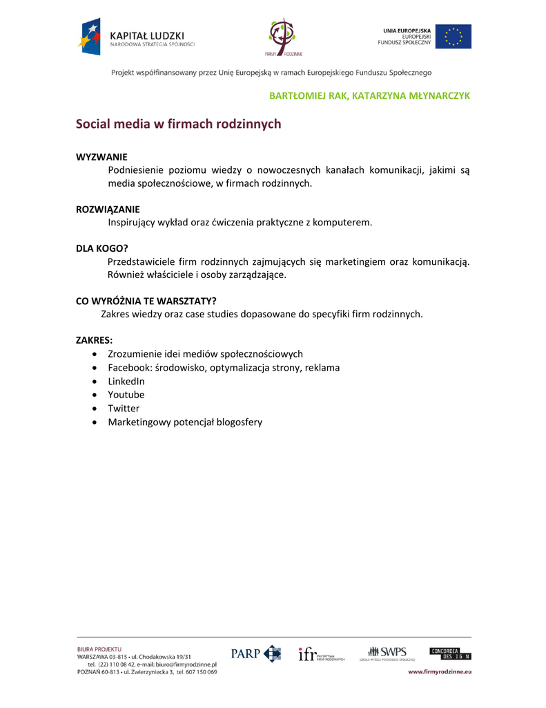 BARTŁOMIEJ RAK, KATARZYNA MŁYNARCZYK Social media w firmach rodzinnych WYZWANIE Podniesienie poziomu wiedzy o nowoczesnych kanałach komunikacji, jakimi są media społecznościowe, w firmach rodzinnych. ROZWIĄZANIE Inspirujący wykład oraz ćwiczenia praktyczne z komputerem. DLA KOGO? Przedstawiciele firm rodzinnych zajmujących się marketingiem oraz komunikacją. Również właściciele i osoby zarządzające. CO WYRÓŻNIA TE WARSZTATY? Zakres wiedzy oraz case studies dopasowane do specyfiki firm rodzinnych. ZAKRES: Zrozumienie idei mediów społecznościowych Facebook: środowisko, optymalizacja strony, reklama LinkedIn Youtube Twitter Marketingowy potencjał blogosfery