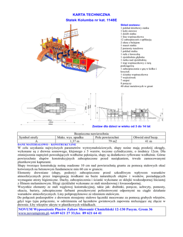 KARTA TECHNICZNA Statek Kolumba nr kat. 1148E Skład zestawu: 1 pokład dziobowy statku 1 koło sterowe 1 dziób statku 1 lina wspinaczkowa 12 zabezpieczeń z aplikacją 2 okna z bulajem 1 maszt statku 2 pomosty tunelowe 1 pokład statku 1 rufa z ławeczką 1 zjeżdżalnia głęboka 1 rurka nad zjeżdżalnią 1 trap wspinaczkowy z rurą podciągową 1 zabezpieczenie z grą w kółko i krzyżyk 1 ścianka wspinaczkowa 7 wejściówek 7 stopni 8 poręczy 40 okuć metalowych w grunt Zestaw dla dzieci w wieku od 3 do 14 lat Symbol strefy A Bezpieczna nawierzchnia Maks. wys. upadku Pole powierzchni 1,37 m 79 m2 Obwód stref bezp. 41 m DANE MATERIAŁOWO – KONSTRUKCYJNE W celu uzyskania najwyższych parametrów wytrzymałościowych, słupy nośne mają przekrój okrągły, wykonane są z drewna sosnowego, klejonego z 5 warstw, toczone cylindrycznie, o średnicy 12cm. Dla zmniejszenia naprężeń powodujących wzdłużne pęknięcia, słupy są dodatkowo ryflowane wzdłużnie. Górne powierzchnie słupów konstrukcyjnych zabezpieczone przed nasiąkaniem, trwale zamocowanymi plastikowymi kapturami. Słupy tworzące konstrukcję nośną osadzone 10 cm nad powierzchnią gruntu za pomocą stalowych okuć kotwionych na betonowym fundamencie min 60 cm w gruncie. Elementy drewniane (słupy, podesty) zabezpieczone przed szkodliwym wpływem warunków atmosferycznych przez impregnację środkami na bazie naturalnych olejów i wosków, posiadających wymagane atesty higieniczne. Dachy, zabezpieczenia i ścianki wykonane ze sklejki wodoodpornej liściastej z filmem melaminowym. Ślizgi zjeżdżalni wykonane ze stali nierdzewnej i kwasoodpornej. Wszystkie elementy ze stali węglowej konstrukcyjnej, takie jak: drabinki, poręcze, uchwyty, pomosty, okucia, bariery, zabezpieczone farbami proszkowymi poliestrowymi odpornymi na ciągłe działanie warunków atmosferycznych. Liny polipropylenowe ze rdzeniem stalowym. Do połączeń podzespołów z drewnem stosujemy stalowe łączniki mocowane za pomocą grubych wkrętów, gdyż tego typu połączenie, w odróżnieniu od łączników gwintowych zapewnia nieluzujące się złącze w drewnie. Łby wkrętów ukryte w plastikowych wkładkach. NOVUM Wyposażenie Placów Zabaw Sławomir Chmieliński 12-130 Pasym. Grom 36 www.novumgrom.pl, tel.89 621 27 33,fax 89 621 64 41