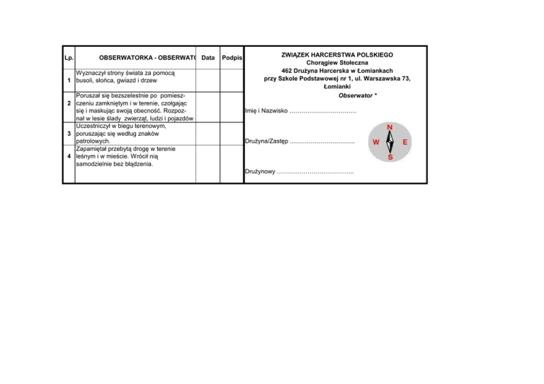 Lp. OBSERWATORKA - OBSERWATORData * Wyznaczył strony świata za pomocą 1 busoli, słońca, gwiazd i drzew Poruszał się bezszelestnie po pomiesz2 czeniu zamkniętym i w terenie, czołgając się i maskując swoją obecność. Rozpoznał w lesie ślady zwierząt, ludzi i pojazdów Uczestniczył w biegu terenowym, 3 poruszając się według znaków patrolowych. Zapamiętał przebytą drogę w terenie 4 leśnym i w mieście. Wrócił nią samodzielnie bez błądzenia. Podpis ZWIĄZEK HARCERSTWA POLSKIEGO Chorągiew Stołeczna 462 DruŜyna Harcerska w Łomiankach przy Szkole Podstawowej nr 1, ul. Warszawska 73, Łomianki Obserwator * Imię i Nazwisko …………………………… DruŜyna/Zastęp ………………………….. DruŜynowy ………………………………..