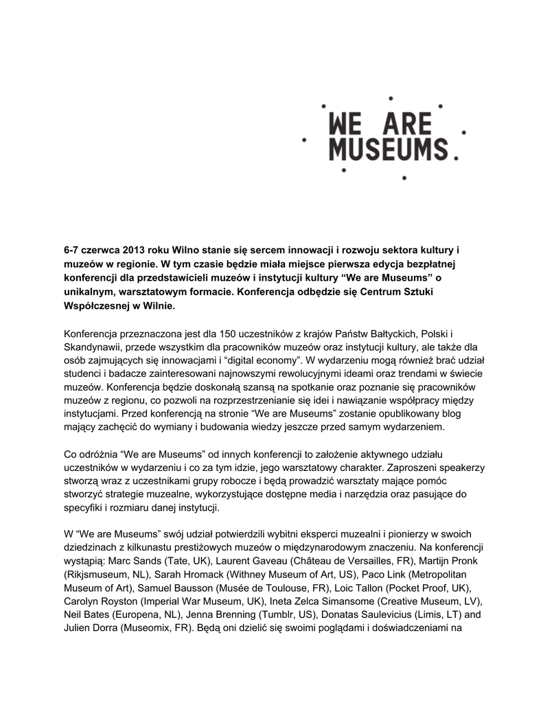 67 czerwca 2013 roku Wilno stanie się sercem innowacji i rozwoju sektora kultury i muzeów w regionie. W tym czasie będzie miała miejsce pierwsza edycja bezpłatnej konferencji dla przedstawicieli muzeów i instytucji kultury “We are Museums” o unikalnym, warsztatowym formacie. Konferencja odbędzie się Centrum Sztuki Współczesnej w Wilnie. Konferencja przeznaczona jest dla 150 uczestników z krajów Państw Bałtyckich, Polski i Skandynawii, przede wszystkim dla pracowników muzeów oraz instytucji kultury, ale także dla osób zajmujących się innowacjami i “digital economy”. W wydarzeniu mogą również brać udział studenci i badacze zainteresowani najnowszymi rewolucyjnymi ideami oraz trendami w świecie muzeów. Konferencja będzie doskonałą szansą na spotkanie oraz poznanie się pracowników muzeów z regionu, co pozwoli na rozprzestrzenianie się idei i nawiązanie współpracy między instytucjami. Przed konferencją na stronie “We are Museums” zostanie opublikowany blog mający zachęcić do wymiany i budowania wiedzy jeszcze przed samym wydarzeniem. Co odróżnia “We are Museums” od innych konferencji to założenie aktywnego udziału uczestników w wydarzeniu i co za tym idzie, jego warsztatowy charakter. Zaproszeni speakerzy stworzą wraz z uczestnikami grupy robocze i będą prowadzić warsztaty mające pomóc stworzyć strategie muzealne, wykorzystujące dostępne media i narzędzia oraz pasujące do specyfiki i rozmiaru danej instytucji. W “We are Museums” swój udział potwierdzili wybitni eksperci muzealni i pionierzy w swoich dziedzinach z kilkunastu prestiżowych muzeów o międzynarodowym znaczeniu. Na konferencji wystąpią: Marc Sands (Tate, UK), Laurent Gaveau (Château de Versailles, FR), Martijn Pronk (Rikjsmuseum, NL), Sarah Hromack (Withney Museum of Art, US), Paco Link (Metropolitan Museum of Art), Samuel Bausson (Musée de Toulouse, FR), Loic Tallon (Pocket Proof, UK), Carolyn Royston (Imperial War Museum, UK), Ineta Zelca Simansome (Creative Museum, LV), Neil Bates (Europena, NL), Jenna Brenning (Tumblr, US), Donatas Saulevicius (Limis, LT) and Julien Dorra (Museomix, FR). Będą oni dzielić się swoimi poglądami i doświadczeniami na temat sposobów angażowania publiczności muzealnej i budowania muzeów o partycypacyjnym charakterze. “We are Museums” to całkowicie bezpłatna konferencja, działająca na zasadzie “zapłać ile chcesz”. Całe wydarzenie będzie odbywało się wyłącznie w języku angielskim. Ze względu na ogarniczoną ilość uczestników, sugerujemy jak najszybsze zarejestrowanie się na stronie konferencji. Rejestracja otwarta zostanie 18 Marca. We are Museums organizowane jest przez Buzzeum, francuską agencję nowych mediów i komunikacji ukierunkowaną na muzea i instytucje kultury. Polskim partnerem konferencji jest firma Moiseum specjalizująca się w rozwiązaniach technologicznych dla kultury. We are Museums jest wspierane przez British Council, Institut Francais, the Contemporary Art Centre of Vilnius (SMC), the Vilnius College of Design, Tumblr i Novius. Informacje: Kontakt dla prasy: [email protected] Strona internetowwa: www.wearemuseums.com Facebook: www.facebook.com/wearemuseums Twitter hashtag: #wearemuseums