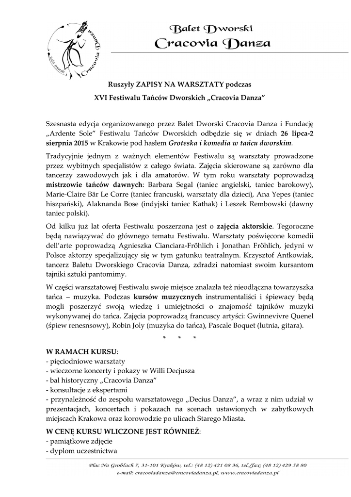 Ruszyły ZAPISY NA WARSZTATY podczas XVI Festiwalu Tańców Dworskich „Cracovia Danza” Szesnasta edycja organizowanego przez Balet Dworski Cracovia Danza i Fundację „Ardente Sole” Festiwalu Tańców Dworskich odbędzie się w dniach 26 lipca-2 sierpnia 2015 w Krakowie pod hasłem Groteska i komedia w tańcu dworskim. Tradycyjnie jednym z ważnych elementów Festiwalu są warsztaty prowadzone przez wybitnych specjalistów z całego świata. Zajęcia skierowane są zarówno dla tancerzy zawodowych jak i dla amatorów. W tym roku warsztaty poprowadzą mistrzowie tańców dawnych: Barbara Segal (taniec angielski, taniec barokowy), Marie-Claire Bär Le Corre (taniec francuski, warsztaty dla dzieci), Ana Yepes (taniec hiszpański), Alaknanda Bose (indyjski taniec Kathak) i Leszek Rembowski (dawny taniec polski). Od kilku już lat oferta Festiwalu poszerzona jest o zajęcia aktorskie. Tegoroczne będą nawiązywać do głównego tematu Festiwalu. Warsztaty poświęcone komedii dell’arte poprowadzą Agnieszka Cianciara-Fröhlich i Jonathan Fröhlich, jedyni w Polsce aktorzy specjalizujący się w tym gatunku teatralnym. Krzysztof Antkowiak, tancerz Baletu Dworskiego Cracovia Danza, zdradzi natomiast swoim kursantom tajniki sztuki pantomimy. W części warsztatowej Festiwalu swoje miejsce znalazła też nieodłączna towarzyszka tańca – muzyka. Podczas kursów muzycznych instrumentaliści i śpiewacy będą mogli poszerzyć swoją wiedzę i umiejętności o znajomość tajników muzyki wykonywanej do tańca. Zajęcia poprowadzą francuscy artyści: Gwinnevivre Quenel (śpiew renesnsowy), Robin Joly (muzyka do tańca), Pascale Boquet (lutnia, gitara). * * * W RAMACH KURSU: - pięciodniowe warsztaty - wieczorne koncerty i pokazy w Willi Decjusza - bal historyczny „Cracovia Danza” - konsultacje z ekspertami - przynależność do zespołu warsztatowego „Decius Danza”, a wraz z nim udział w prezentacjach, koncertach i pokazach na scenach ustawionych w zabytkowych miejscach Krakowa oraz korowodzie po ulicach Starego Miasta. W CENĘ KURSU WLICZONE JEST RÓWNIEŻ: - pamiątkowe zdjęcie - dyplom uczestnictwa - zwiedzanie Krakowa z przewodnikiem (sobota 1.08.2015) - bezpłatny wstęp na spektakle biletowane KOSZT UCZESTNICTWA Cena jednego kursu: 290 PLN* Cena zajęć dla dzieci: 180 PLN* *ZNIŻKA!!! 1. Osoby zapisujące się na 3 kursy i więcej 2. Osoby uczestniczące w warsztatach po raz trzeci i więcej płacą za jeden kurs tylko 200 PLN, a za zajęcia dla dzieci 160 PLN ZALICZKA Zaliczka za udział w warsztatach wynosi 100 PLN/osobę, płatna do 10.07.2015. Druga część wpłaty za udział w warsztatach płatna przelewem lub gotówką bezpośrednio przed rozpoczęciem warsztatów. Istnieje również możliwość wpłaty za całość warsztatów. DANE DO WPŁATY W PLN 74 8589 0006 0000 0011 0044 0002 Bank Spółdzielczy Rzemiosła w Krakowie Fundacja „Ardente Sole” al. Krasińskiego 20/9 30-101 Kraków W tytule: „Opłata za warsztaty: imię i nazwisko uczestnika warsztatów” Zgłoszenia wraz z dowodem wpłaty zaliczki prosimy przesyłać pocztą bądź drogą mailową (na adres [email protected]) do 10.07.2015. Szczegółowe informacje na temat warsztatów można znaleźć na stronie internetowej Festiwalu w zakładce Warsztaty (http://cracoviadanza.pl/pl,kursy)