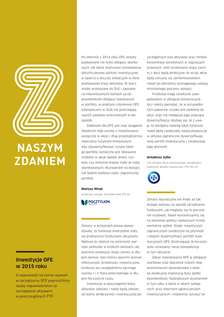 17 Z NASZYM ZDANIEM Po reformie z 2014 roku OFE zostały szczególnych klas aktywów oraz limitów pozbawione nie tylko obligacji skarbo- koncentracji określonych w regulacjach wych, ale także możliwości prowadzenia prawnych. Jeśli oczekiwane stopy zwro- dotychczasowej polityki inwestycyjnej tu z akcji będą atrakcyjne, to wciąż akcje w oparciu o decyzje alokacyjne w dwie będą cieszyły się zainteresowaniem, podstawowe klasy aktywów. W teorii nawet po obniżeniu wymaganego ustawą środki przekazane do ZUS i zapisane minimalnego poziomu alokacji. na indywidualnych kontach są od- Fundusze mogą zwiększać zaan- powiednikiem obligacji skarbowych gażowanie w obligacje korporacyjne, w portfelu, w praktyce członkowie OFE lecz należy pamiętać, że w przypadku (ubezpieczeni w ZUS) nie postrzegają tych papierów ryzyko jest podobne do swoich zasobów emerytalnych w ten akcji, więc nie następuje jego znacząca sposób. dywersyfikacja. Wydaje się, że z uwa- Zadaniem dla OFE jest więc osiąganie gi na dostępny katalog lokat fundusze dodatnich stóp zwrotu z inwestowania nadal będą zwiększały swoją ekspozycję wyłącznie w akcje i dług przedsiębiorstw w aktywa zagraniczne dywersyfikując obarczony ryzykiem kredytowym. swój portfel inwestycyjny i zwiększając Aby zdywersyfikować ryzyko takie- jego płynność. go portfela, konieczne jest lokowanie środków w akcje spółek, branż, ryn- Arkadiusz Julke ków, czy wreszcie krajów mało ze sobą CFA, dyrektor Biura Inwestycyjnego, zarządzający skorelowanych. Wyzwaniem na bieżący funduszem, doradca inwestycyjny, PTE PZU SA rok będzie budowa części zagranicznej portfela. Mariusz Wnuk wiceprezes zarządu, Pocztylion-Arka PTE SA Zmiany legislacyjne nie miały aż tak dużego wpływu na sposób zarządzania funduszem, jak mogłoby się to pierwotnie wydawać. Nadal koncentrujemy się na starannej selekcji najlepszych fundaZmiany w przepisach prawa spowo- mentalnie spółek. Dzięki inwestycjom dowały, że fundusze emerytalne stały zagranicznym zwiększyła się płynność się praktycznie funduszami akcyjnymi. i stopień dywersyfikacji portfeli inwe- Wpływa to istotnie na zmienność war- stycyjnych OFE. Dostrzegając te korzyści tości jednostki w krótkich okresach, ale stale rozwijamy nasze kompetencje powinno zwiększyć stopy zwrotu w dłu- w tym obszarze. Inwestycje OFE w 2015 roku gim okresie. Nasi klienci powinni oceniać O wypowiedzi na temat wyzwań w zarządzaniu OFE poprosiliśmy osoby odpowiedzialne za zarządzanie aktywami w poszczególnych PTE Zakaz inwestowania OFE w obligacje efektywność działalności inwestycyjnej skarbowe oraz otoczenie niskich stóp funduszy po uwzględnieniu łącznego procentowych spowodowały z kolei, wyniku I i II filara emerytalnego w dłu- że atrakcyjną inwestycją były spółki gim horyzoncie czasu. dywidendowe. Największym wyzwaniem Inwestycje w poszczególne klasy w tym roku, a także w latach następ- aktywów zależały i nadal będą zależeć nych, przy obecnych ograniczeniach od oceny atrakcyjności inwestycyjnej po- inwestycyjnych i niepewnej sytuacji na 18 rynkach finansowych będzie skuteczna ligacje komercyjne, obligacje komunalne płynnością stanowią również element ochrona kapitału. oraz depozyty. Fundusze obecnie poszu- geograficznej i sektorowej dywersyfika- kują zróżnicowania poprzez wyjście na cji portfela. Czynnik ten zyskuje dodat- Jacek Babiński rynki zagraniczne. Jest to naturalne ze kowo na znaczeniu biorąc pod uwagę dyrektor zarządzający portfelem akcji, MetLife PTE SA względu na dywersyfikację geograficzną zakaz inwestycji w obligacje skarbowe i ograniczenie ryzyka politycznego. oraz relatywnie płytki rynek polskich Najważniejsze czynniki to konflikt obligacji korporacyjnych. zbrojny na Ukrainie, negocjacje Grecja – UE oraz polityka monetarna FED Krzysztof Zawiła Największym wyzwaniem dla całego i EBC. Na rynku krajowym – niepewność członek zarządu odpowiedzialny za zarządzanie sektora będzie konieczność zmierzenia co do powrotu gospodarki na ścież- funduszem emerytalnym Generali PTE SA się z olbrzymią zmiennością rynków fi- kę wzrostu oraz problem kredytów nansowych oraz wypracowanie sposobu denominowanych we frankach. Takie komunikowania klientom wyników fun- otoczenie będzie wymagało od zarzą- duszy w warunkach tej znacznej zmien- dzających zarówno trafnej selekcji, jak ności. Zakaz inwestowania w obligacje również szybkich zmian alokacji. Ryzyko Przekazanie ponad połowy portfela skła- skarbowe pozbawił OFE możliwości lo- inwestycyjne jest i będzie dywersy- dającego się przede wszystkim z obliga- kowania środków w najbezpieczniejszą, fikowane poprzez zmiany alokacyjne cji skarbowych oraz wprowadzony zakaz najbardziej płynną klasę aktywów. pomiędzy poszczególnymi kategoriami nabywania obligacji skarbowych spowo- Oczywistym działaniem w tej lokat, w tym poprzez zmiany w alokacji dował, że fundusze emerytalne z fun- sytuacji było szukanie dywersyfikacji pomiędzy rynkiem krajowym i rynkami duszy o charakterze zrównoważonym w aktywach zagranicznych i obligacjach zagranicznymi. stały się funduszami akcyjnymi skon- korporacyjnych. Rzeczywiste, postulowa- centrowanymi na rynku krajowym. Stąd ne przez środowisko od dawna, otwarcie Kamil Kosiński też największym krótkoterminowym inwestycji zagranicznych pozwala na dyrektor inwestycyjny, Pekao Pioneer PTE SA wyzwaniem zarządzających jest obecnie lokowanie aktywów w spółki z sektorów selekcja spółek. Względy płynnościowe słabo reprezentowanych lub w ogóle obok względów czysto inwestycyjnych nieobecnych na GPW. Szkoda tylko, że ze powodują, że zwiększa się także skala względu na niedostatki legislacji, OFE nie inwestycji zagranicznych, co wiąże się mogą zabezpieczać ryzyka walutowego. W wyniku przekazania obligacji skarbo- z potrzebą pogłębiania ekspertyzy na wych na rzecz ZUS, str