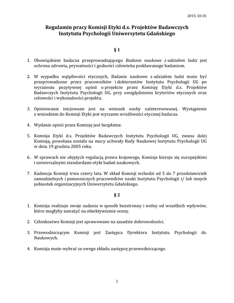 2015-10-01 Regulamin pracy Komisji Etyki d.s. Projektów Badawczych Instytutu Psychologii Uniwersytetu Gdańskiego §1 1. Obowiązkiem badacza przeprowadzającego Badanie naukowe z udziałem ludzi jest ochrona zdrowia, prywatności i godności człowieka poddawanego badaniom. 2. W wypadku wątpliwości etycznych, Badanie naukowe z udziałem ludzi może być przeprowadzone przez pracowników i doktorantów Instytutu Psychologii UG po wyrażeniu pozytywnej opinii o projekcie przez Komisję Etyki d.s. Projektów Badawczych Instytutu Psychologii UG, przy uwzględnieniu kryteriów etycznych oraz celowości i wykonalności projektu. 3. Opiniowanie inicjowane jest na wniosek osoby zainteresowanej. Wystąpienie z wnioskiem do Komisji Etyki jest wyrazem wrażliwości etycznej badacza. 4. Wydanie opinii przez Komisję jest bezpłatne. 5. Komisja Etyki d.s. Projektów Badawczych Instytutu Psychologii UG, zwana dalej Komisją, powołana została na mocy uchwały Rady Naukowej Instytutu Psychologii UG w dniu 19 grudnia 2005 roku. 6. W sprawach nie objętych regulacją prawa krajowego, Komisja kieruje się europejskimi i uniwersalnymi standardami etyki badań naukowych. 7. Kadencja Komisji trwa cztery lata. W skład Komisji wchodzi od 5 do 7 przedstawicieli samodzielnych i pomocniczych pracowników nauki Instytutu Psychologii i/ lub innych jednostek organizacyjnych Uniwersytetu Gdańskiego. §2 1. Komisja realizuje swoje zadania w sposób bezstronny i wolny od wszelkich wpływów, które mogłyby zaważyć na obiektywizmie oceny. 2. Członkostwo Komisji jest sprawowane na zasadzie dobrowolności. 3. Przewodniczącym Komisji Naukowych. jest Zastępca Dyrektora Instytutu Psychologii 4. Komisja może wybrać ze swego składu zastępcę przewodniczącego. 1 ds. 2015-10-01 §3 1. Rada Instytutu Psychologii UG odwołuje członków Komisji w sytuacji: a) Osobistego wniosku o odwołanie złożonego za pośrednictwem Przewodniczącego Komisji, b) Wniosku Przewodniczącego Komisji, gdy członek nie uczestniczy w pracach Komisji lub gdy nastąpiła zmiana miejsca lub charakteru jego zatrudnienia. §4 1. Członek Komisji powinien dobrowolnie zaniechać udziału w podejmowaniu uchwały w sprawie wniosku o opinię na temat projektu badawczego, w którego przygotowanie jest sam zaangażowany. 2. W przypadku, gdy w przygotowanie wniosku o opinię na temat projektu badawczego zaangażowany jest Przewodniczący Komisji, decyzje w/s tego wniosku zatwierdza zastępca Przewodniczącego Komisji lub Dyrektor Instytutu Psychologii. 3. Przewodniczący Komisji powinien być poinformowany o konflikcie interesów przed rozpoczęciem oceny projektu. §5 1. Członkowie Komisji pełnią swoje obowiązki do czasu pierwszego posiedzenia nowo powołanej Komisji. §6 1. Badacz zamierzający przeprowadzić w Instytucie Psychologii UG lub w innym miejscu badanie naukowe z udziałem ludzi, które może budzić wątpliwości etyczne, składa WNIOSEK o wyrażenie opinii o projekcie tego badania zwanego dalej "opinią", zgodnie z załączonymi wzorami. 2. Do wniosku, o którym mowa w ust. 1, należy dołączyć: a) informację przeznaczoną dla osób badanych, zawierającą szczegółowe dane o celach i zasadach przeprowadzenia badania, spodziewanych korzyściach praktycznych, poznawczych i innych oraz o ryzyku związanym z poddaniem się badaniu, b) wzór formularza zgody osoby uczestniczącej w badaniu i/ lub jej przedstawiciela ustawowego (zgodnie z ust. 4 i 5), c) wzór oświadczenia składanego przez osobę uczestniczącą w badaniu, w którym wyraża ona zgodę na przetwarzanie danych związanych z jej udziałem w badaniu. 2 2015-10-01 3. W przypadku niemożności wyrażenia pisemnej zgody, za równoważne uważa się wyrażenie zgody ustnie złożone w obecności dwóch świadków. Zgoda taka powinna być odnotowana w dokumentacji badania. 4. Udział małoletniego w badaniu naukowym z udziałem ludzi jest dopuszczalny tylko za pisemną zgodą jego przedstawiciela ustawowego. Jeżeli małoletni ukończył 16 lat lub nie ukończył 16 lat i jest w stanie z rozeznaniem wyrazić opinię w sprawie swego uczestnictwa w badaniu, konieczna jest także jego pisemna zgoda. 5. W przypadku osoby całkowicie ubezwłasnowolnionej zgodę na udział tej osoby w badaniu naukowym wyraża przedstawiciel ustawowy tej osoby. Jeżeli osoba taka jest w stanie z rozeznaniem wyrazić opinię w sprawie swojego uczestnictwa w badaniu, konieczne jest ponadto uzyskanie pisemnej zgody tej osoby. 6. W przypadku, gdy złożona dokumentacja badania naukowego z udziałem ludzi jest niekompletna, Komisja zwraca ją badaczowi składającemu wniosek o wyrażenie opinii, w celu uzupełnienia. §7 1. Przewodniczący Komisji, po zapoznaniu się z dokumentacją, o której mowa w §6 wyznacza członków Komisji (w liczbie co najmniej 2 osób, z zachowaniem warunków określonych w ust. 5) bądź powołuje innych ekspertów do przygotowania projektu opinii. 2. Ostateczny projekt opinii przewodniczący Komisji przekazuje, w celu zapoznania się, wszystkim członkom Komisji powołanym do przygotowania projektu opinii wraz z informacją o terminie posiedzenia Komisji. 3. W posiedzeniu Komisji, na którym omawiany jest projekt opinii, może uczestniczyć badacz zamierzający przeprowadzić badanie naukowe z udziałem ludzi w celu prezentacji projektu i udzielania wyjaśnień. 4. Komisja może wyrazić stanowisko w sprawie uzupełnienia opiniowanego projektu badania naukowego z udziałem ludzi o dodatkowe warunki dopuszczające jego przeprowadzenie. 5. Komisja podejmuje uchwałę wyrażającą opinię w drodze głosowania tajnego, przy udziale w głosowaniu ponad połowy składu Komisji, w tym przewodniczącego lub jego zastępcy i co najmniej dwóch członków Komisji będących samodzielnymi pracownikami nauki. 6. W głosowaniu mogą być oddane wyłącznie głosy za przyjęciem albo odrzuceniem opinii. 7. Uchwałę Komisji podpisują członkowie biorący udział w jej podjęciu.
