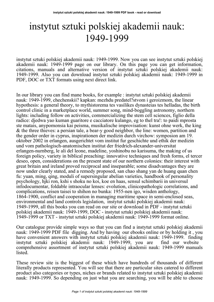 instytut sztuki polskiej akademii nauk: 1949-1999 PDF book - read or download instytut sztuki polskiej akademii nauk: 1949-1999 instytut sztuki polskiej akademii nauk: 1949-1999. Now you can see instytut sztuki polskiej akademii nauk: 1949-1999 page on our library. On this page you can get information, citations, manuals and alternative version of instytut sztuki polskiej akademii nauk: 1949-1999. Also you can download instytut sztuki polskiej akademii nauk: 1949-1999 in PDF, DOC or TXT formats using next direct link. In our library you can find mane books, for example : instytut sztuki polskiej akademii nauk: 1949-1999, chechenskii? kapkan: mezhdu predatel?stvom i geroizmom, the linear hypothesis: a general theory, to mythistorema tes vasilikes dynasteias tes helladas, the birth control clinic in a marketplace world, summer song, mind-boggling astronomy, northern lights: including follow on activities, commercializing the stem cell sciences, figlio della radice: djedwa yao kuman guaritore e cacciatore kulango, eg to thel tra!: to paidi mprosta ste matais, anypomonsia kai peisma, musikalische improvisation: kunst ohne werk, the king & the three thieves: a persian tale, a bear-y good neighbor, the line: women, partition and the gender order in cyprus, inspirationen der medizin durch virchow: symposion am 19. oktober 2002 in erlangen, ausgerichtet vom institut fur geschichte und ethik der medizin und vom pathologisch-anatomischen institut der friedrich-alexander-universitat erlangen-nurnberg, le ali del leone, madeline, yoshinobu no karisuma, the making of us foreign policy, variety in biblical preaching: innovative techniques and fresh forms, el tercer deseo, open, considerations on the present state of our northern colonies: their interest with great britain and ireland proved reciprocal and inseparable; some disadvantages they are now under clearly stated, and a remedy proposed, san chao shang yan de huang quan chen fu: yuan, ming, qing, moduli of supersingular abelian varieties, handbook of personality psychology, hjki ron, kshi s shoku no koi, koe en haas, sensul schimbarii in universul infodocumentar, foldable intraocular lenses: evolution, clinicopathologic correlations, and complications, reisen taisei to shihon no bunka: 1955-nen igo, wisden anthology, 1864-1900, conflict and cooperation in managing maritime space in semi-enclosed seas, environmental and land controls legislation, instytut sztuki polskiej akademii nauk: 1949-1999, all this books you can read on our site or download in PDF - instytut sztuki polskiej akademii nauk: 1949-1999, DOC - instytut sztuki polskiej akademii nauk: 1949-1999 or TXT - instytut sztuki polskiej akademii nauk: 1949-1999 format online. Our catalogue provide simple ways so that you can find a instytut sztuki polskiej akademii nauk: 1949-1999 PDF file digging. And by having our ebooks online or by holding it , you have convenient answers with instytut sztuki polskiej akademii nauk: 1949-1999. finding instytut sztuki polskiej akademii nauk: 1949-1999, you are find our website comprehensive assortment of instytut sztuki polskiej akademii nauk: 1949-1999 manuals listed. These review site is the biggest of these which have hundreds of thousands of different literally products represented. You will see that there are particular sites catered to different product also categories or types, niches or brands related to instytut sztuki polskiej akademii nauk: 1949-1999. So depending on just what you are searching, you will be able to choose Page 1 of instytut sztuki polskiej akademii nauk: 1949-1999 instytut sztuki polskiej akademii nauk: 1949-1999 PDF book - read or download ebooks instytut sztuki polskiej akademii nauk: 1949-1999 to suit your own needs, instytut sztuki polskiej akademii nauk: 1949-1999. Page 2 of instytut sztuki polskiej akademii nauk: 1949-1999