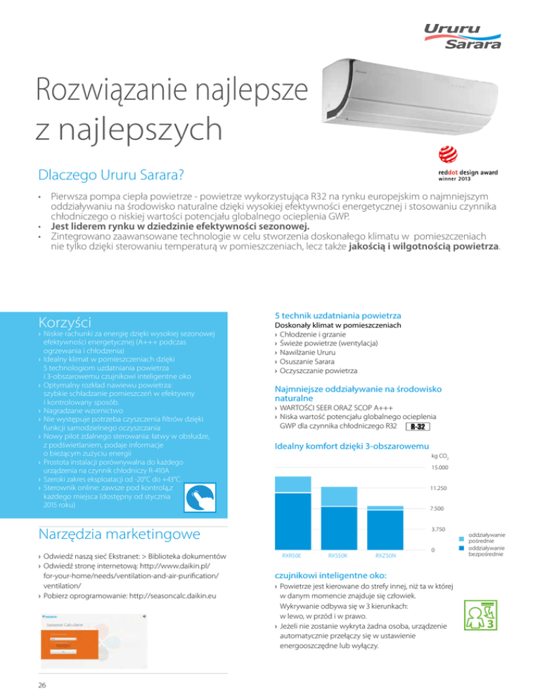 Rozwiązanie najlepsze z najlepszych Dlaczego Ururu Sarara? • Pierwsza pompa ciepła powietrze - powietrze wykorzystująca R32 na rynku europejskim o najmniejszym oddziaływaniu na środowisko naturalne dzięki wysokiej efektywności energetycznej i stosowaniu czynnika chłodniczego o niskiej wartości potencjału globalnego ocieplenia GWP. • Jest liderem rynku w dziedzinie efektywności sezonowej. • Zintegrowano zaawansowane technologie w celu stworzenia doskonałego klimatu w pomieszczeniach nie tylko dzięki sterowaniu temperaturą w pomieszczeniach, lecz także jakością i wilgotnością powietrza. Korzyści ›› Niskie rachunki za energię dzięki wysokiej sezonowej efektywności energetycznej (A+++ podczas ogrzewania i chłodzenia) ›› Idealny klimat w pomieszczeniach dzięki 5 technologiom uzdatniania powietrza i 3-obszarowemu czujnikowi inteligentne oko ›› Optymalny rozkład nawiewu powietrza: szybkie schładzanie pomieszczeń w efektywny i kontrolowany sposób. ›› Nagradzane wzornictwo ›› Nie występuje potrzeba czyszczenia filtrów dzięki funkcji samodzielnego oczyszczania ›› Nowy pilot zdalnego sterowania: łatwy w obsłudze, z podświetlaniem, podaje informacje o bieżącym zużyciu energii ›› Prostota instalacji porównywalna do każdego urządzenia na czynnik chłodniczy R-410A ›› Szeroki zakres eksploatacji od -20°C do +43°C. ›› Sterownik online: zawsze pod kontrolą,z każdego miejsca (dostępny od stycznia 2015 roku) 5 technik uzdatniania powietrza Doskonały klimat w pomieszczeniach ›› Chłodzenie i grzanie ›› Świeże powietrze (wentylacja) ›› Nawilżanie Ururu ›› Osuszanie Sarara ›› Oczyszczanie powietrza Najmniejsze oddziaływanie na środowisko naturalne ›› WARTOŚCI SEER ORAZ SCOP A+++ ›› Niska wartość potencjału globalnego ocieplenia GWP dla czynnika chłodniczego R32 Idealny komfort dzięki 3-obszarowemu kg CO2 15.000 11.250 7.500 Narzędzia marketingowe ›› Odwiedź naszą sieć Ekstranet: > Biblioteka dokumentów ›› Odwiedź stronę internetową: http://www.daikin.pl/ for-your-home/needs/ventilation-and-air-purification/ ventilation/ ›› Pobierz oprogramowanie: http://seasoncalc.daikin.eu 26 3.750 RXR50E RXS50K RXZ50N 0 oddziaływanie pośrednie oddziaływanie bezpośrednie czujnikowi inteligentne oko: ›› Powietrze jest kierowane do strefy innej, niż ta w której w danym momencie znajduje się człowiek. Wykrywanie odbywa się w 3 kierunkach: w lewo, w przód i w prawo. ›› Jeżeli nie zostanie wykryta żadna osoba, urządzenie automatycznie przełączy się w ustawienie energooszczędne lub wyłączy. 3 FTXZ-N + RXZ-N Jednostka naścienna Kompletna kontrola klimatu - z osuszaniem/nawilżaniem, oczyszczaniem powietrza i wentylacją z najwyższym współczynnikiem efektywności w trybie grzania i chłodzenia ʯʯ SEER + SCOP = A+++ w całym zakresie ʯʯ Unikalne połączenie nawilżania, osuszania, wentylacji, oczyszczania powietrza oraz ogrzewania i chłodzenia w 1 systemie ʯʯ 3-obszarowy czujnik inteligentne oko: powietrze jest kierowane do strefy innej, niż ta w której w danej chwili znajduje się człowiek. Wykrywanie odbywa się w 3 kierunkach: w lewo, w przód i w prawo. Jeżeli nie zostanie wykryta żadna osoba, urządzenie automatycznie przełączy się w ustawienie energooszczędne ʯʯ Nie występuje potrzeba ręcznego czyszczenia filtrów ʯʯ Zdobywca nagrody „Reddot design award” w roku 2013 FTXZ-N RXZ-N Dane dotyczące efektywności Wydajność chłodnicza Min./Nom./Maks. Wydajność grzewcza Min./Nom./Maks. Pobór mocy Chłodzenie Grzanie Chłodzenie Efektywność sezonowa (wg EN14825) Efektywność nominalna FTXZ + RXZ kW kW Min./Nom./Maks. kW Min./Nom./Maks. kW Etykieta energetyczna Pdesign kW SEER Roczne zużycie energii kWh Etykieta energetyczna Pdesign kW SCOP Roczne zużycie energii kWh Ogrzewanie (przeciętne warunki klimatyczne) EER COP Roczne zużycie energii kWh Etykieta energetyczna Chłodzenie/Ogrzewanie Jednostka wewnętrzna FTXZ Obudowa Kolor Wymiary Jednostka Wys. x Szer. x Głęb. mm Ciężar Jednostka kg Filtr powietrza Typ Natężenie przepł. Chłodzenie Wys./Nom./Nis./Cicha praca m³/min pow. przez wentylator Grzanie Wys./Nom./Nis./Cicha praca m³/min Poziom mocy Chłodzenie dBA akustycznej Grzanie dBA Wys./Nom./Nis./Cicha praca dBA Poziom ciśnienia Chłodzenie akustycznego Wys./Nom./Nis./Cicha praca dBA Grzanie Zasilanie Liczba faz/Częstotliwość/Napięcie Hz/V Systemy sterowania Zdalny sterownik pracujący w podczerwieni Jednostka zewnętrzna RXZ Wymiary Jednostka Wys. x Szer. x Głęb. mm Ciężar Jednostka kg Poziom mocy Chłodzenie dBA akustycznej Grzanie dBA Poziom ciśnienia Chłodzenie Wysoki dBA akustycznego Grzanie Wysoki dBA Temp. zewn. Min.~Maks. °CDB Zakres pracy Chłodzenie Temp. zewn. Min.~Maks. °CWB Grzanie Czynnik chłodniczy Typ/Ilość/GWP kg Ilość TCO2Eq Połączenia Ciecz Śr. zewn. mm instalacji rurowej Gaz Śr. zewn. mm Długość inst. rurowej JZ-JW Maks. m Różnice poziomów JW- JZ Maks. m Zasilanie Liczba faz/Częstotliwość/Napięcie Hz/V Maksymalne amperaże bezpiecznika (MFA) A Prąd - 50Hz 25N + 25N 0,6/2,5/3,9 0,6/3,6/7,5 0,11/0,41/0,88 0,10/0,62/2,01 2,50 9,54 92 3,50 5,90 831 6,10 5,80 205 25N 10,7/7,5/5,3/4,0 11,7/8,6/6,7/4,8 54 56 38/33/26/19 39/35/28/19 25N 59 59 46 46 ARC477A1 35N + 35N 0,6/3,5/5,3 0,6/5,0/9,0 0,11/0,66/1,33 0,10/1,00/2,53 A+++ 3,50 9,00 136 A+++ 4,50 5,73 1.100 5,30 5,00 330 A/A 50N + 50N 0,6/5,0/5,8 0,6/6,3/9,4 0,11/1,10/1,60 0,10/1,41/2,64 35N Biały 295x798x372 15 Filtr z funkcją automatycznego czyszczenia 12,1/8,4/5,6/4,0 13,3/9,2/6,9/4,8 57 57 42/35/27/19 42/36/29/19 1~ / 50 / 220-240 ARC477A1 50N 35N 693x795x300 50 61 61 48 48 -10~43 -20~18 R-32 / 1,34 / 675 0,9 6 9,5 10 8 1~ / 50 / 220-240 16 5,00 8,60 203 5,60 5,50 1.427 4,55 4,47 550 15,0/9,2/6,6/4,6 14,4/10,7/7,7/5,9 60 59 47/38/30/23 44/38/31/24 50N 63 64 49 50 (1) EER/COP wg Eurovent 2012 do użytku wy