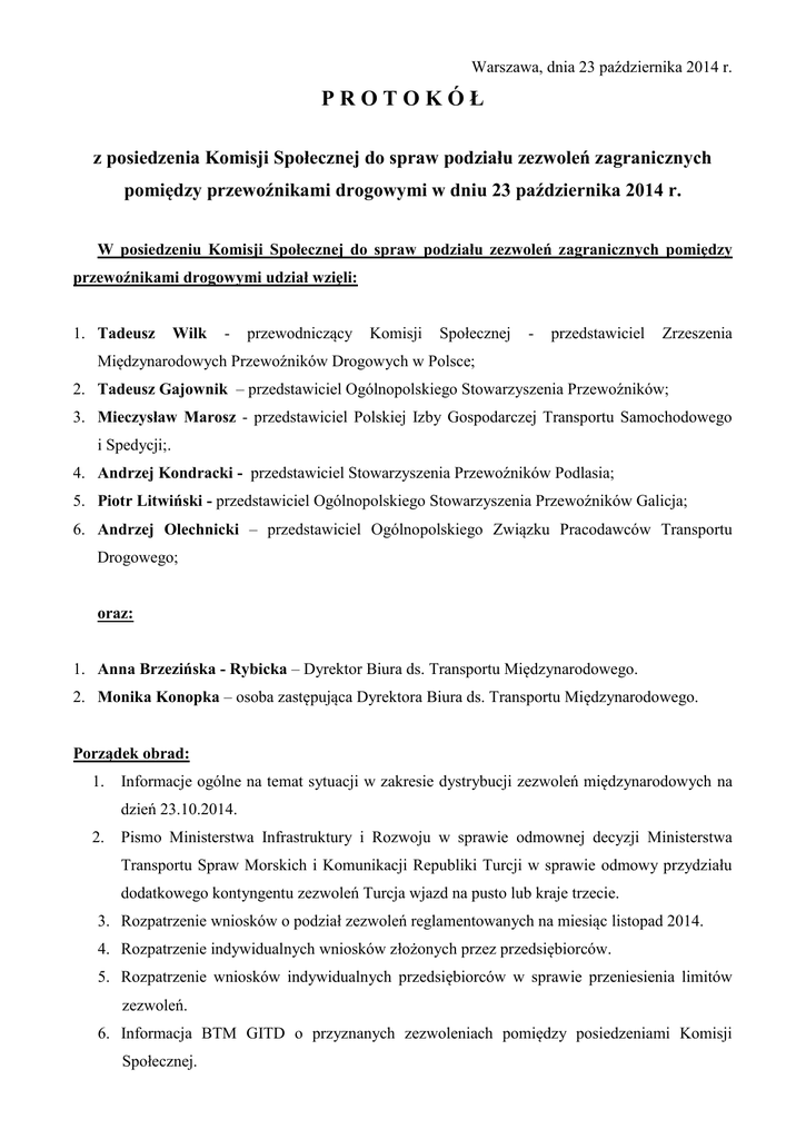 Warszawa, dnia 23 października 2014 r. PROTOKÓŁ z posiedzenia Komisji Społecznej do spraw podziału zezwoleń zagranicznych pomiędzy przewoźnikami drogowymi w dniu 23 października 2014 r. W posiedzeniu Komisji Społecznej do spraw podziału zezwoleń zagranicznych pomiędzy przewoźnikami drogowymi udział wzięli: 1. Tadeusz Wilk - przewodniczący Komisji Społecznej - przedstawiciel Zrzeszenia Międzynarodowych Przewoźników Drogowych w Polsce; 2. Tadeusz Gajownik – przedstawiciel Ogólnopolskiego Stowarzyszenia Przewoźników; 3. Mieczysław Marosz - przedstawiciel Polskiej Izby Gospodarczej Transportu Samochodowego i Spedycji;. 4. Andrzej Kondracki - przedstawiciel Stowarzyszenia Przewoźników Podlasia; 5. Piotr Litwiński - przedstawiciel Ogólnopolskiego Stowarzyszenia Przewoźników Galicja; 6. Andrzej Olechnicki – przedstawiciel Ogólnopolskiego Związku Pracodawców Transportu Drogowego; oraz: 1. Anna Brzezińska - Rybicka – Dyrektor Biura ds. Transportu Międzynarodowego. 2. Monika Konopka – osoba zastępująca Dyrektora Biura ds. Transportu Międzynarodowego. Porządek obrad: 1. Informacje ogólne na temat sytuacji w zakresie dystrybucji zezwoleń międzynarodowych na dzień 23.10.2014. 2. Pismo Ministerstwa Infrastruktury i Rozwoju w sprawie odmownej decyzji Ministerstwa Transportu Spraw Morskich i Komunikacji Republiki Turcji w sprawie odmowy przydziału dodatkowego kontyngentu zezwoleń Turcja wjazd na pusto lub kraje trzecie. 3. Rozpatrzenie wniosków o podział zezwoleń reglamentowanych na miesiąc listopad 2014. 4. Rozpatrzenie indywidualnych wniosków złożonych przez przedsiębiorców. 5. Rozpatrzenie wniosków indywidualnych przedsiębiorców w sprawie przeniesienia limitów zezwoleń. 6. Informacja BTM GITD o przyznanych zezwoleniach pomiędzy posiedzeniami Komisji Społecznej. 7. Bilans rozdziału zezwoleń EKMT i informacja BTM o wydaniu tych zezwoleń na dzień 23 października 2014 r. 8. Sprawy różne. Ad.1 Na postawie analizy wykorzystania zezwoleń zagranicznych z 2014 roku, Komisja wnioskuje o podjęcie działań w zakresie zwiększenia kontyngentów na 2014 r., następujących rodzajów zezwoleń: Kazachstan kr.3 Kazachstan ogólne Serbia kr.3 Turcja wjazd na pusto lub kr.3 Uzbekistan kr.3 Węgry kr.3 Ad.2 Przewodniczący komisji zapoznał członków komisji z pismem Ministerstwa Transportu Spraw Morskich i Komunikacji Republiki Turcji w sprawie odmowy przydziału dodatkowego kontyngentu zezwoleń Turcja wjazd na pusto lub kraje trzecie. Pismo jest odpowiedzią na wystąpienie Ministerstwa Infrastruktury i Rozwoju z dnia 10 sierpnia br., w sprawie przydziału dodatkowych zezwoleń na 2014 r. Ad.3 Podstawą przyznania zezwoleń w limicie dodatkowym na miesiąc listopad jest: - poprawne wykorzystanie limitu zezwoleń przyznanych na rok 2014 proporcjonalnie do upływu roku, tj. 10/12 limitu, zwróconych do dnia 20 października br.: Armenia ogólne Zezwolenia przydziela się po 1 szt. dla przedsiębiorcy. Azerbejdżan kraje 3 Zezwolenia przydziela się po 1 szt. dla przedsiębiorcy. Białoruś kraje 3 Zezwolenia przydziela się po 3 szt. dla przedsiębiorcy, ale nie więcej niż wnioskował, liczba przydzielonych zezwoleń nie może być wyższa od liczby wypisów (uprawnionych pojazdów). Bułgaria kraje 3 Zezwolenia przydziela się zgodnie z wnioskiem. Chorwacja kraje 3 Zezwolenia przydziela się zgodnie z wnioskiem. Czarnogóra kraje 3 Zezwolenia przydziela się zgodnie z wnioskiem. Gruzja ogólne Zezwolenia przydziela się zgodnie z wnioskiem, liczba przydzielonych zezwoleń nie może być wyższa od liczby wypisów (uprawnionych pojazdów). Kazachstan ogólne zezwolenia przydziela się przedsiębiorcom, którzy w 2014 r. pobrali i poprawnie wykorzystali co najmniej 57% zezwoleń KZ ogólne; przedsiębiorca otrzymuje 1/9 zwróconych do dnia 21.10.2014 r. i poprawnie wykorzystanych zezwoleń, jednak nie mniej niż 1 szt. i nie więcej niż wnioskował. pobrał i poprawnie wykorzystał co najmniej 4 szt. zezwoleń KZ ogólne Kazachstan kraje 3 zezwolenia przydziela się przedsiębiorcom, którzy w 2014 r. pobrali i poprawnie wykorzystali co najmniej 86% zezwoleń KZ kraje trzecie; przedsiębiorca otrzymuje 1/9 zwróconych do dnia 21.10.2014 r. i poprawnie wykorzystanych zezwoleń, jednak nie mniej niż 1 szt. i nie więcej niż wnioskował. pobrał i poprawnie wykorzystał co najmniej 10 szt. zezwoleń KZ kr.3 Jednocześnie Komisja informuje, iż pula kazachstańskich zezwoleń uległa wyczerpaniu i wnioski nie będą rozpatrywane w następnym miesiącu. Kirgistan kraje 3 Zezwolenia przydziela się zgodnie z wnioskiem. Litwa kraje 3 Zezwolenia przydziela się zgodnie z wnioskiem. Rosja kraje 3 Zezwolenie przydzielone zostały według poniższych kryteriów: 2 sztuki na pierwszych 5 pojazdów uprawnionych, jedna sztuka na każdy kolejny 5 pojazd uprawniony, jednakże nie więcej niż 15 szt. na przedsiębiorcę, przedsiębiorca nie może otrzymać zezwoleń w liczbie większej od wnioskowanej. Zezwolenia w ramach limitów dodatkowych otrzymają wyłącznie przedsiębiorcy, którzy posiadają licencję na wykonywanie mtd rzeczy powyżej jednego roku (licząc od daty odebrania licencji). Serbia kraje 3 Z uwagi na wyczerpanie kontyngentu zezwoleń na rok 2014, zezwolenia nie będą przydzielane w kolejnym miesiącu. Szwecja kraje 3 EURO 0 Zezwolenia przydziela się zgodnie z wnioskiem. Tadżykistan ogólne Zezwolenia przydziela się po 3 szt. dla przedsiębiorcy, ale nie więcej niż wnioskował. Tadżykistan kraje 3 Zezwolenia przydziela się po 3 szt. dla przedsiębiorcy, ale nie więcej niż wnioskował. Uzbekistan ogólne zezwolenia przydziela się po 1 szt., przedsiębiorcom, którzy w 2014 r. pobrali co najmniej 3 zezwolenia i mają na stanie nie więcej niż 2 zezwolenia. Z uwagi na wyczerpanie kontyngentu zezwoleń na rok 2014, zezwolenia nie będą przydzielane w kolejnym miesiącu. Uzbekistan dwustronne/tranzytowe Zezwolenia przydziel