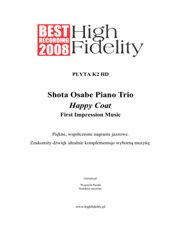 PŁYTA K2 HD Shota Osabe Piano Trio Happy Coat First Impression Music Piękne, współczesne nagranie jazzowe. Znakomity dźwięk idealnie komplementuje wyborną muzykę. Gratulacje! Wojciech Pacuła Redaktor naczelny www.highfidelity.pl
