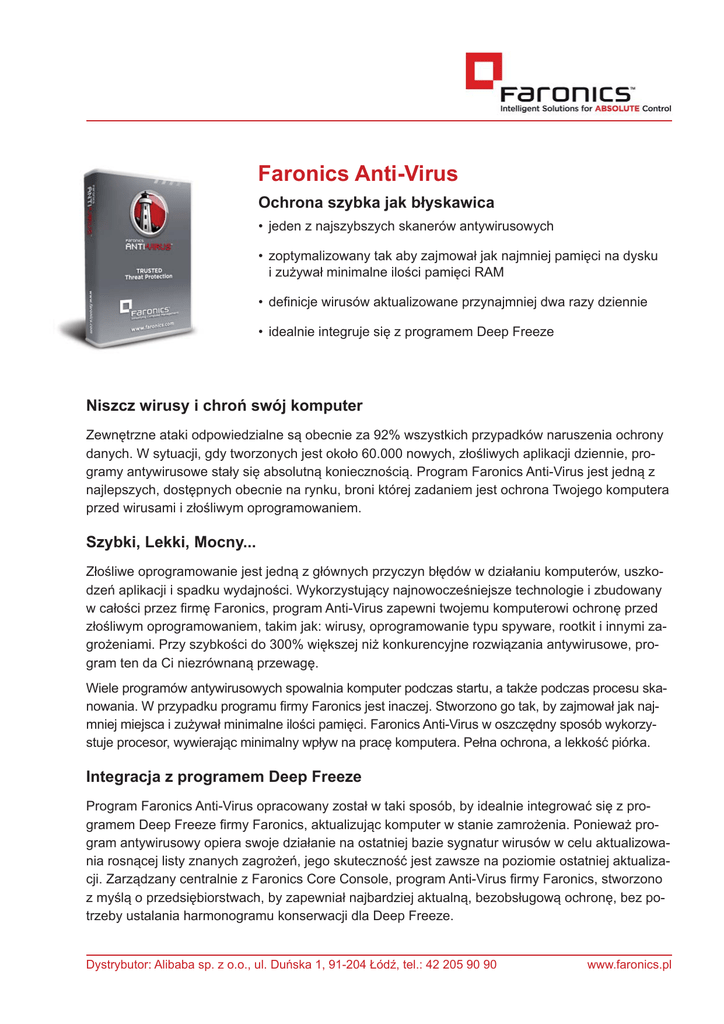 Faronics Anti-Virus Ochrona szybka jak błyskawica • jeden z najszybszych skanerów antywirusowych • zoptymalizowany tak aby zajmował jak najmniej pamięci na dysku i zużywał minimalne ilości pamięci RAM • definicje wirusów aktualizowane przynajmniej dwa razy dziennie • idealnie integruje się z programem Deep Freeze Niszcz wirusy i chroń swój komputer Zewnętrzne ataki odpowiedzialne są obecnie za 92% wszystkich przypadków naruszenia ochrony danych. W sytuacji, gdy tworzonych jest około 60.000 nowych, złośliwych aplikacji dziennie, programy antywirusowe stały się absolutną koniecznością. Program Faronics Anti-Virus jest jedną z najlepszych, dostępnych obecnie na rynku, broni której zadaniem jest ochrona Twojego komputera przed wirusami i złośliwym oprogramowaniem. Szybki, Lekki, Mocny... Złośliwe oprogramowanie jest jedną z głównych przyczyn błędów w działaniu komputerów, uszkodzeń aplikacji i spadku wydajności. Wykorzystujący najnowocześniejsze technologie i zbudowany w całości przez firmę Faronics, program Anti-Virus zapewni twojemu komputerowi ochronę przed złośliwym oprogramowaniem, takim jak: wirusy, oprogramowanie typu spyware, rootkit i innymi zagrożeniami. Przy szybkości do 300% większej niż konkurencyjne rozwiązania antywirusowe, program ten da Ci niezrównaną przewagę. Wiele programów antywirusowych spowalnia komputer podczas startu, a także podczas procesu skanowania. W przypadku programu firmy Faronics jest inaczej. Stworzono go tak, by zajmował jak najmniej miejsca i zużywał minimalne ilości pamięci. Faronics Anti-Virus w oszczędny sposób wykorzystuje procesor, wywierając minimalny wpływ na pracę komputera. Pełna ochrona, a lekkość piórka. Integracja z programem Deep Freeze Program Faronics Anti-Virus opracowany został w taki sposób, by idealnie integrować się z programem Deep Freeze firmy Faronics, aktualizując komputer w stanie zamrożenia. Ponieważ program antywirusowy opiera swoje działanie na ostatniej bazie sygnatur wirusów w celu aktualizowania rosnącej listy znanych zagrożeń, jego skuteczność jest zawsze na poziomie ostatniej aktualizacji. Zarządzany centralnie z Faronics Core Console, program Anti-Virus firmy Faronics, stworzono z myślą o przedsiębiorstwach, by zapewniał najbardziej aktualną, bezobsługową ochronę, bez potrzeby ustalania harmonogramu konserwacji dla Deep Freeze. Dystrybutor: Alibaba sp. z o.o., ul. Duńska 1, 91-204 Łódź, tel.: 42 205 90 90 www.faronics.pl Faronics Anti-Virus Warstwowe podejście do ochrony W chwili obecnej poleganie na jednej tylko metodzie ochrony nie jest już bezpieczne. Warstwowe podejście do ochrony oferowane przez firmę Faronics, zabezpiecza przed wieloma poziomami potencjalnych zagrożeń na jednej centralnej konsoli i zapewnia Ci spokój i wygodę, jaką dać może jedynie najwyższej klasy system bezpieczeństwa. Anti-Virus firmy Faronics chroni Cię przed zagrożeniami bez negatywnego wpływu na działanie systemu, a doskonała integracja z Deep Freeze sprawi, że przy następnym restarcie wszystkie komputery w twojej firmie będą chronione przed przypadkowym lub celowym uszkodzeniem. Program Anti-Executable firmy Faronics chroni użytkowników w trakcie pracy i zezwala na korzystanie jedynie z zaakceptowanych aplikacji, zapewniając tym samym pełną ochronę twojego biznesu. Podstawowe funkcje • zaawansowana technologia zwalczania oprogramowania typu rootkit • wysoka szybkość skanowania plików • co najmniej dwie aktualizacje definicji dziennie • urządzenia podłączane przez USB skanowane w chwili połączenia • scentralizowane zasady określają harmonogramy konfiguracji i skanowania dla stacji roboczych • Faronics Core, bezpieczną platformę zarządzania ochroną antywirusową (aktualizacje bazy wirusów oraz silnika programu) w całej firmie Dystrybutor: Alibaba sp. z o.o., ul. Duńska 1, 91-204 Łódź, tel.: 42 205 90 90 www.faronics.pl